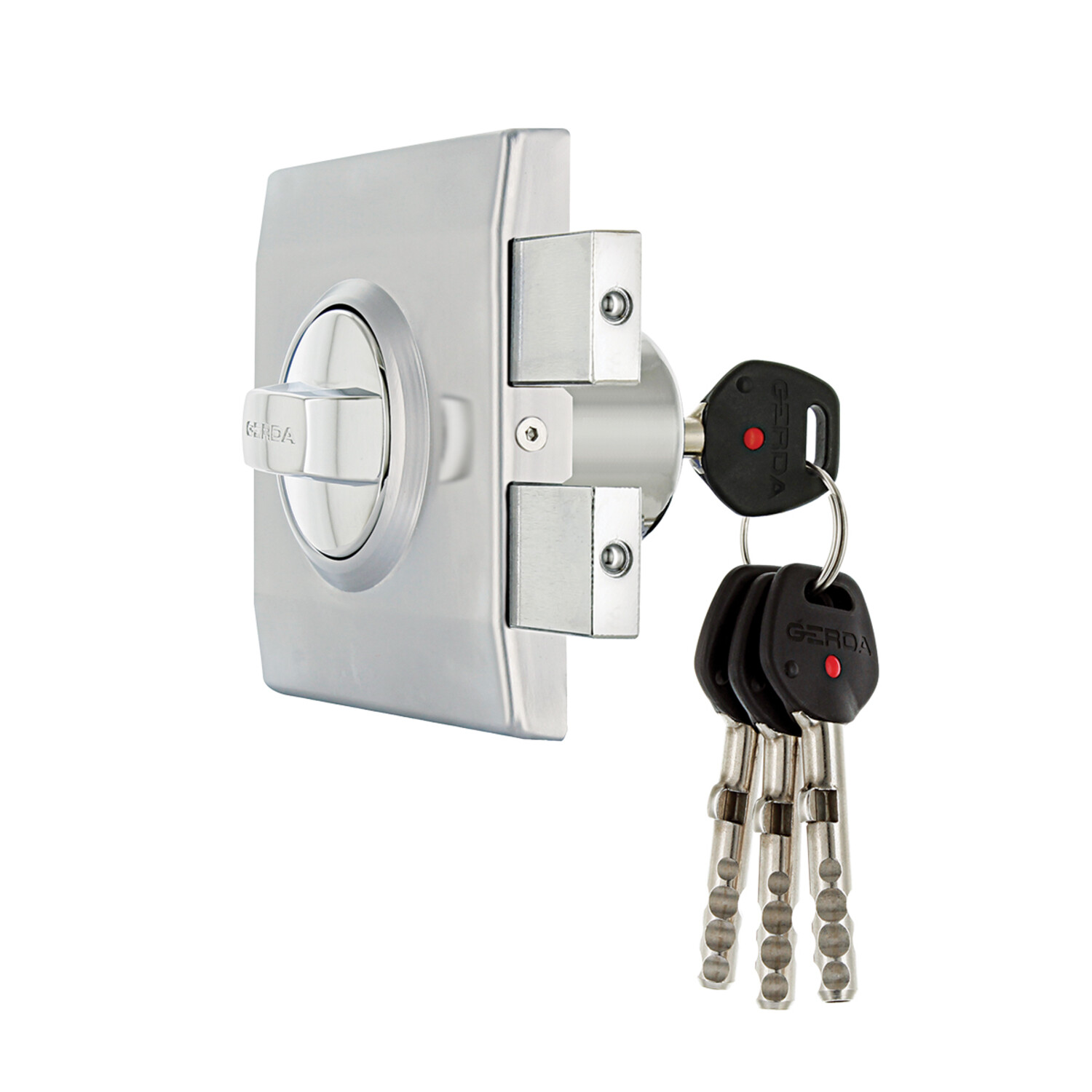 The GERDA N200 Rim Lock is a surface mounted lock which incorporates a unique door limiter feature that reduces the risk of forced entry. The door limiter is incredibly strong, but can be released with a key from the outside.