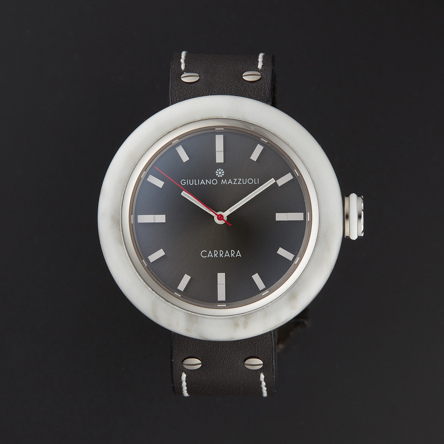 The Giuliano Mazzuoli Carrara Marble Automatic is a rare treat, defined by its case, which is made of fine Italian Carrara marble. It's outfitted with a Swiss made self-winding automatic movement; an ETA 2824/2 with Incabloc anti-shock system, to be specific, featuring 25 jewels at 28,800 beats per hour, and a 40 hour power reserve.