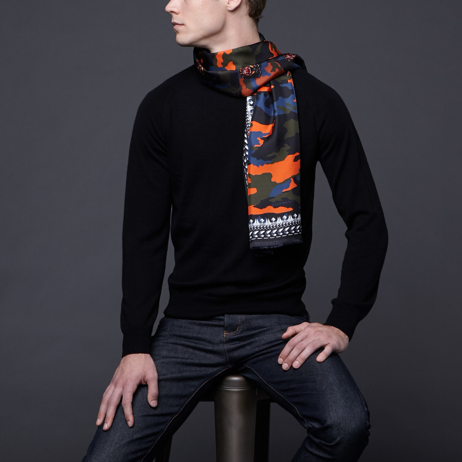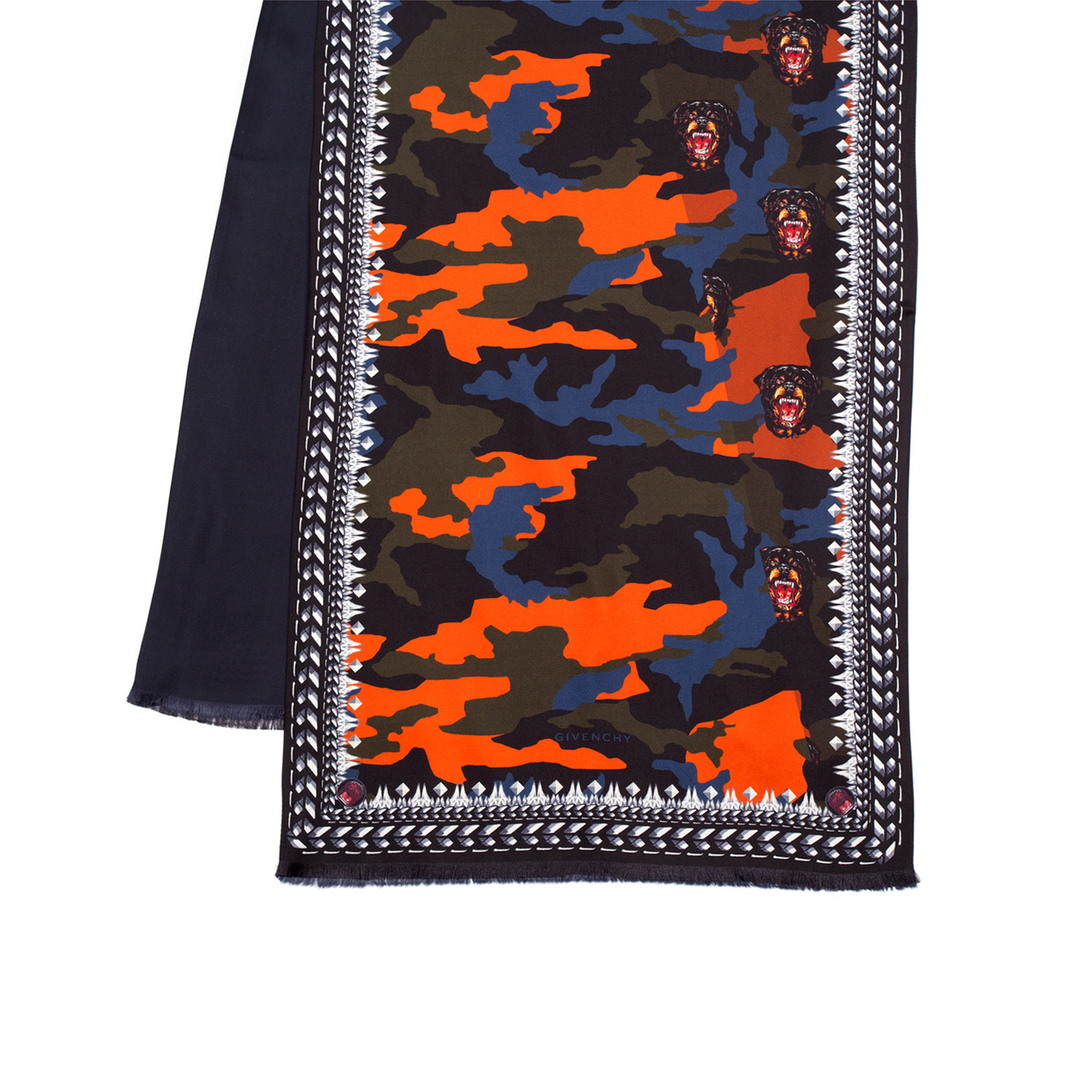With animal, spiritual, urban, floral, geometric, and the darkly romantic all intersecting into one dizzying line of designs, Printed Double Face Rottweiler Camo is a perfect representation of Givenchy's fabled aesthetic, updated for a new generation. The couture clashing of new colors and classical prints is a look that Givenchy made luxe in the first place, with each scarf being transformed into a wearable work of art.