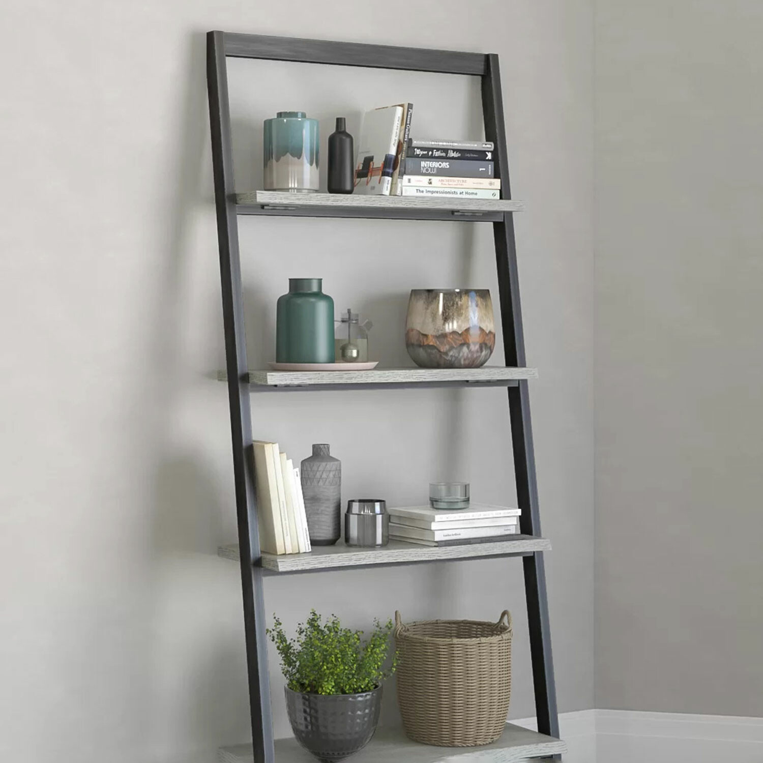 The natural aesthetics of an oak wood surface is combined with the industrial elegance of a steel structure in this conveniently sized bookshelf. Distinctive and outspoken in design with a practical multi-tiered ladder construction, the desk works equally well to store books in an office room or library, or display your prized collectibles in the entryway or living room.