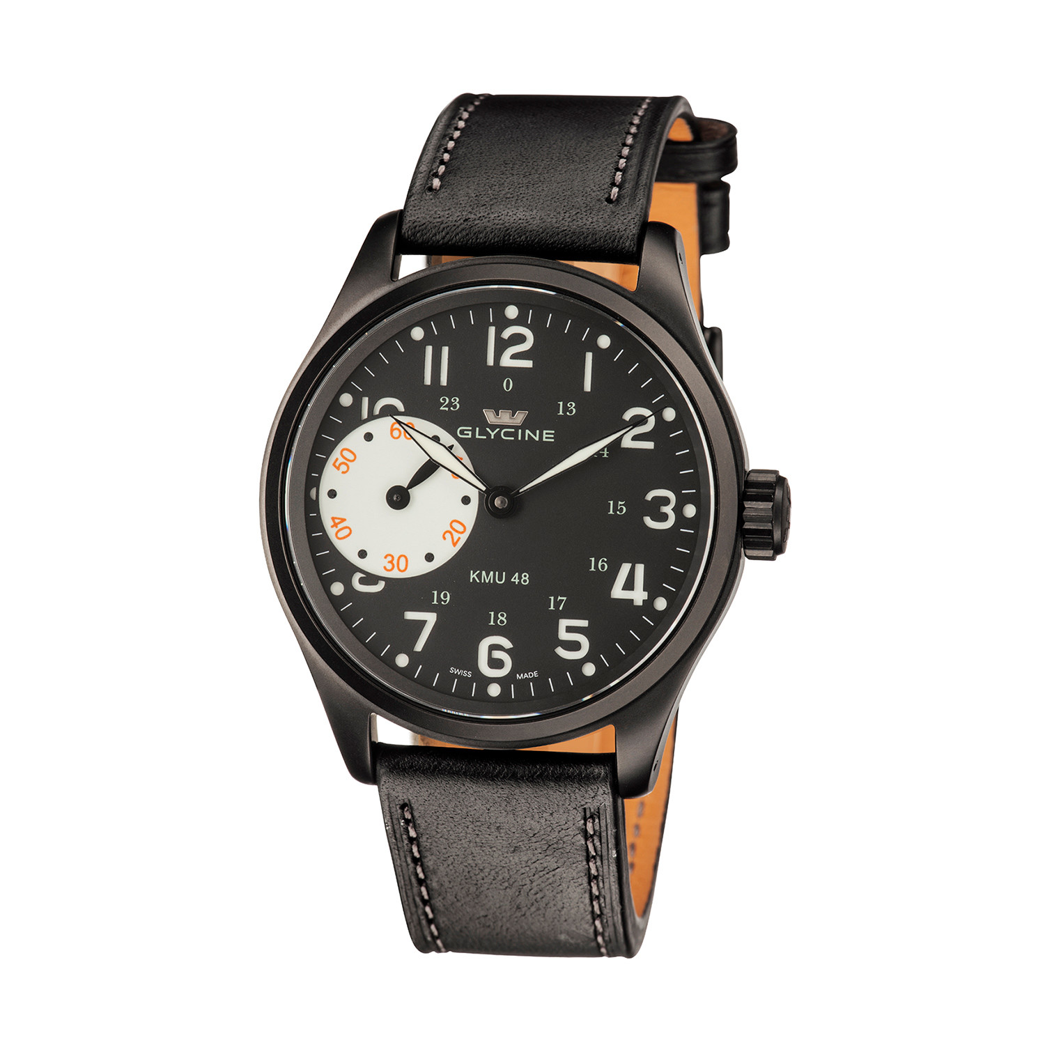 This Glycine KMU48 Manual Wind is sure to impress with its elegant, modern and charming design. This Swiss watch is presented in a black sandblasted PVD coated stainless steel case, on a black genuine leather strap with a black PVD coated steel buckle, and includes details such as its luminous Arabic numeral and dot hour markers, and a big seconds sub-dial. A superior anti-reflective scratch resistant sapphire crystal protects the dial, and a transparent smoked glass case back contains its Swiss manual wind movement, with a caliber ETA 6498-1, 17 Jewels, and a power reserve of 46 hours.