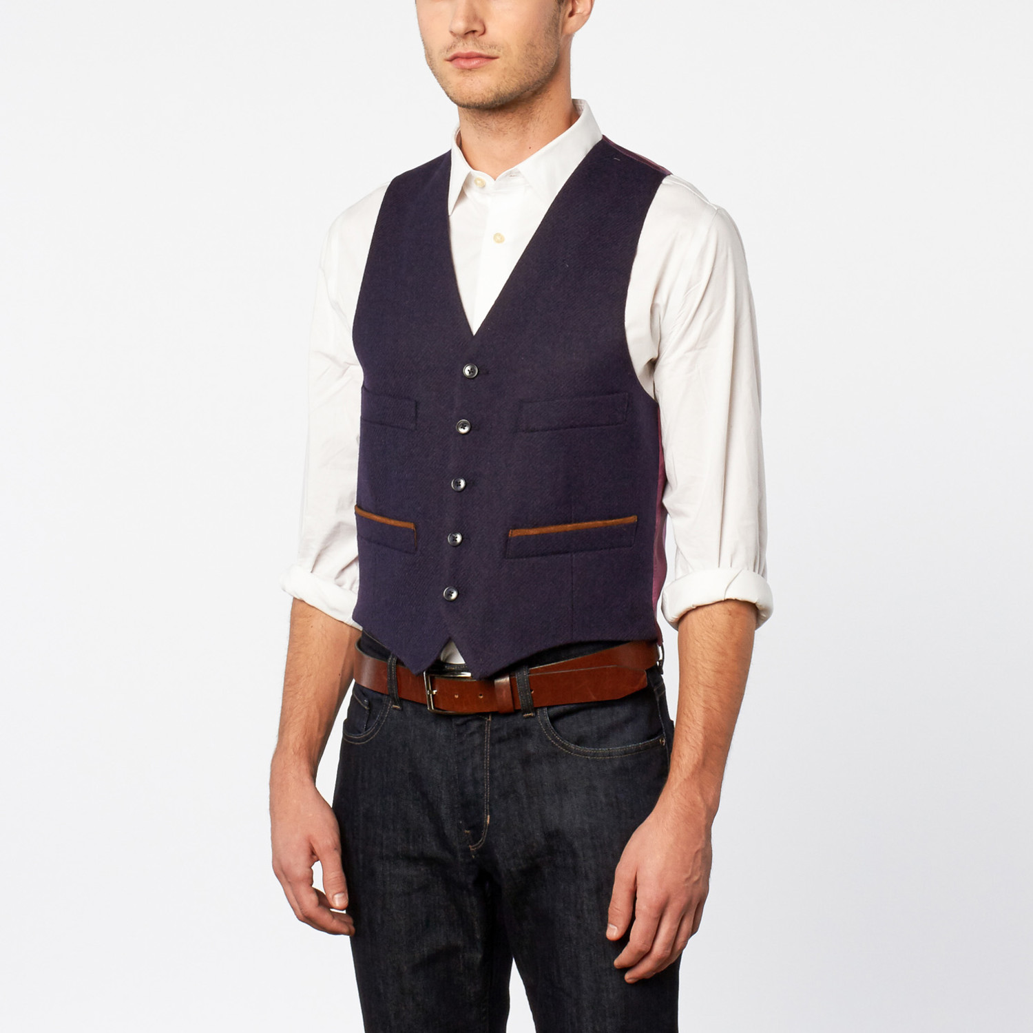 A waistcoat is a perfect complement for any jacket. This Harvie Waistcoat is an extravagant version tailored from the finest British wool. With a decadently heavy two tone satin lining and backer and a branded Goodwin Smith-embossed leather badge, it's a mark of authority and quality.