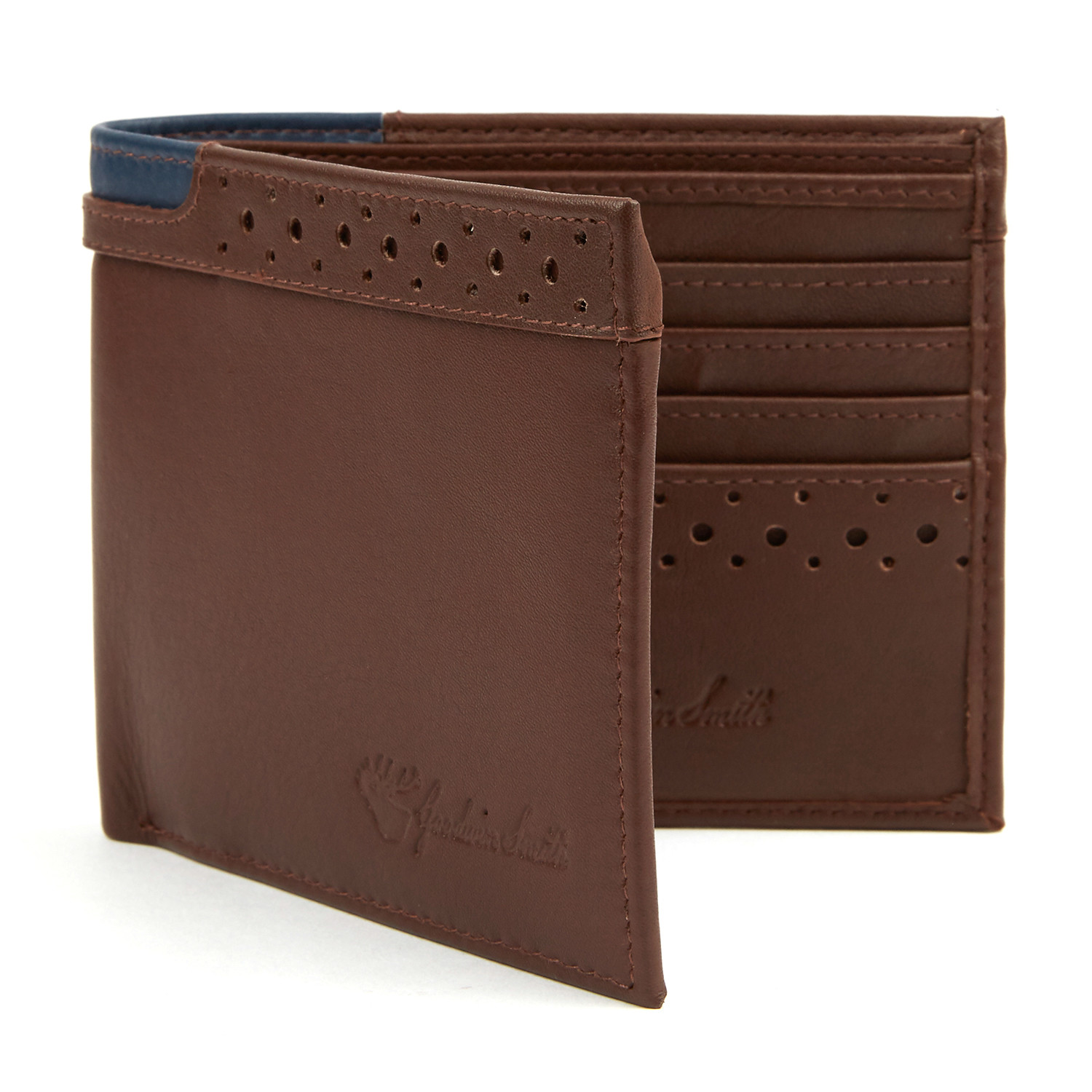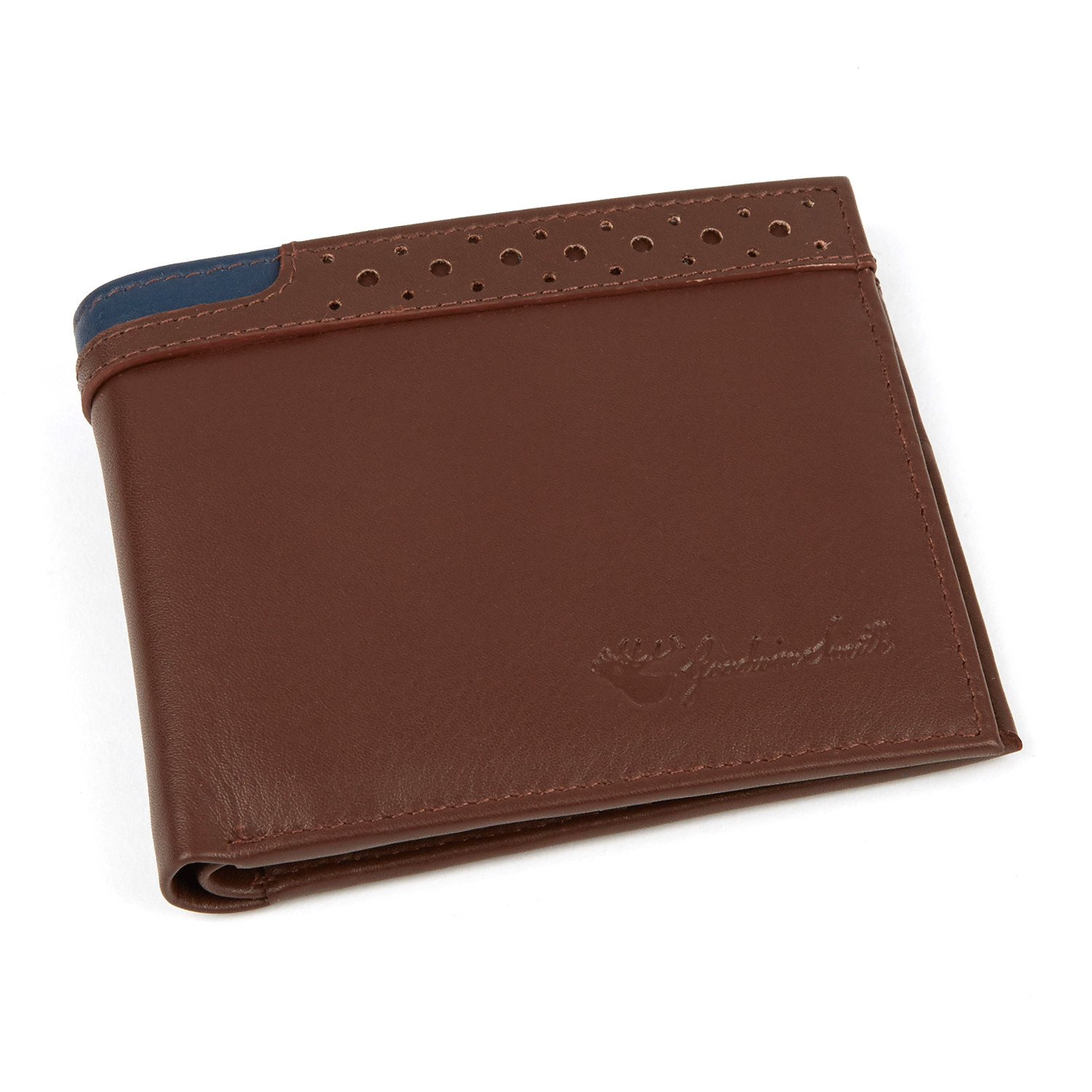 The Johnny Brown Leather Wallet features premium quality leather throughout, with a unique perforated design and navy highlights. The lining features a bold, repeating print of Goodwin Smith's iconic stag logo.