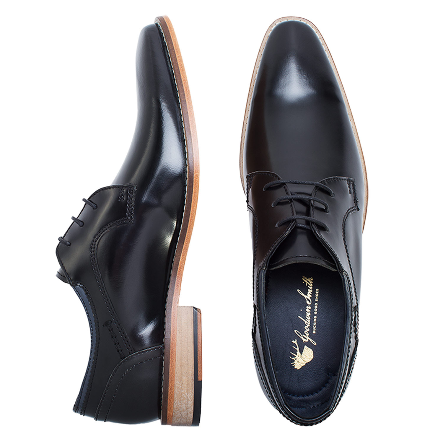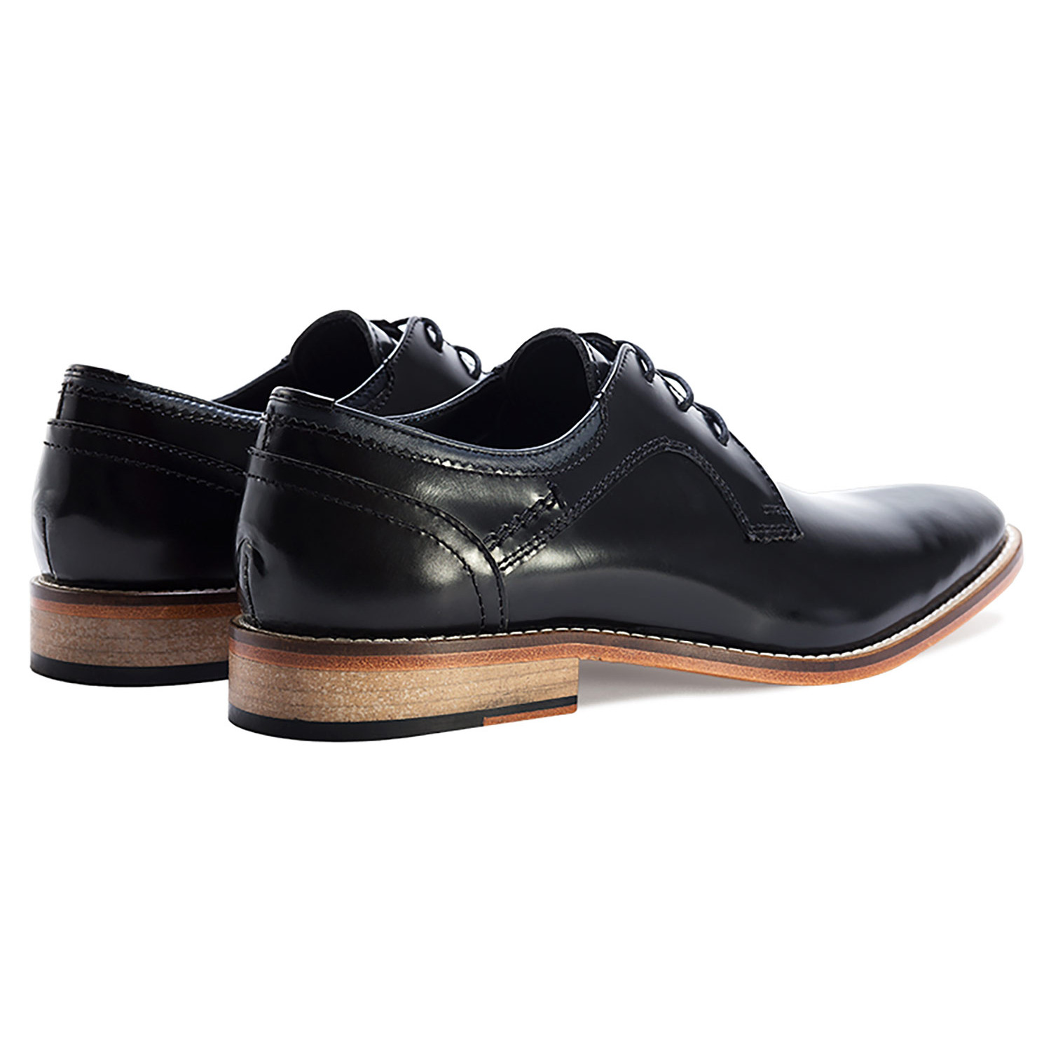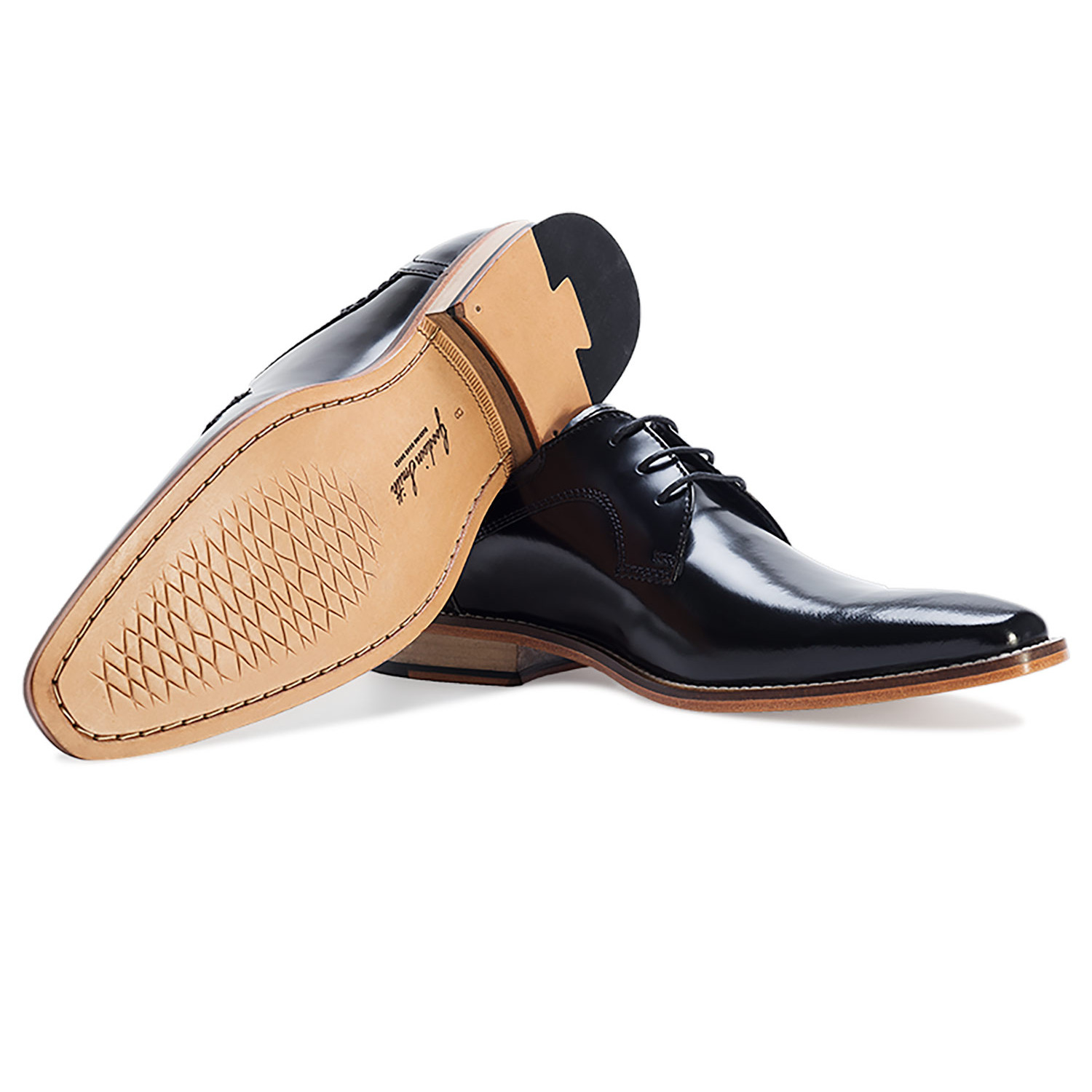 The Hurst Patent Derby can be worn with tuxes and jeans alike. This elongated, plain-toe formal shoe keeps it pared-down to bring out the linearity of its fine stitching.