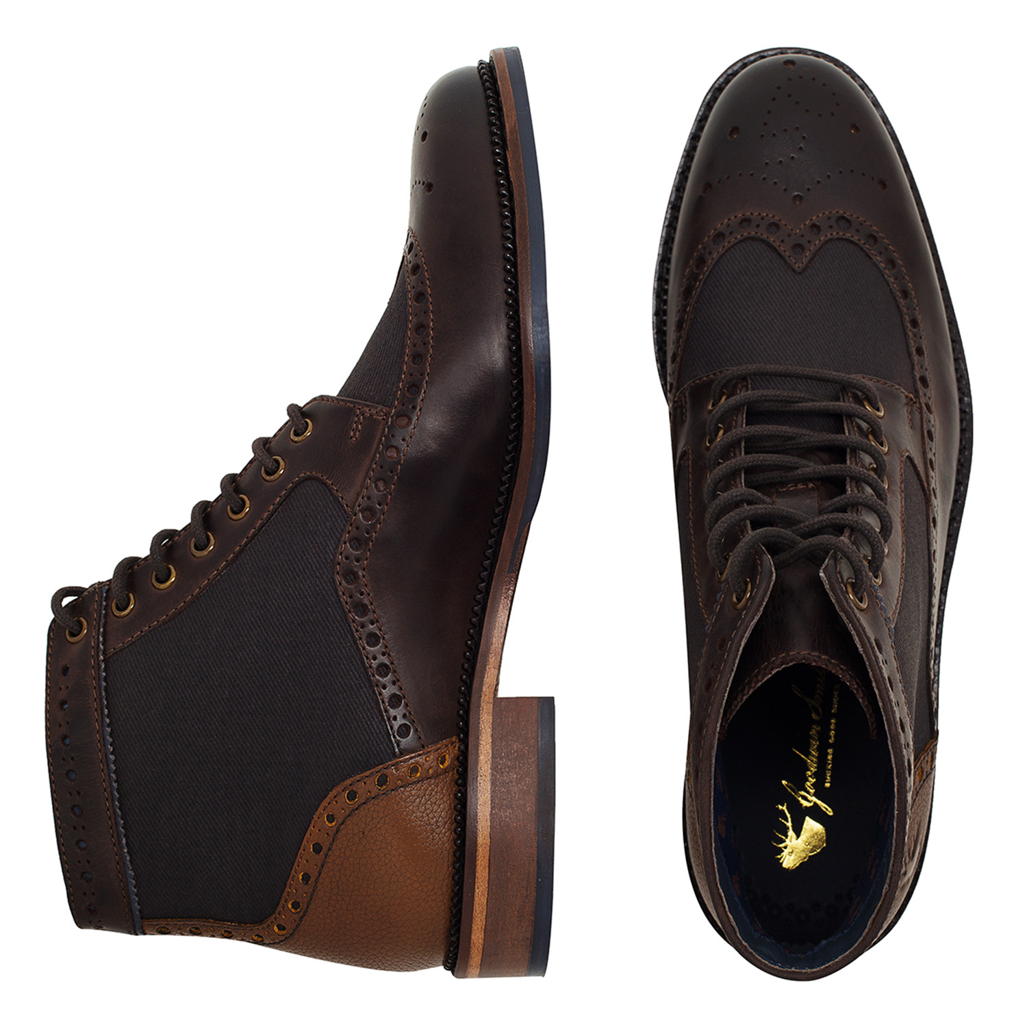 Derby brogue boot with contrast styling. Oilly pull up leather teamed with waxed twill and contrast colour heel. Stag logo detail burnished to outside heel counter. New heavy duty Leather and TPR sole unit, unique hexagon tread anti slip forepart and heel overlaid on leather sole. Leather and textile lining. Leather sock gold embossed logo and extra padding for increased comfort.