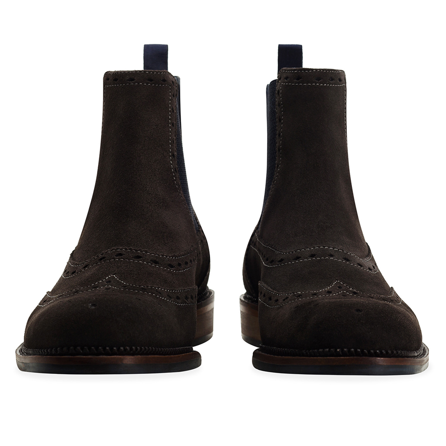Brogue detailed suede Chelsea boot. Featuring diamond brogue detail, premium quality suede with water resistant scotch guard finish. Stag logo detail embossed to heel tab. New heavy duty Leather and TPR sole unit, unique hexagon tread anti slip forepart and heel overlaid on leather sole. Leather and textile lining. Leather sock gold embossed logo and extra padding for increased comfort.
