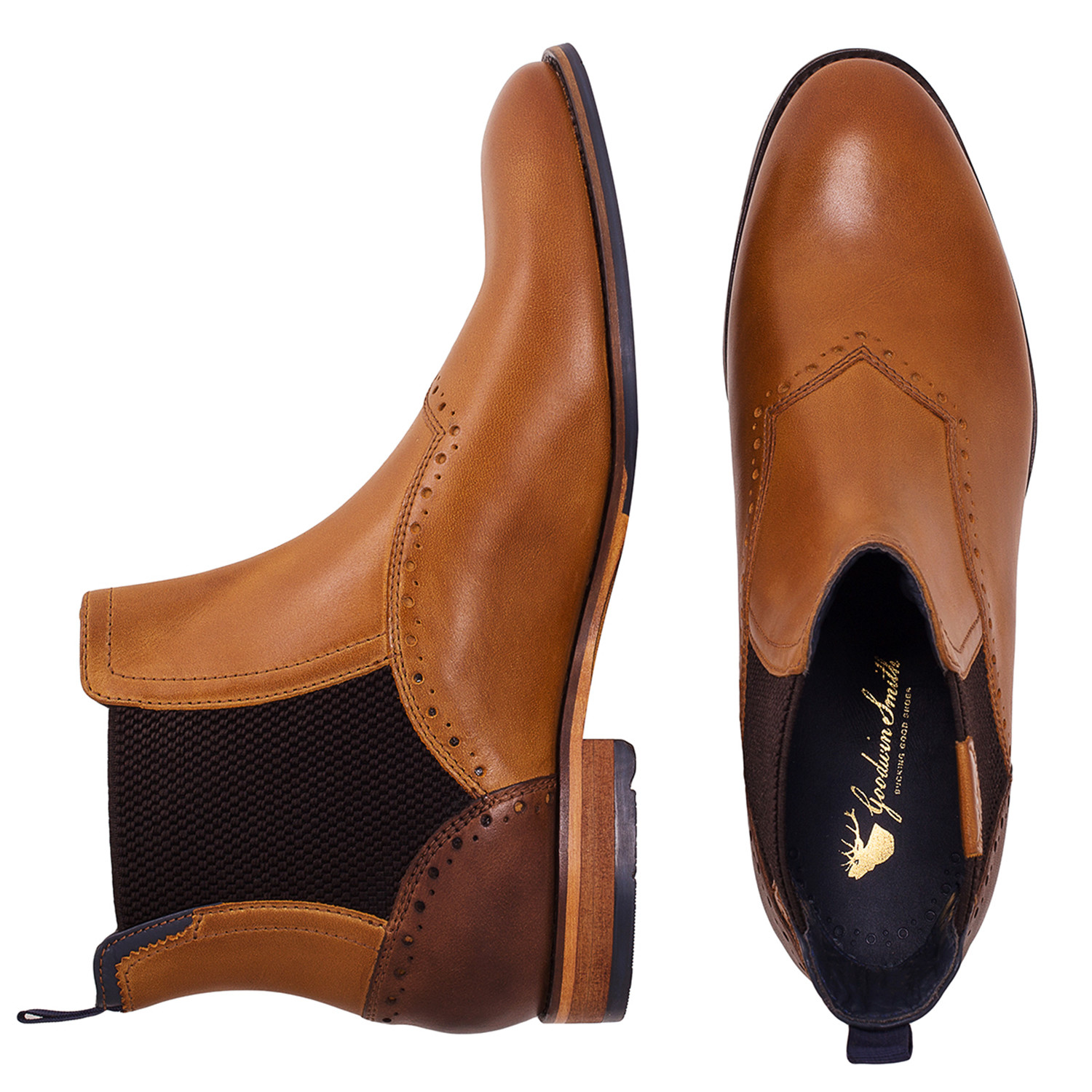 Classic Chelsea boot featuring hand burnished premium analine leather upper with contrast colour heel. New leather and TPR sole unit, anti slip TRP forepart and heel featuring Goodwin Smith branding. GS stag head logo branding tab on elastic panel. Leather and textile lining. Leather sock gold embossed logo and extra padding for increased comfort.