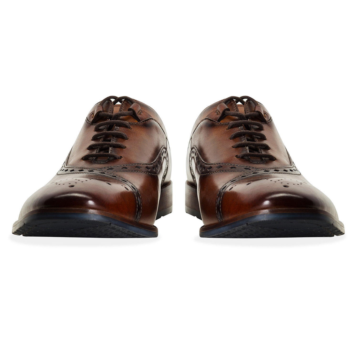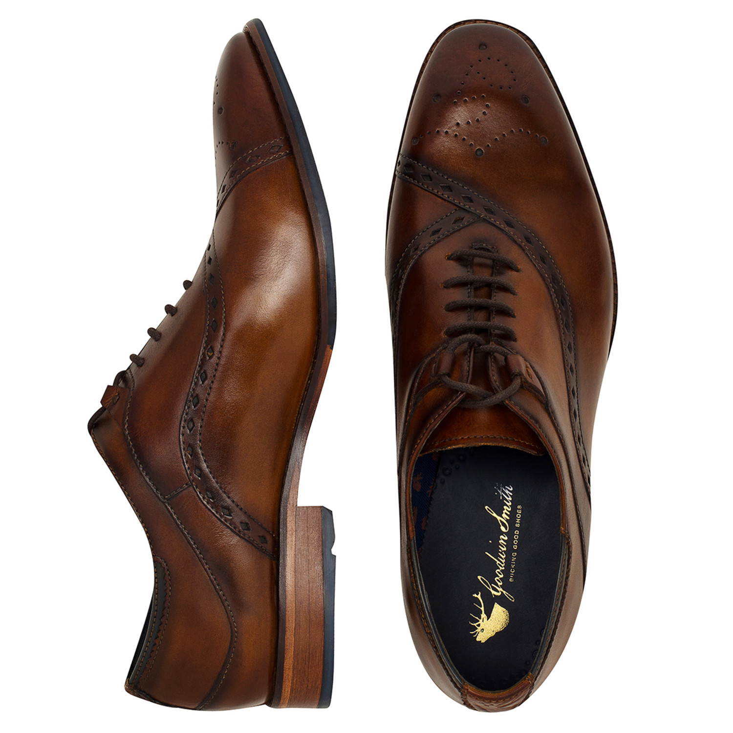 Asymetric detail correspondant brogue shoe. Hand dyed leather upper producing rich colour detail. Loop top eyelt detail. New leather and TPR sole unit, anti slip TRP forepart and heel featuring Goodwin Smith branding. GS stag head logo branding to heel tab. Leather and textile lining. Leather sock gold embossed logo and extra padding for increased comfort.