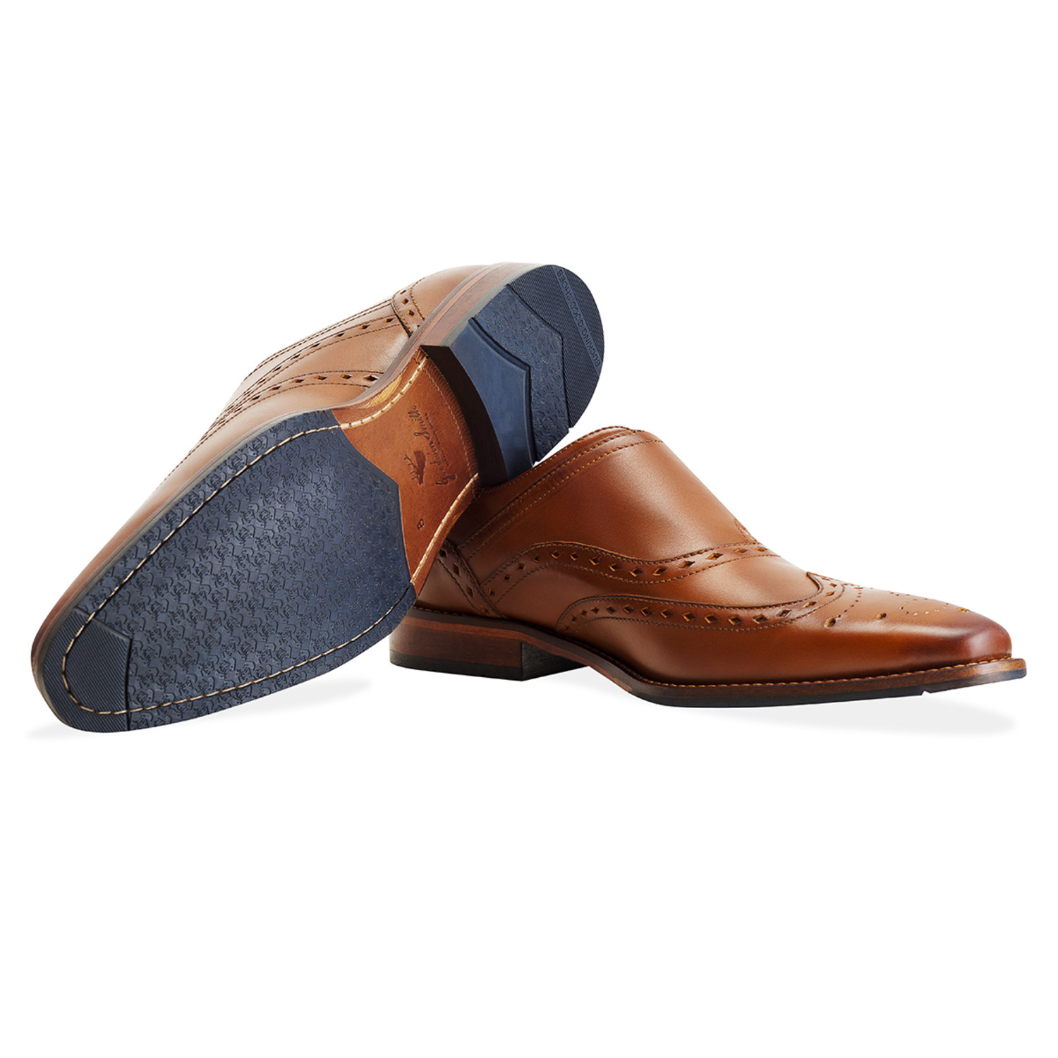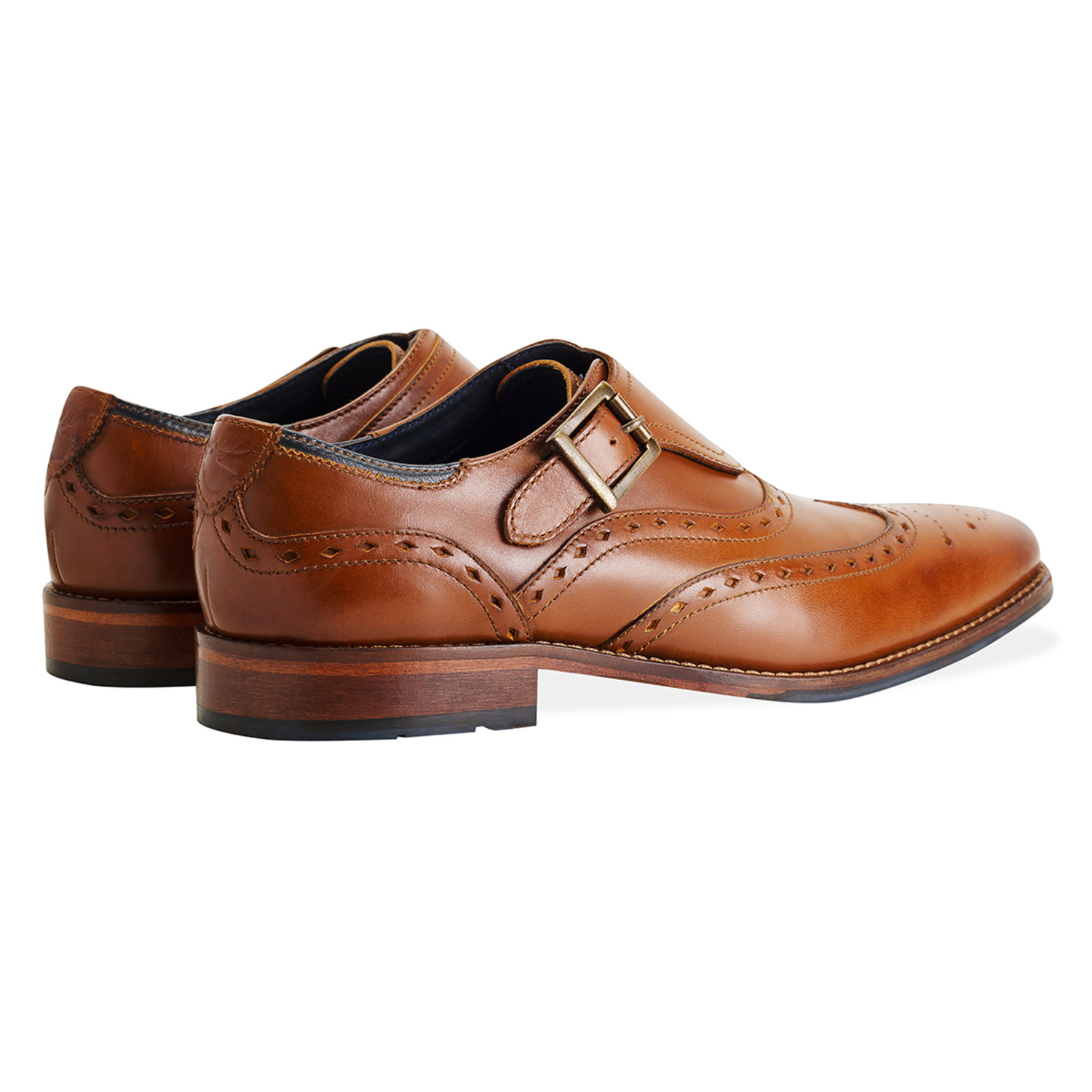 Single monk strap shoe. Diamond brogue detail on pointy toe. Hand burnished premium leather upper. New leather and TPR sole unit, anti slip TRP forepart and heel featuring Goodwin Smith branding. GS stag head logo branding to heel tab. Leather and textile lining. Leather sock gold embossed logo and extra padding for increased comfort.