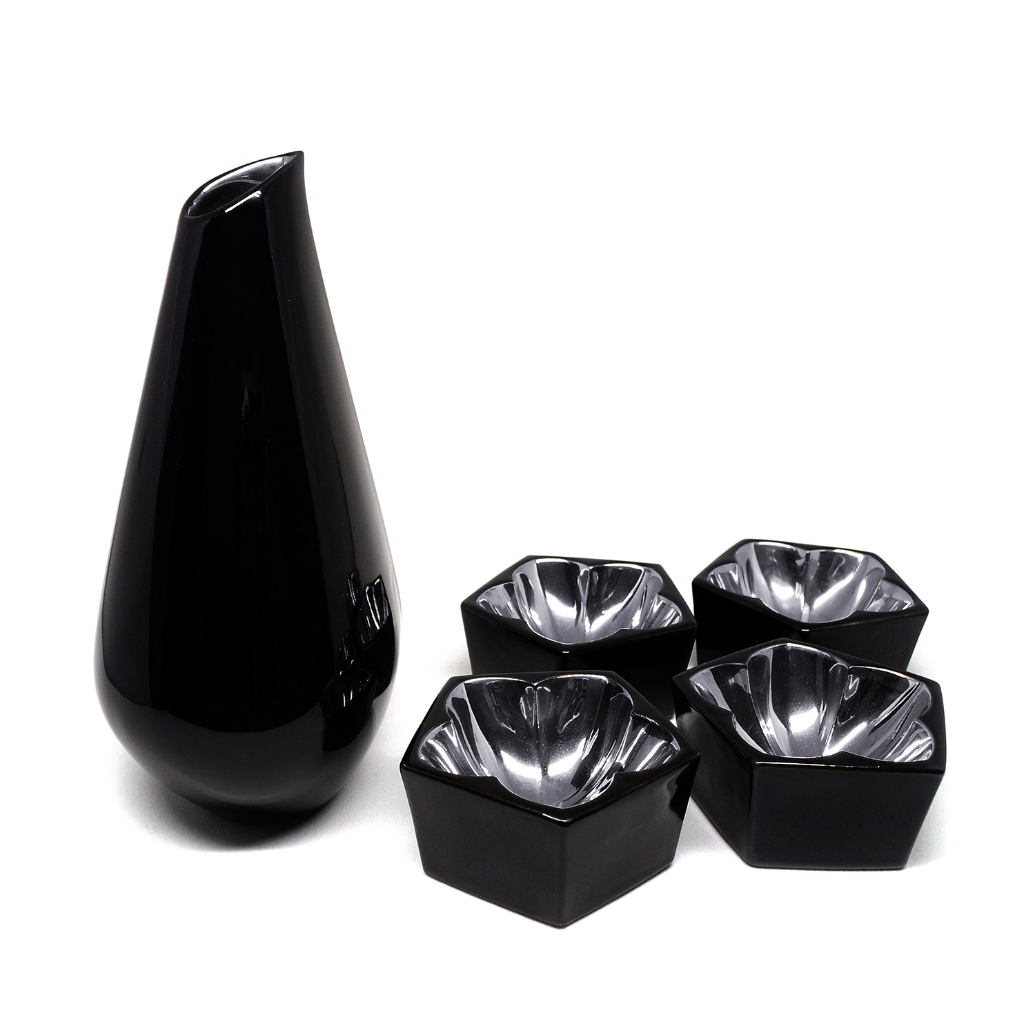 Yozakura is a Japanese tradition of enjoying the beauty of the Sakura (cherry blossoms) at night by gathering under lighted trees to celebrate nature’s beauty and the arrival of spring with delicious sake and food. This porcelain sake set is inspired by the Sakura pattern with pentagon cups carved as the blossomed flowers, while the carafe has an opening in the form of a Sakura petal drifting in the wind.