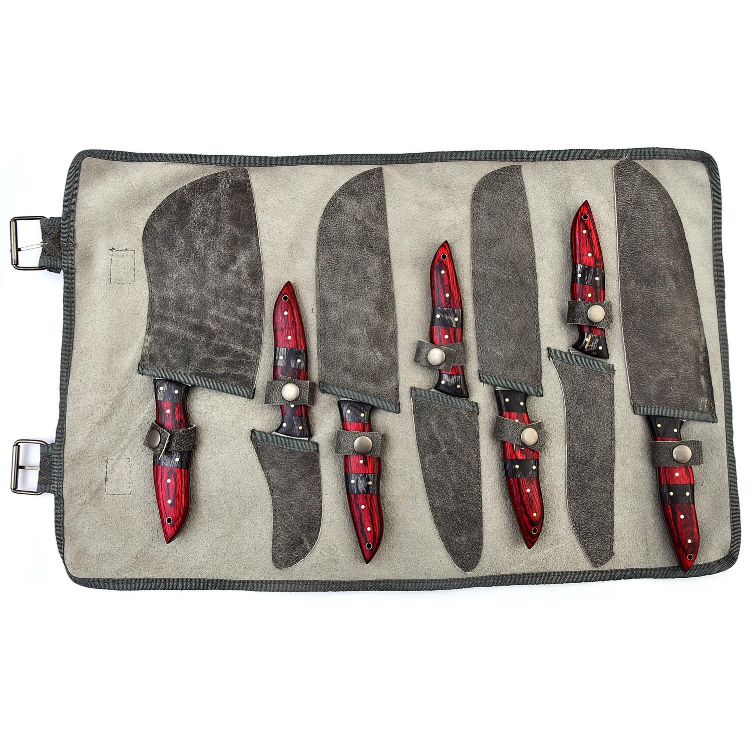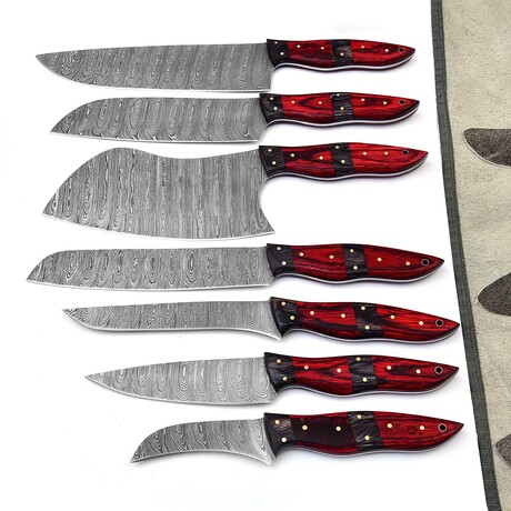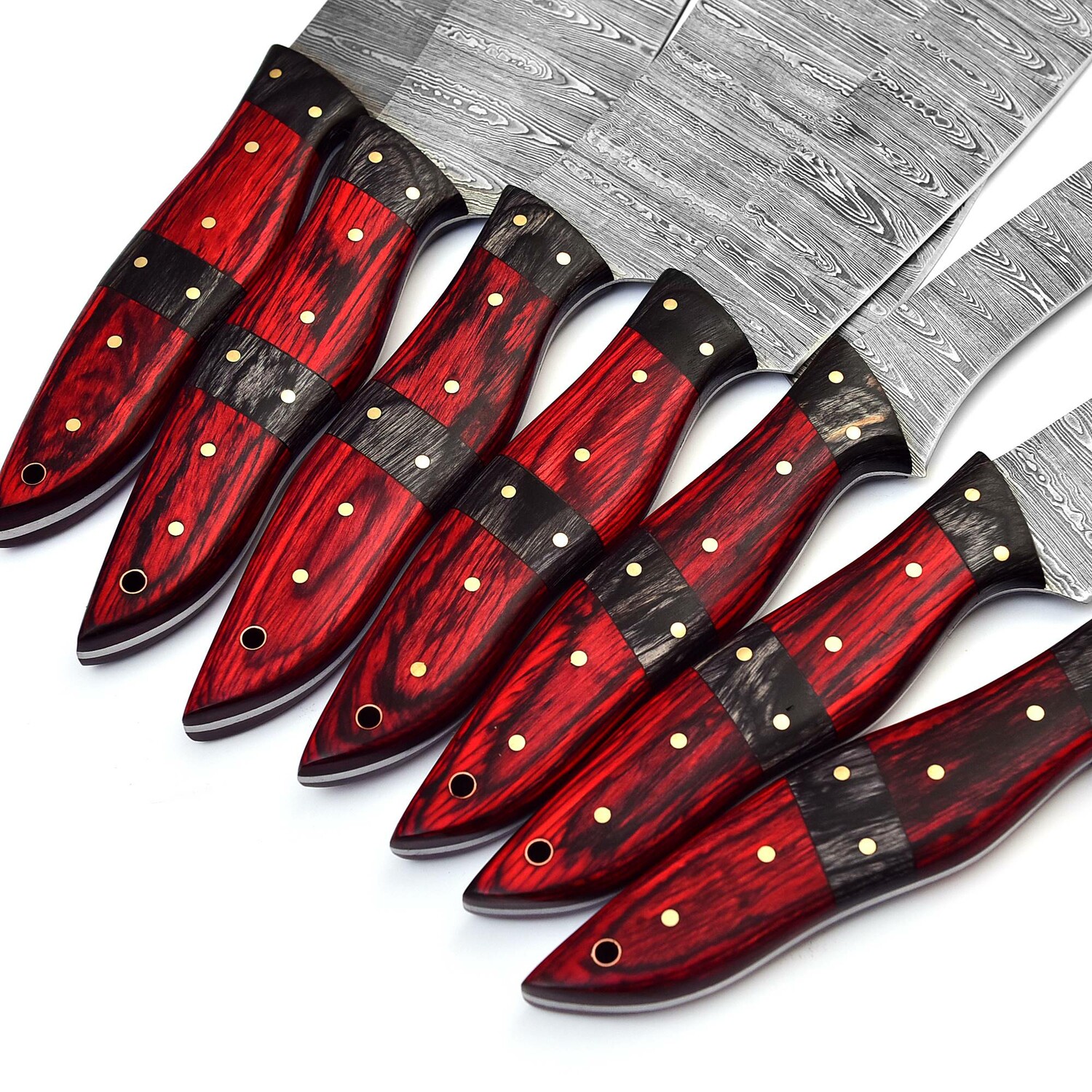 Damascus Steel Chef Knife 7-Piece Set including: Chef, Santoko,Slicer,Fillet, Pairing, Utility Knife And Meat Cleaver. With Red Pakka Wood handle with spacers of black Pakka Wood