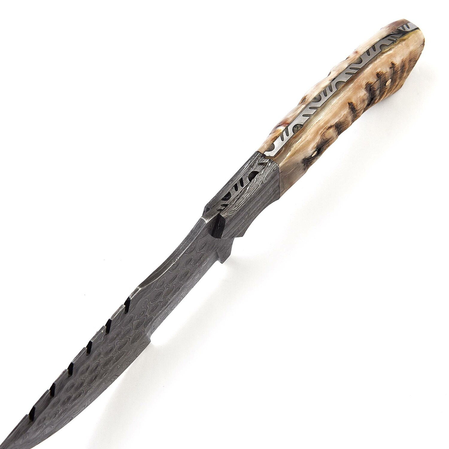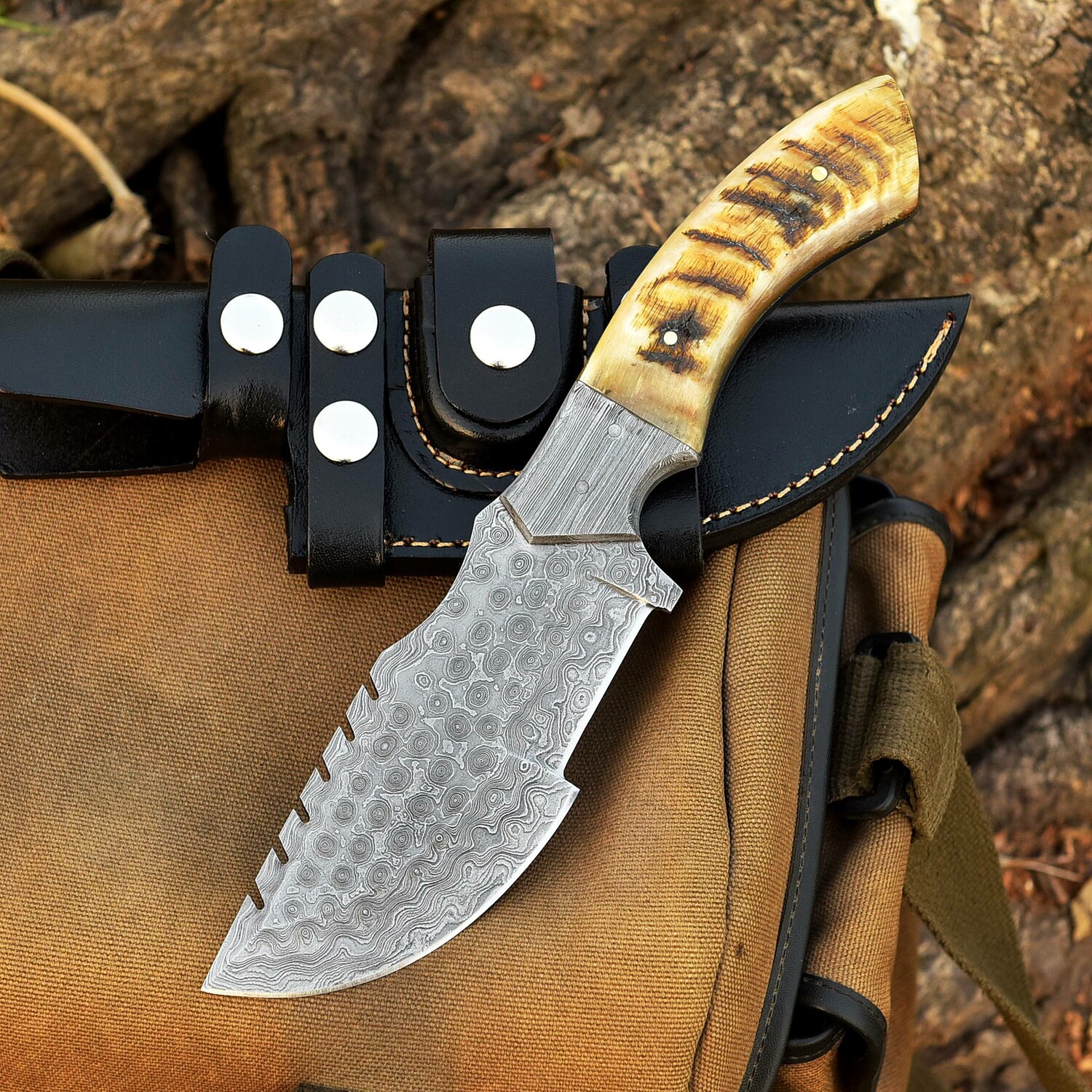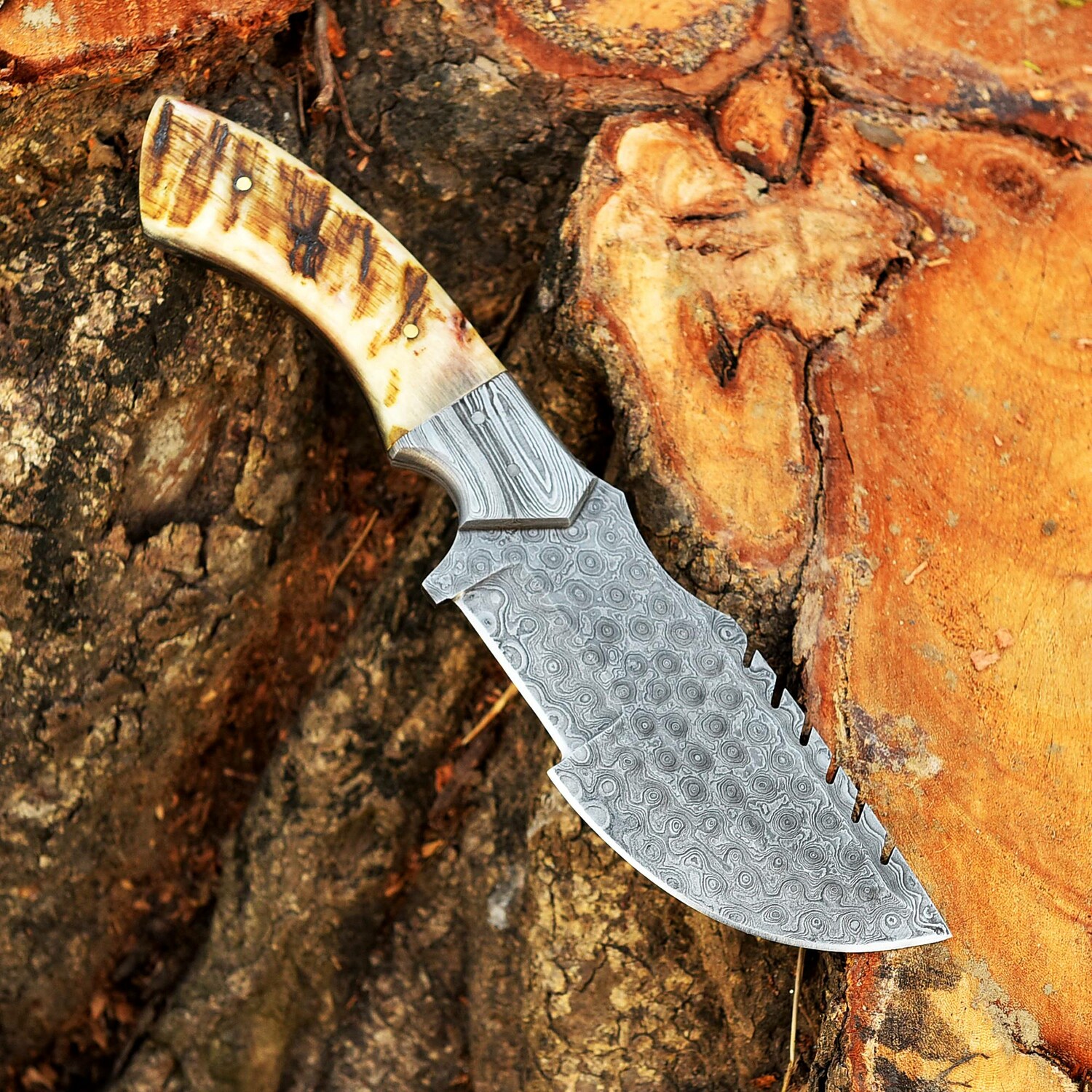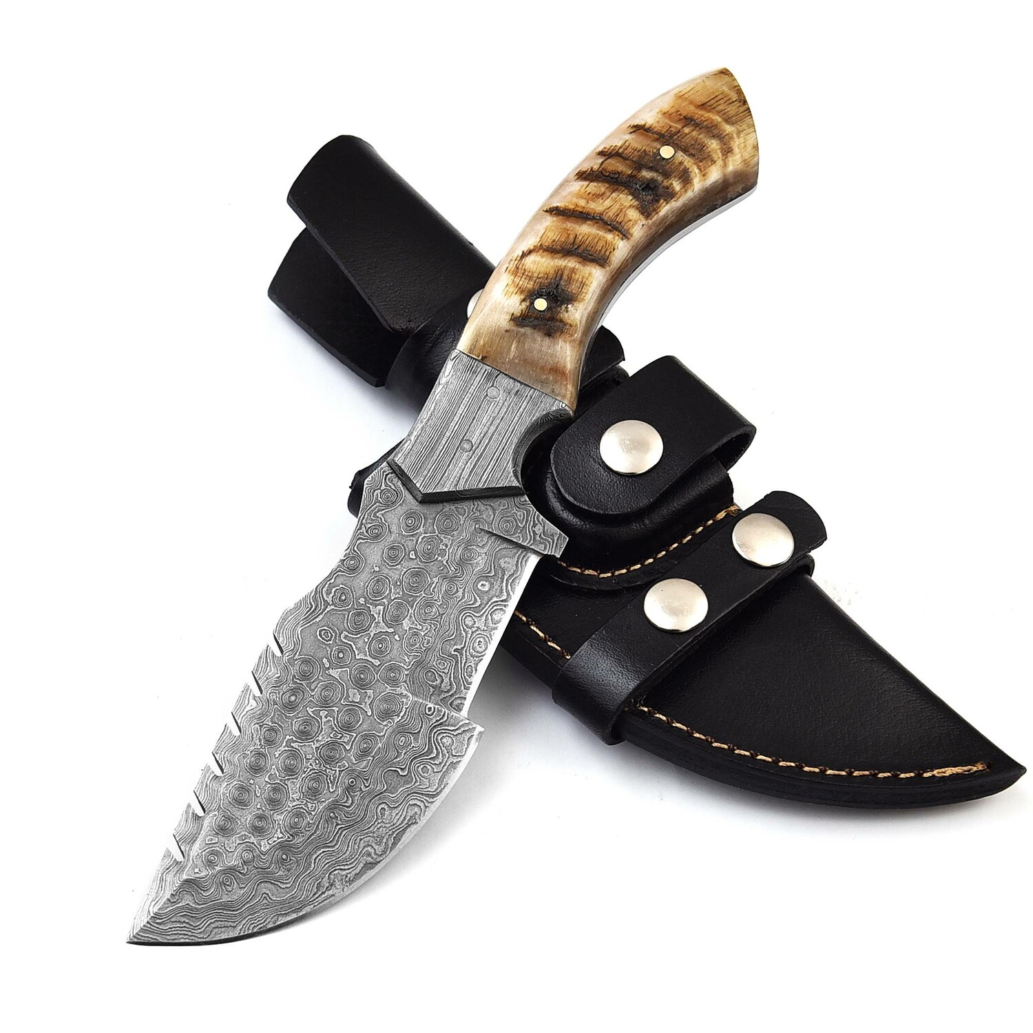 Damascus Steel handmade fixed blade tracker knife With Ram Horn handle and Damascus bolster making its elegant look.