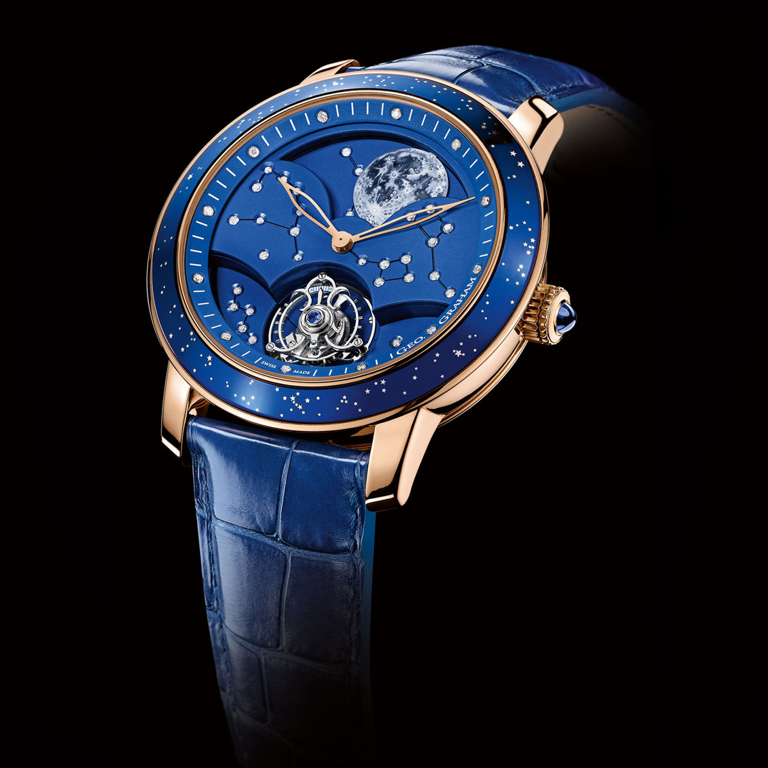 Great attention to detail has been paid to the design of this Graham Geo Graham "The Moon" watch from Graham. Its manually wound movement is encased in a 46 mm 18K rose gold case with a round, blue bezel. The gleaming look of the case contrasts with the watch's blue crocodile leather strap to create a very alluring theme and give the watch a very luxurious appearance. The dial of the masculine timepiece is blue in color with rose-gold-toned hour and minute hands, diamond hour markers, diamond-constellation decoration and a tourbillon at 6 o'clock. The watch's case back is transparent. Only 10 examples of this timepiece will be produced worldwide!