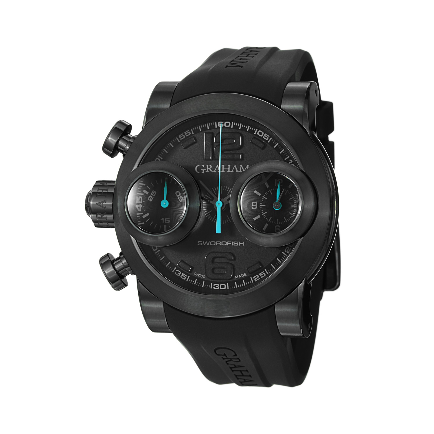 Easy to love but often faked, the Swordfish Automatic Chronograph by Graham is a gorgeous and arresting automatic watch. Its design features two portholes at 3 and 9 o'clock, which operate as a 30 minute and 12 hours/seconds counter, with a power reserve of 48 hours. You'll love its bold blacked-out appearance, which carries through the face, bezel, strap, and even its additional pushers.