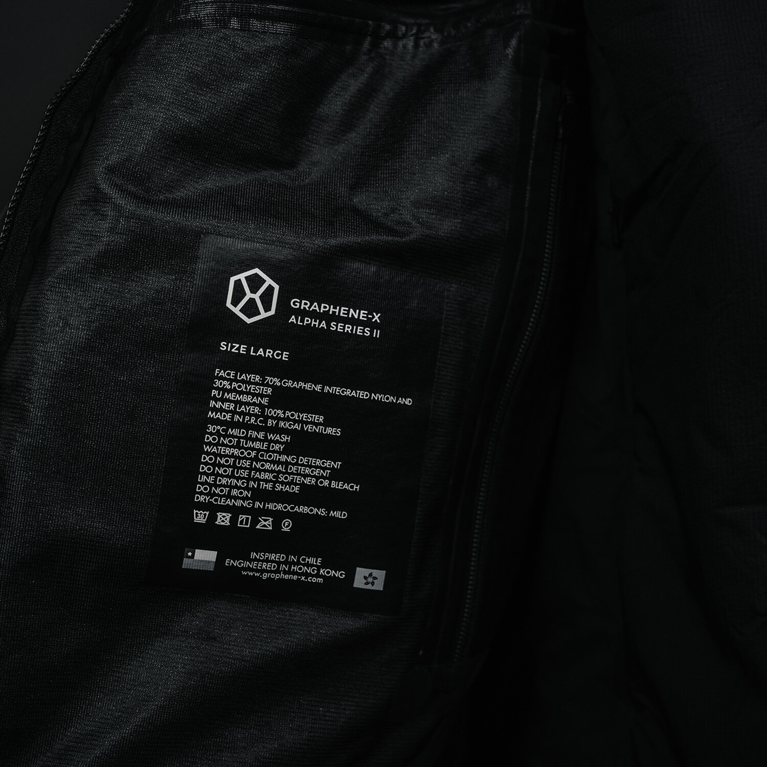 The Alpha Series II jacket is built from a 3-layer fabric. The 3 layers feel like one piece of fabric as they have been sandwiched together. The middle layer corresponds to the waterproof membrane while the exterior layer (shell face) is the one integrated with Graphene.