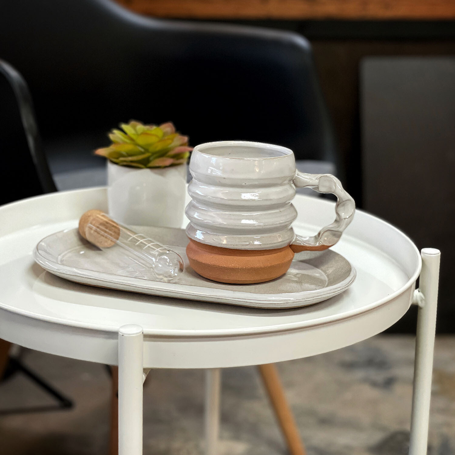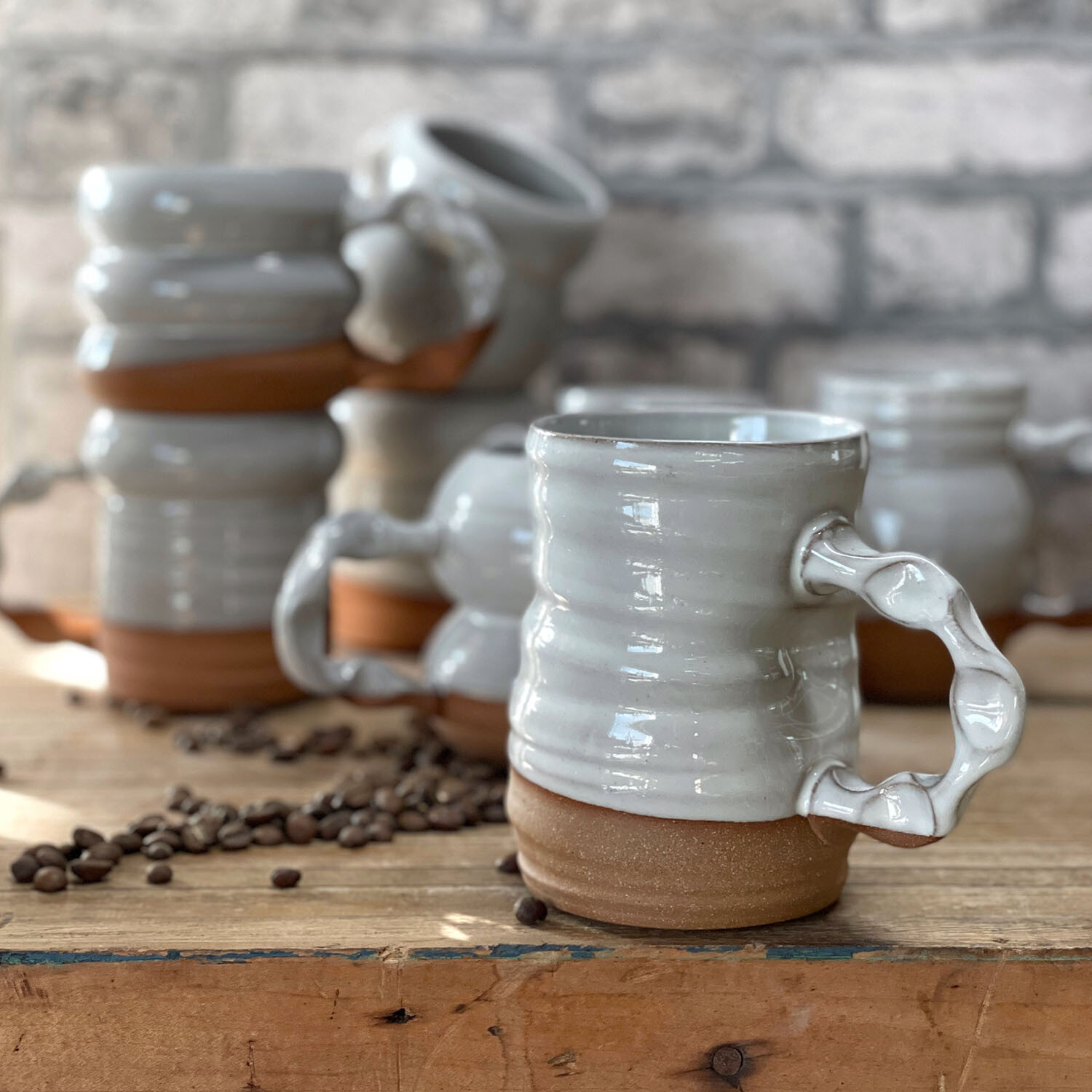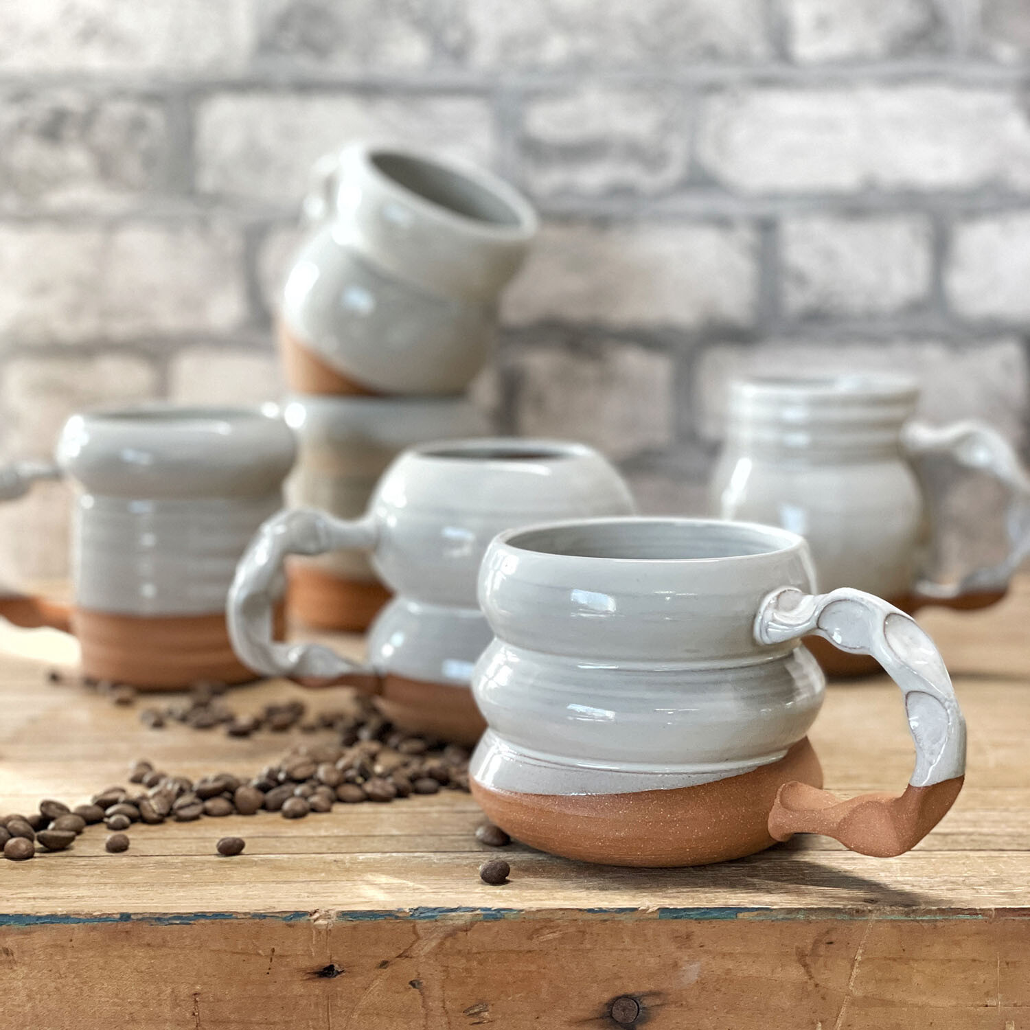 Each piece starts with a stack of prepared clay, all the same size, with the intent of making no two mugs exactly the same. The mug you receive will be completely unique and chosen by the artist for you. The fun for the artist is in making one of a kind mugs. The fun for you is the mystery of which shape you’ll receive. The end result is a mug like no other that you’ll love for years to come.