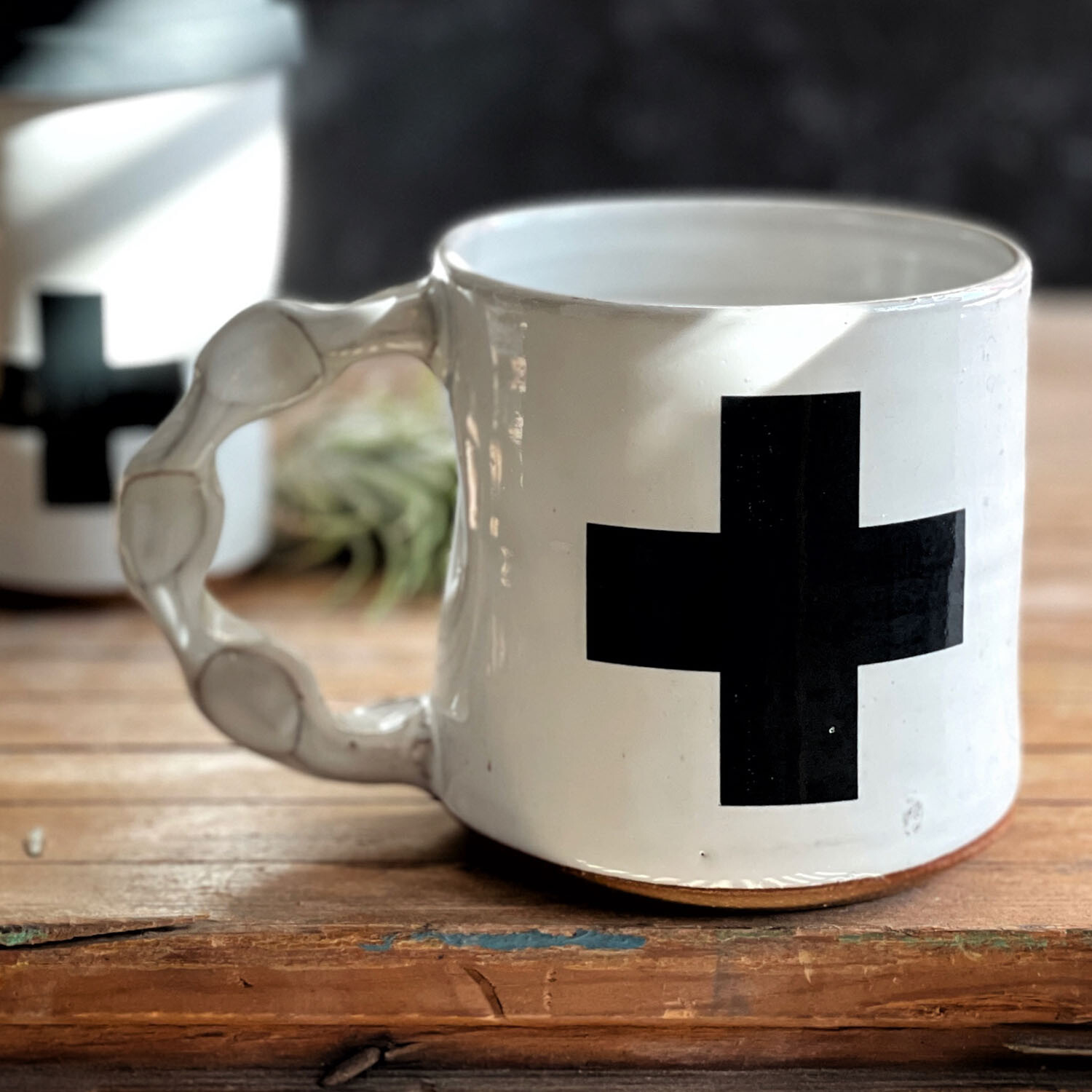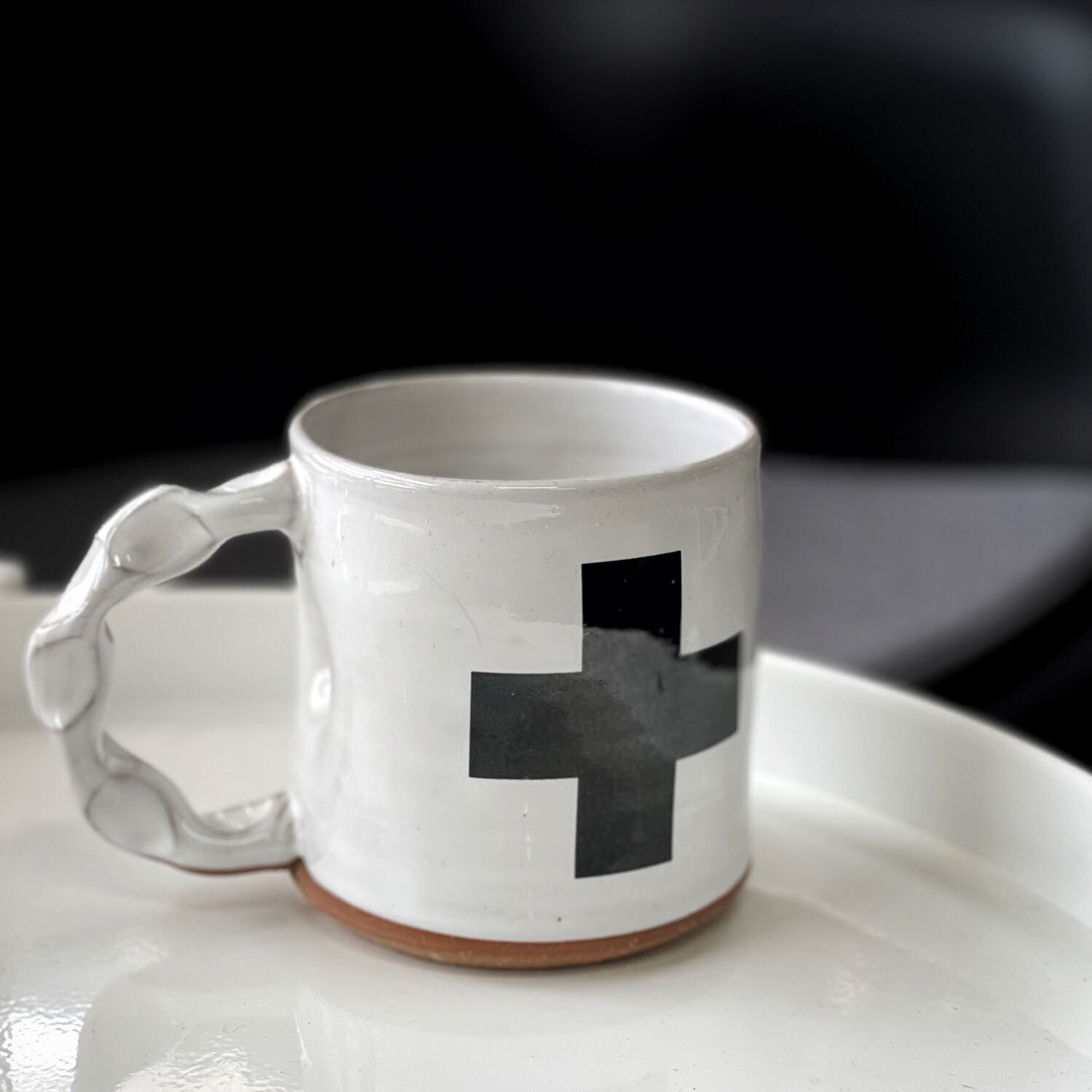 The classic white mug gets a minimalist modern update with a black Swiss cross. The signature handle is unique and ergonomic. Customers report that they love how their fingers fit right into each indentation in the handle making it effortless to grip even with a full cup of hot coffee.