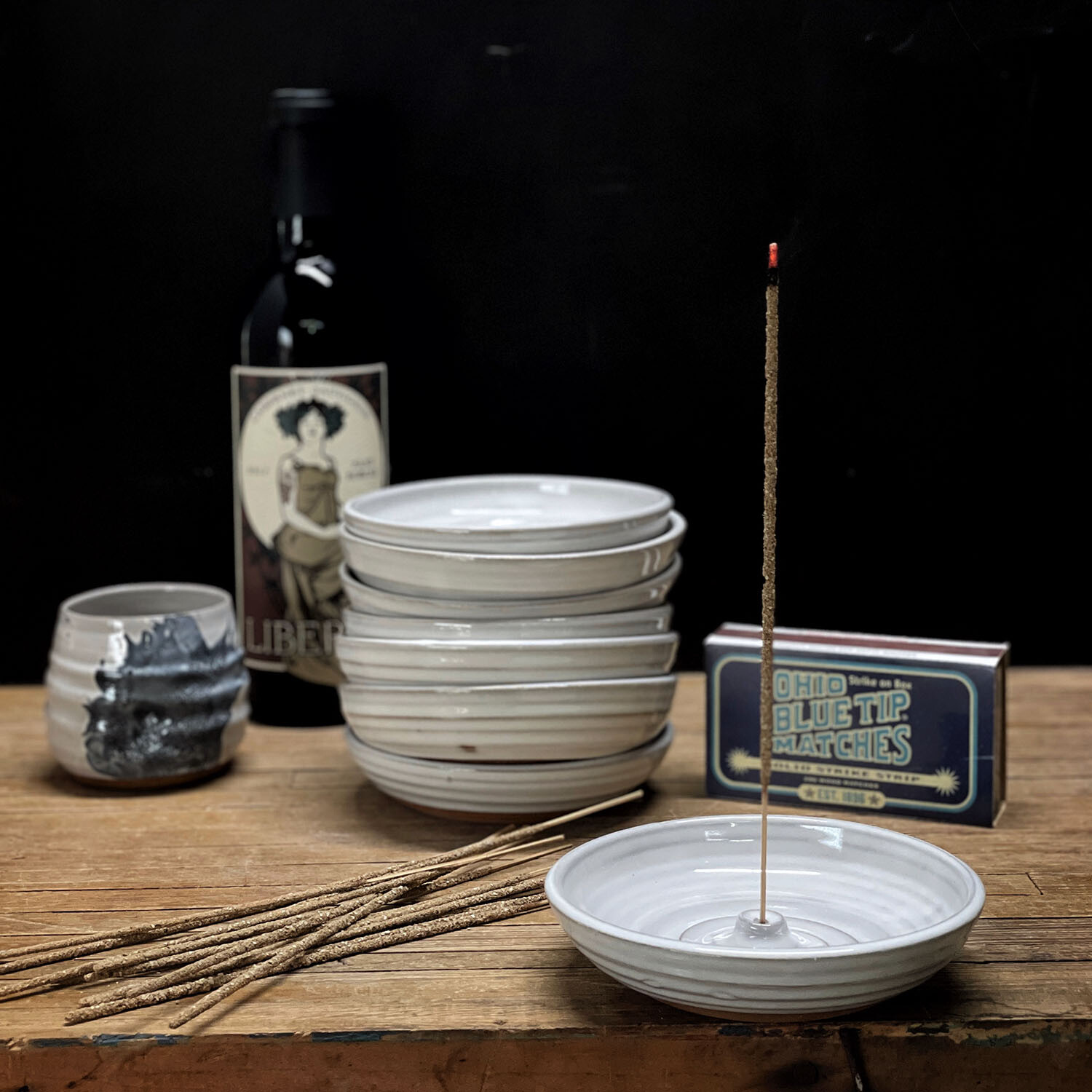 Each incense burner is handmade on a potter’s wheel. While they are all made to the same specifications, each one will have unique details and elements like the throwing rings left by the potter’s hands and the way the glaze flows over the surface as it is dipped.