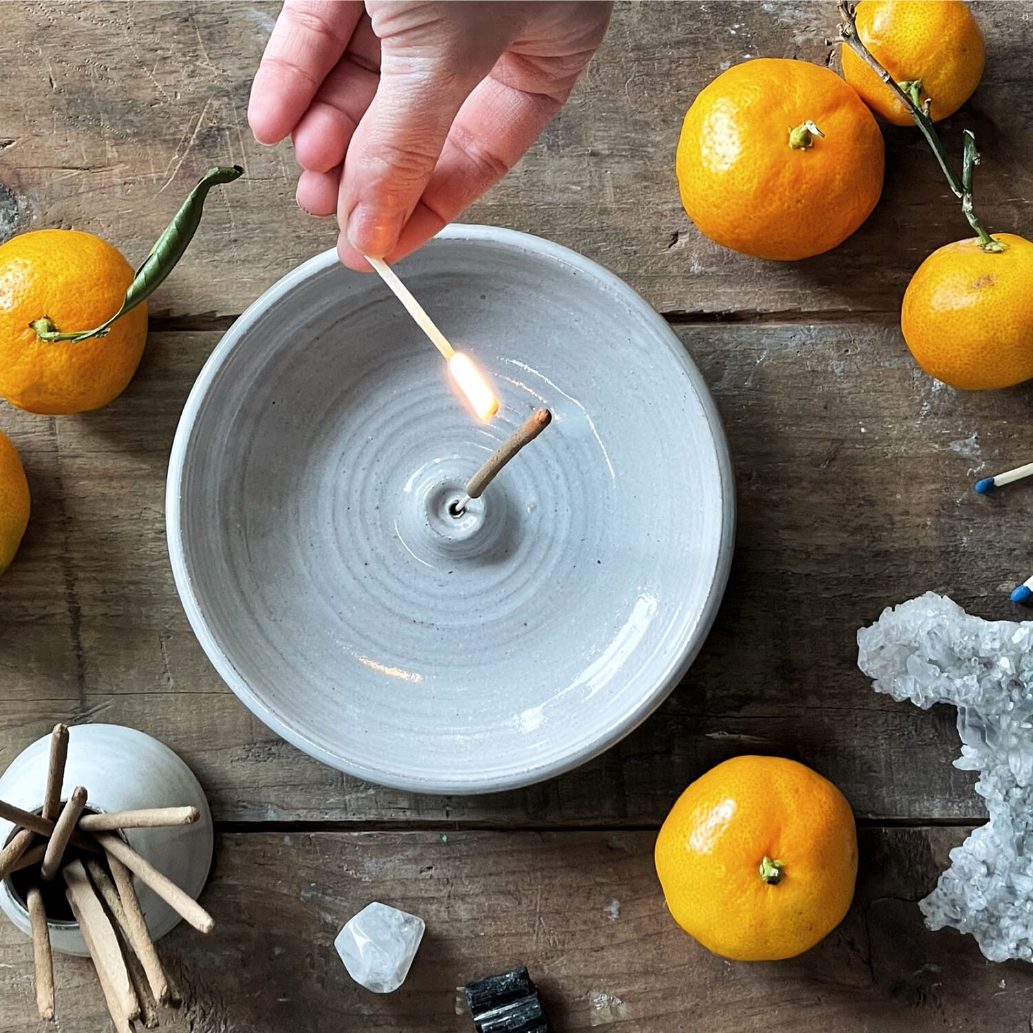 The gentle smoke of incense can change the mood of a room or mark the transition between work and home with intention. It also just smells good. The minimalist Gravesco handmade pottery Incense Burner will hold your incense stick, catching any ash that falls, protecting your table top.
