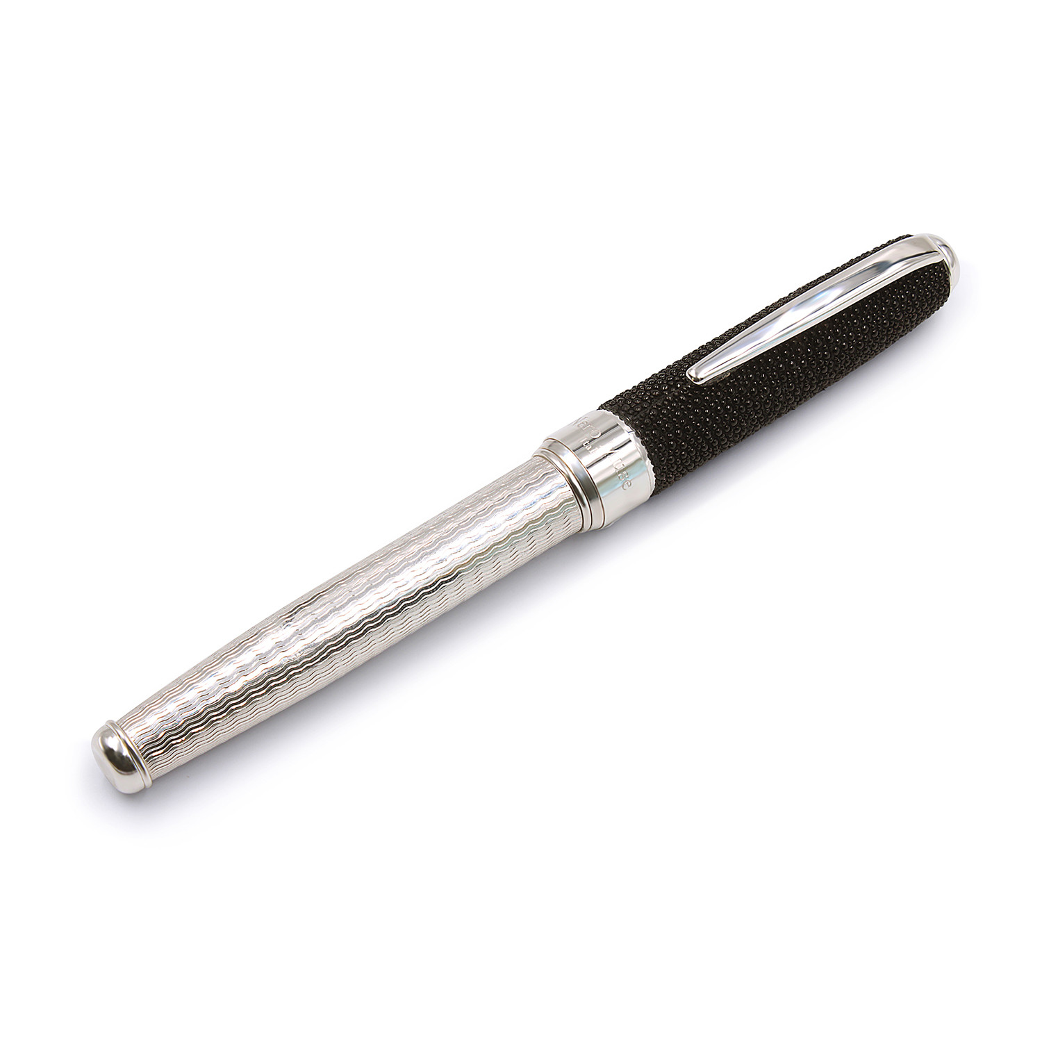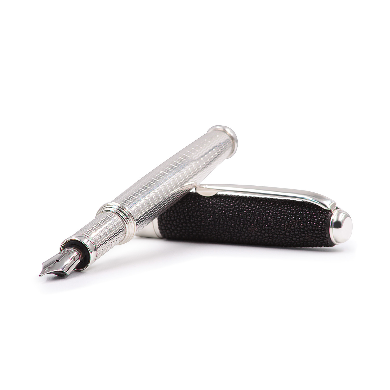 This stingray leather and sterling silver fountain pen was handcrafted in Italy. The barrel and finger grip section are made from sterling silver, and engraved by skillful artisans with a classic guilloché moiré pattern.