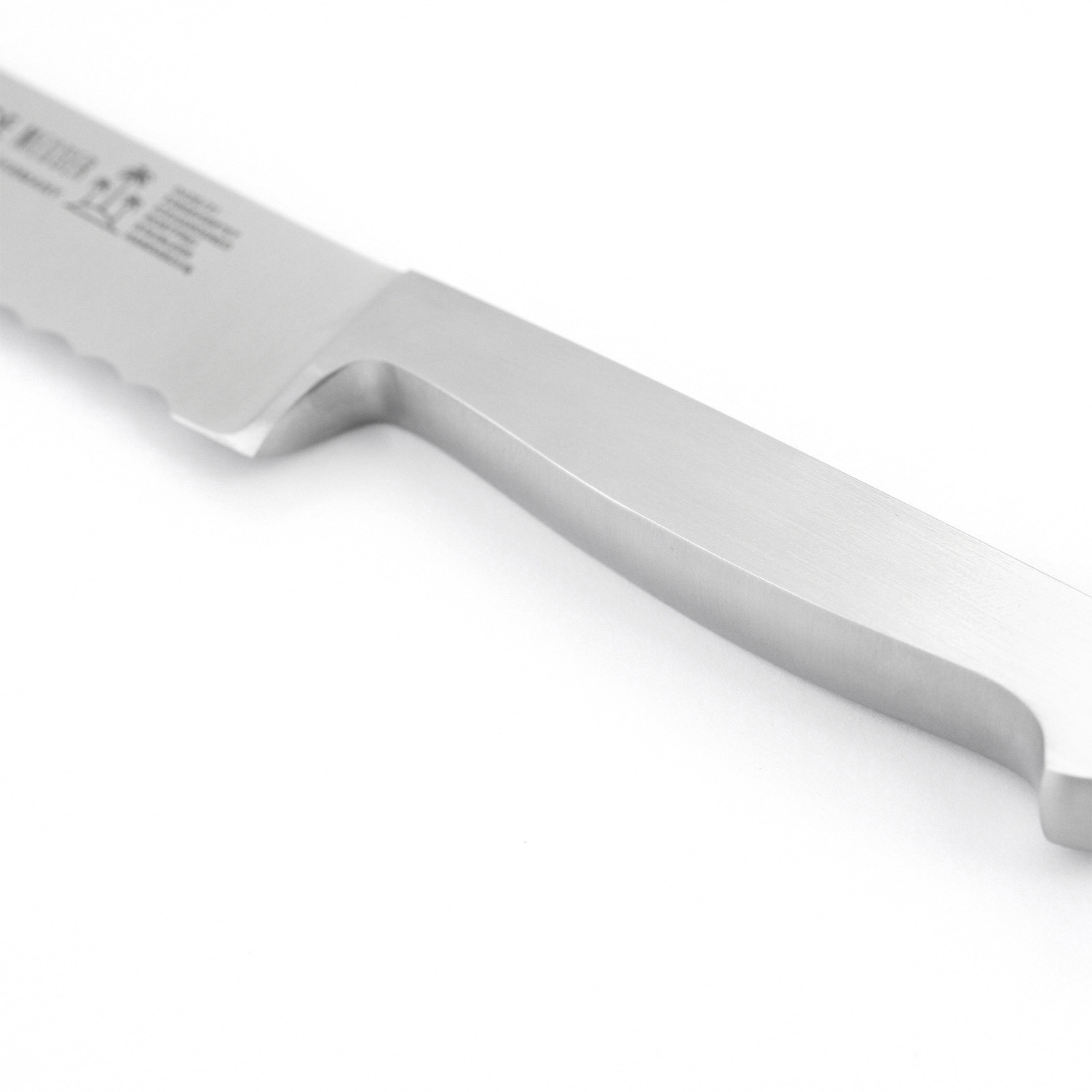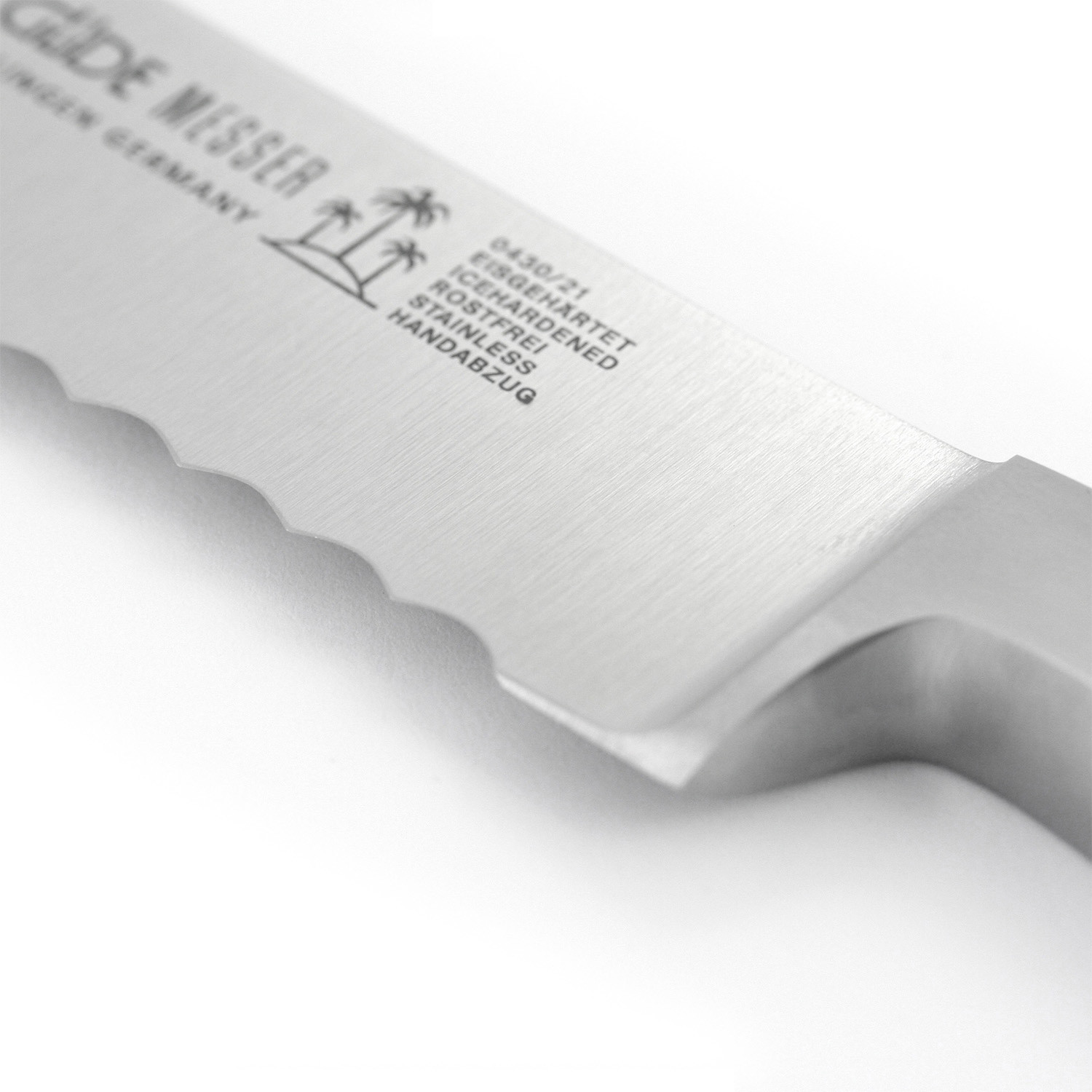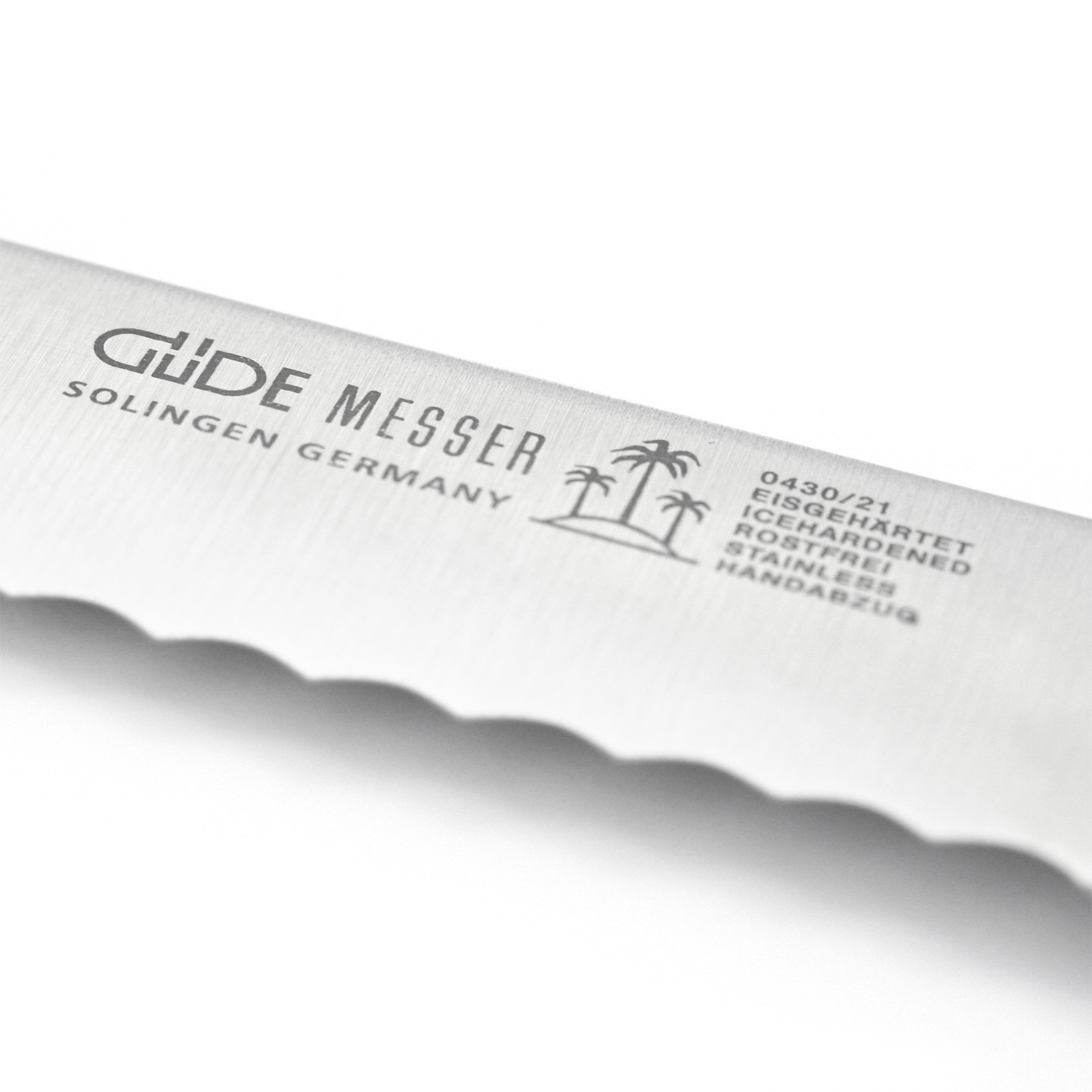 Whether it's hard of soft crust, the Kappa bread knife effortlessly cuts through. Made from stainless & hand-ground chrome-vanadium-molybdenum knife steel, it features a 10" straight blade with the signature Güde serrated edge. The blade length won't let you despair even with wide loaves and the dead weight supports your sawing movement so that only light pressure is needed.