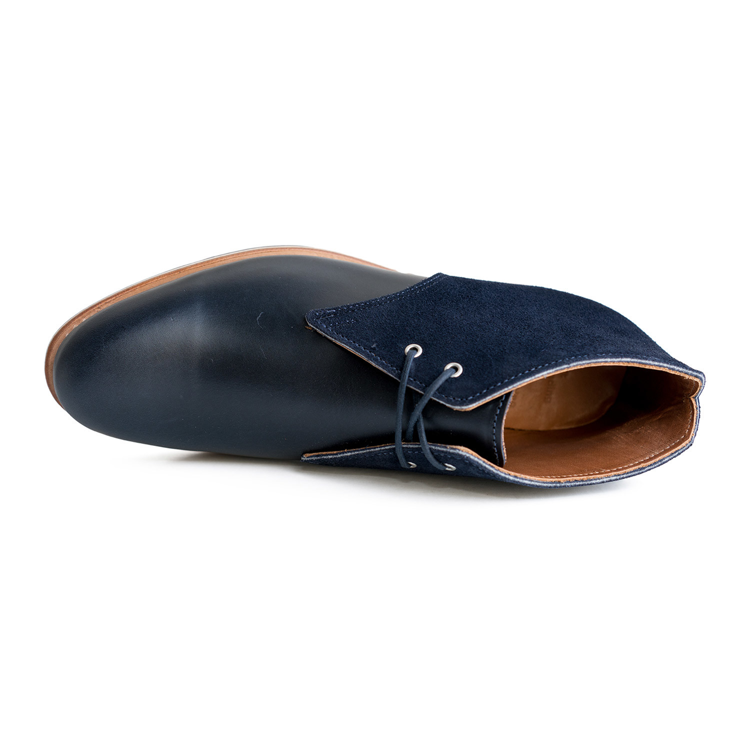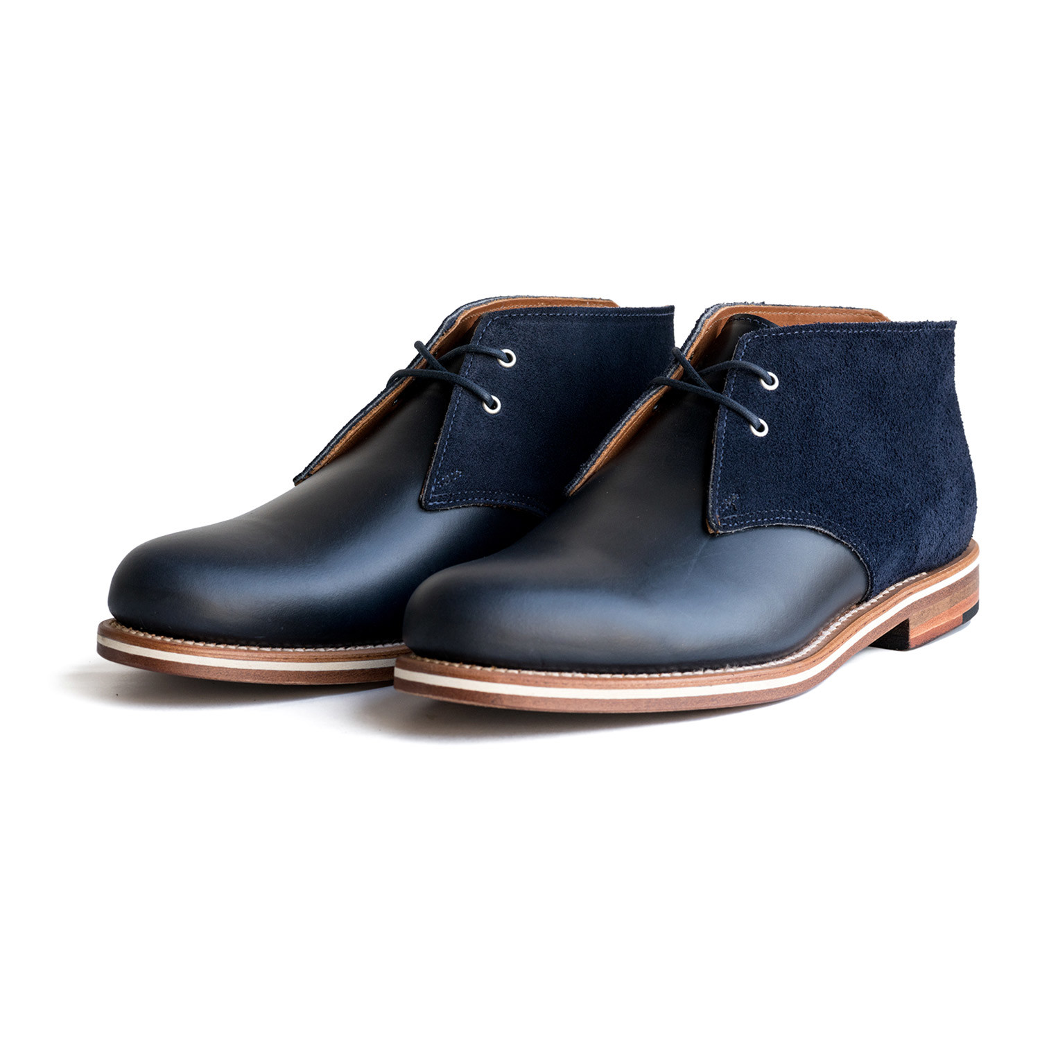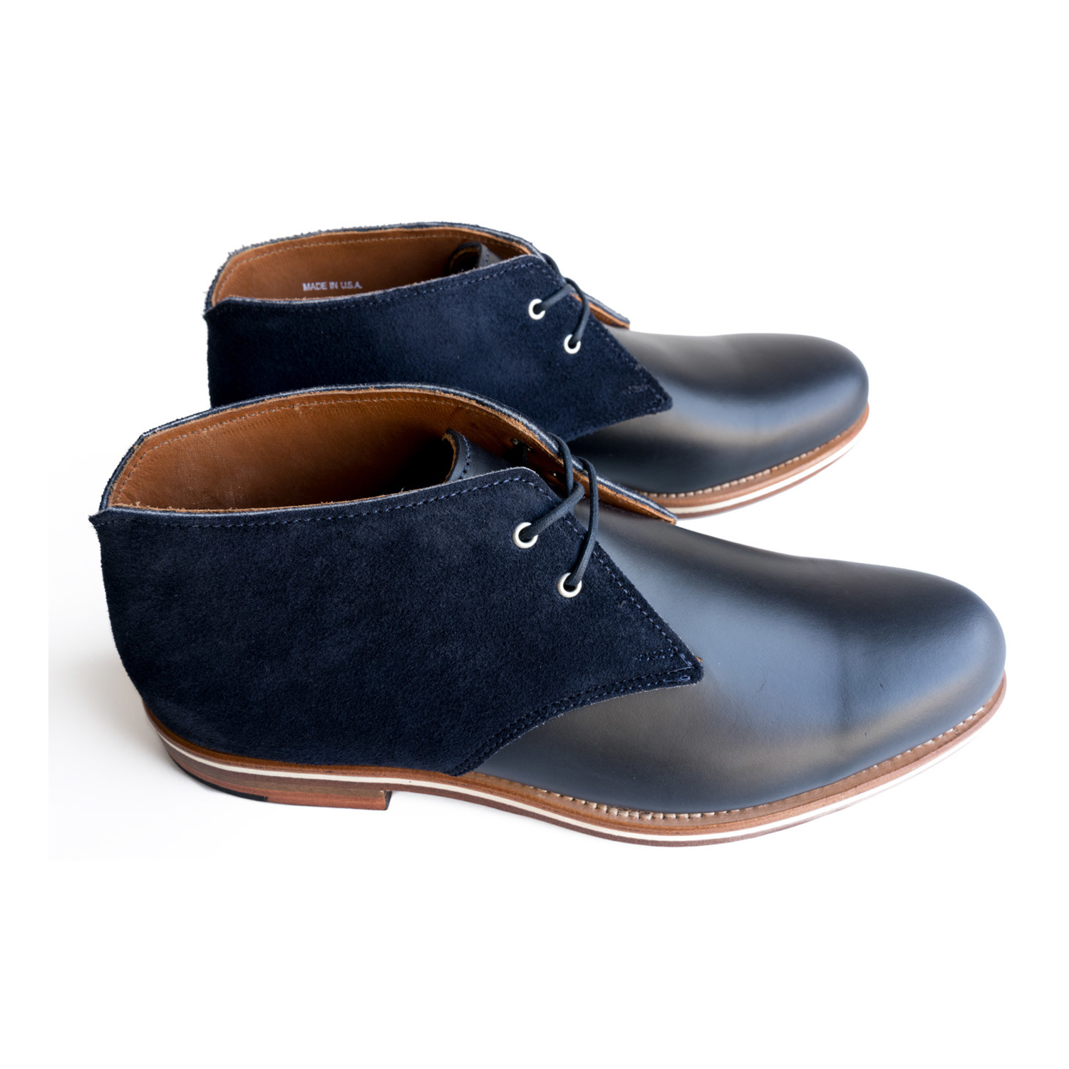 A versatile style that can go from the office to happy hour and anywhere in between, the Pete Navy is a new and unique twist on the HELM Signature Collection style. It still features the cutout in the back for comfort, an echo of the hexagon logo, but it has replaced the original bison panels with a rich navy suede from Tasman.