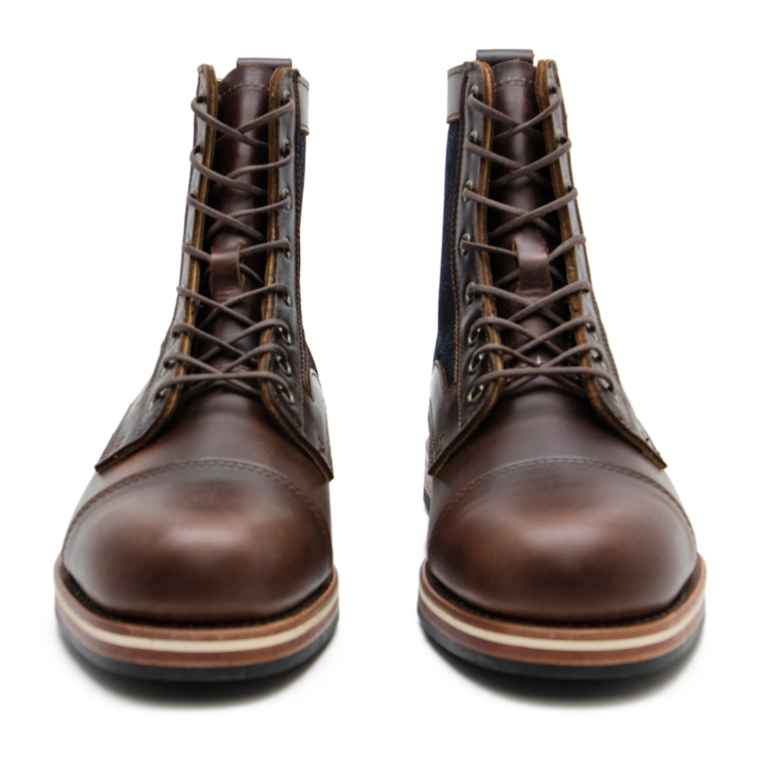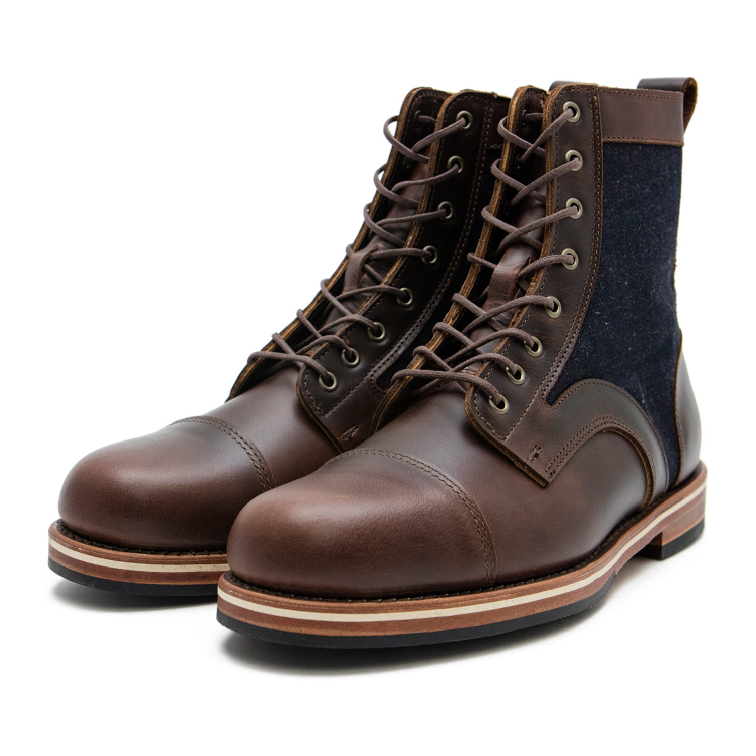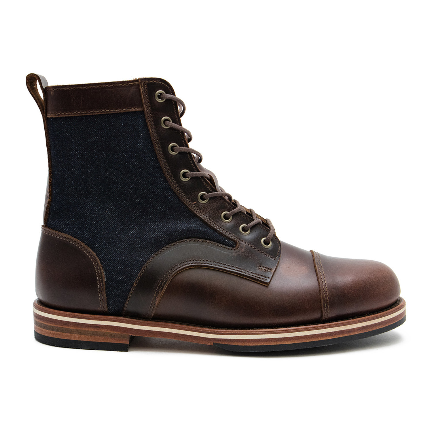 Based on the popular 2013 style, the Reid is back but with some added height. The Reid Tall is constructed of Tasman York Leather in Carolina Brown with panels of White Oak denim, a company hailing from Greensboro, NC. The Reid was designed for lovers of the Sam Original, with its contrasting denim and uniquely designed profile, but is made on the John last for those who prefer a rounded toe. It also offers more grip and durability with the Tempest Sole, bringing confidence for each step in more inclement weather.