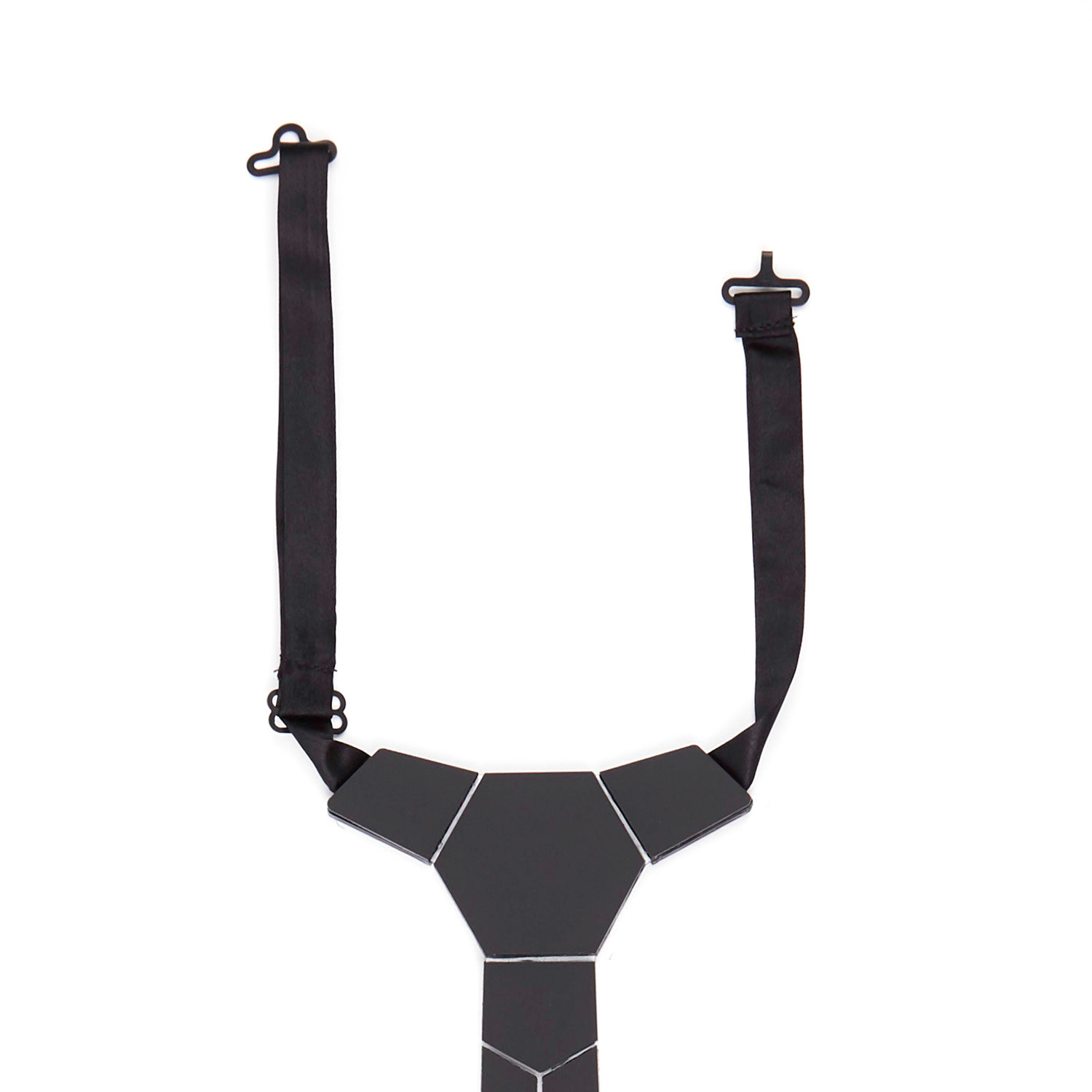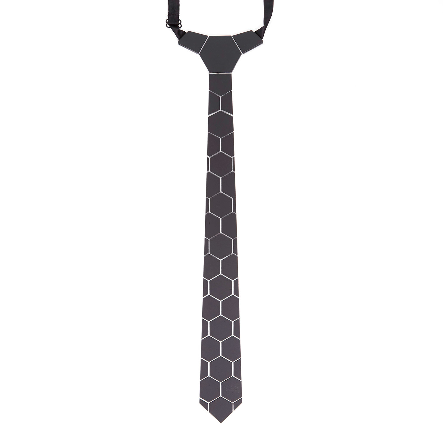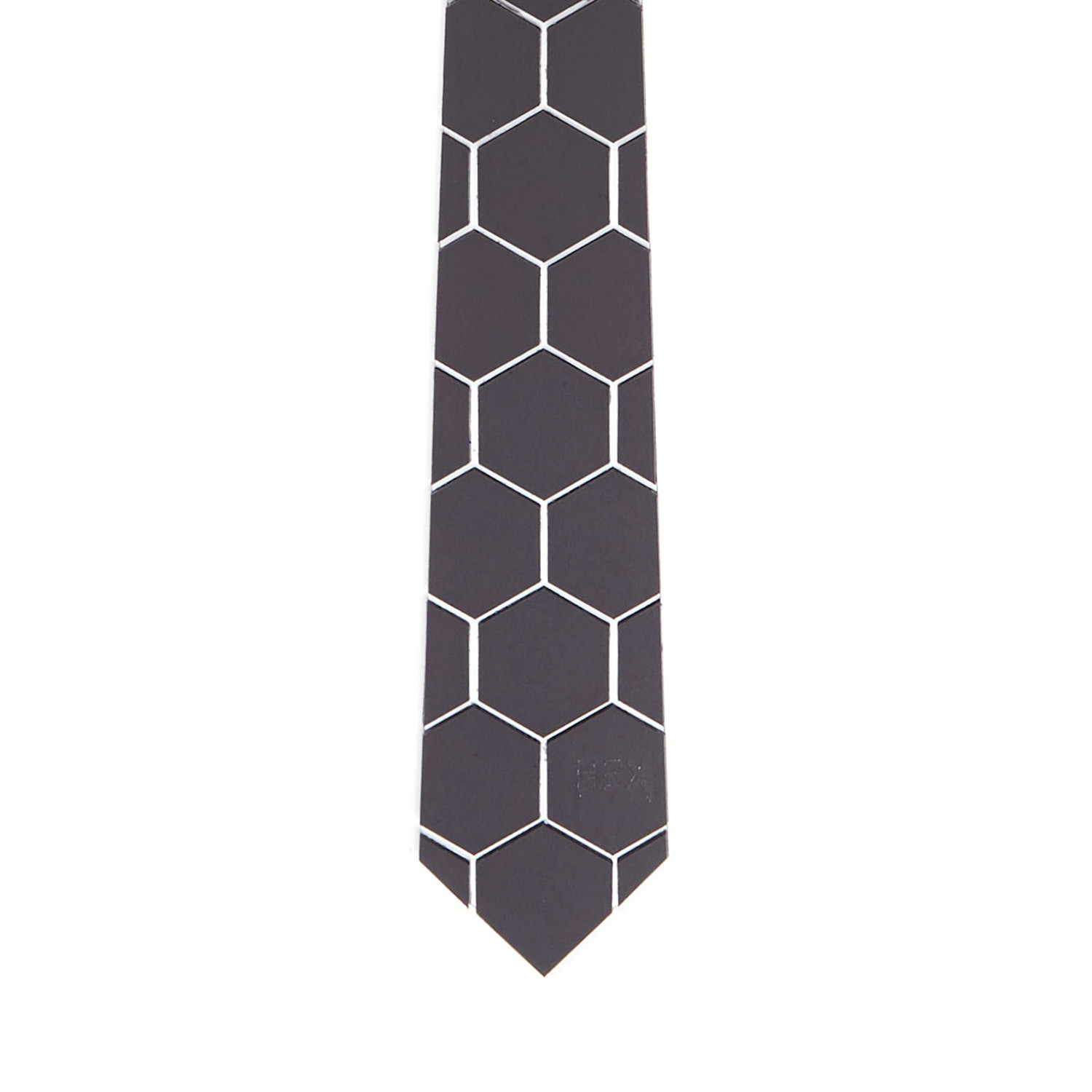 Unique and eclectic, the Honeycomb Tie is made of lightweight matte black polymers embodying the shape of recurring hexagons. Assembled by hand, each tie reflects a custom setting, giving each piece a one-of-a-kind design. This eye-catching tie is sure to be a conversation starter.