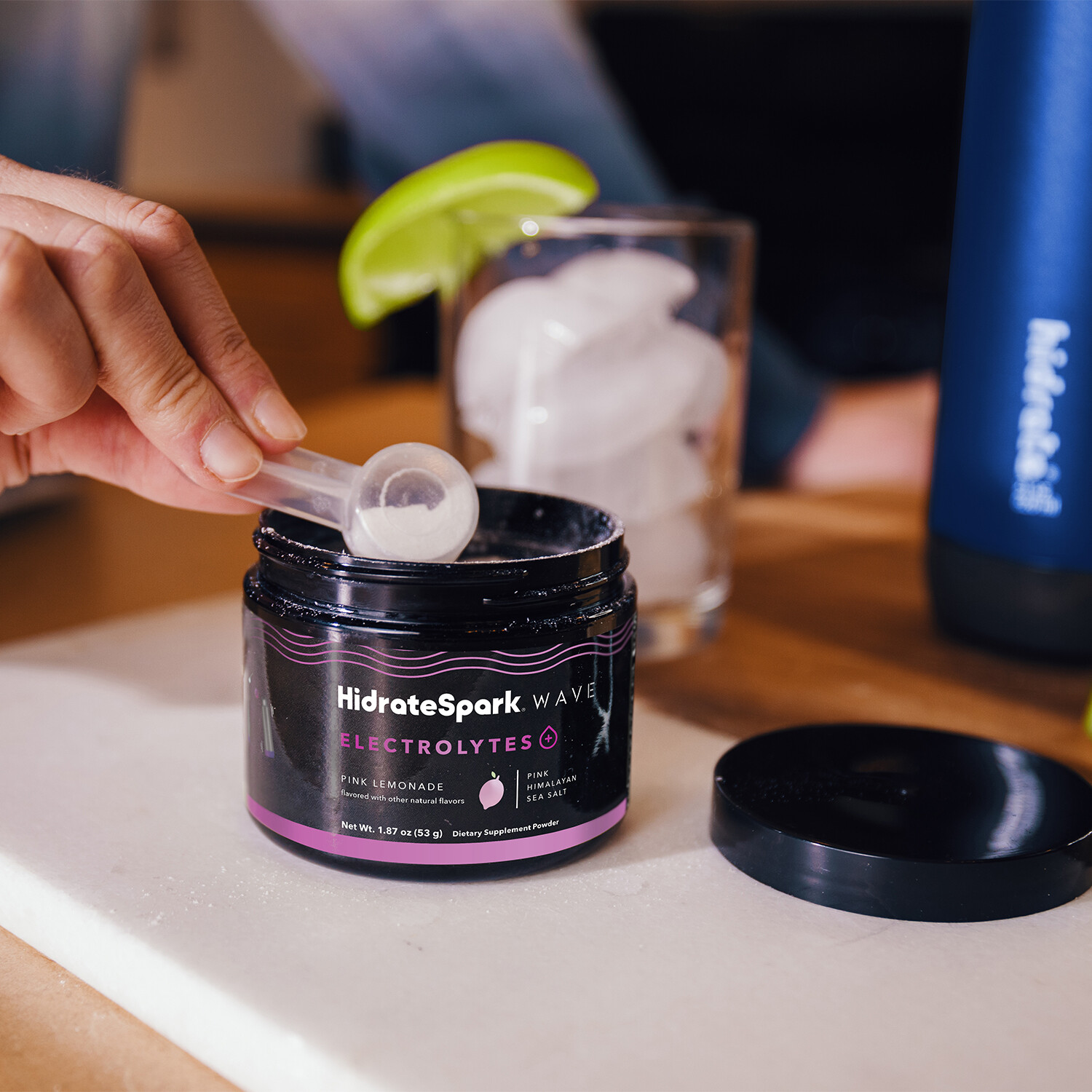 Add HidrateSpark's Wave Electrolyte Supplement to your smart water bottle to revitalize your healthy hydration habits. Full of flavor and packaged in a lightweight, recyclable container, this pink lemonade supplement mix features 6 key electrolytes plus bonus minerals and vitamins. It is sugar free, zero calories, and made with pink Himalayan sea salt. Just add 1 level scoop to 16 fl oz of cold water, shake or stir to mix thoroughly, then sip and enjoy!
