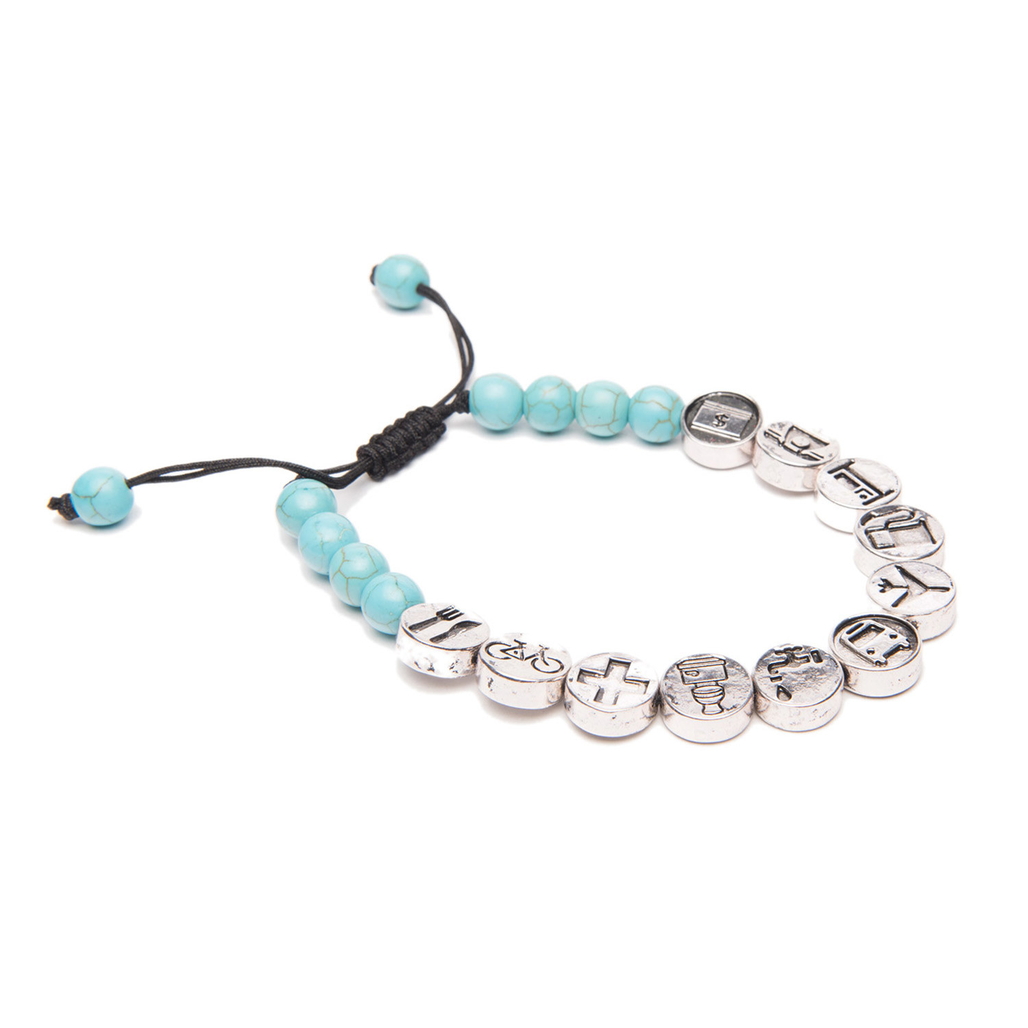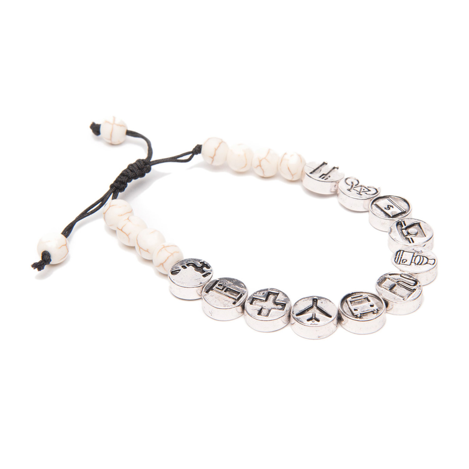 The Hiero Band is a band of beautiful stones and universal metal icons that transmit a message. As we travel, we use devices, books, or the hope of others to understand us to get what we usually need. The Hiero Band is for the moments when your phone is dead, books aren't around and nobody can understand you. Now you can communicate your basic needs without a word: eleven essential icons cover Money, Travel, Phone, Medical, Water, Bike, Food, Bus, Bathroom, Bed/Shelter, and Gas.