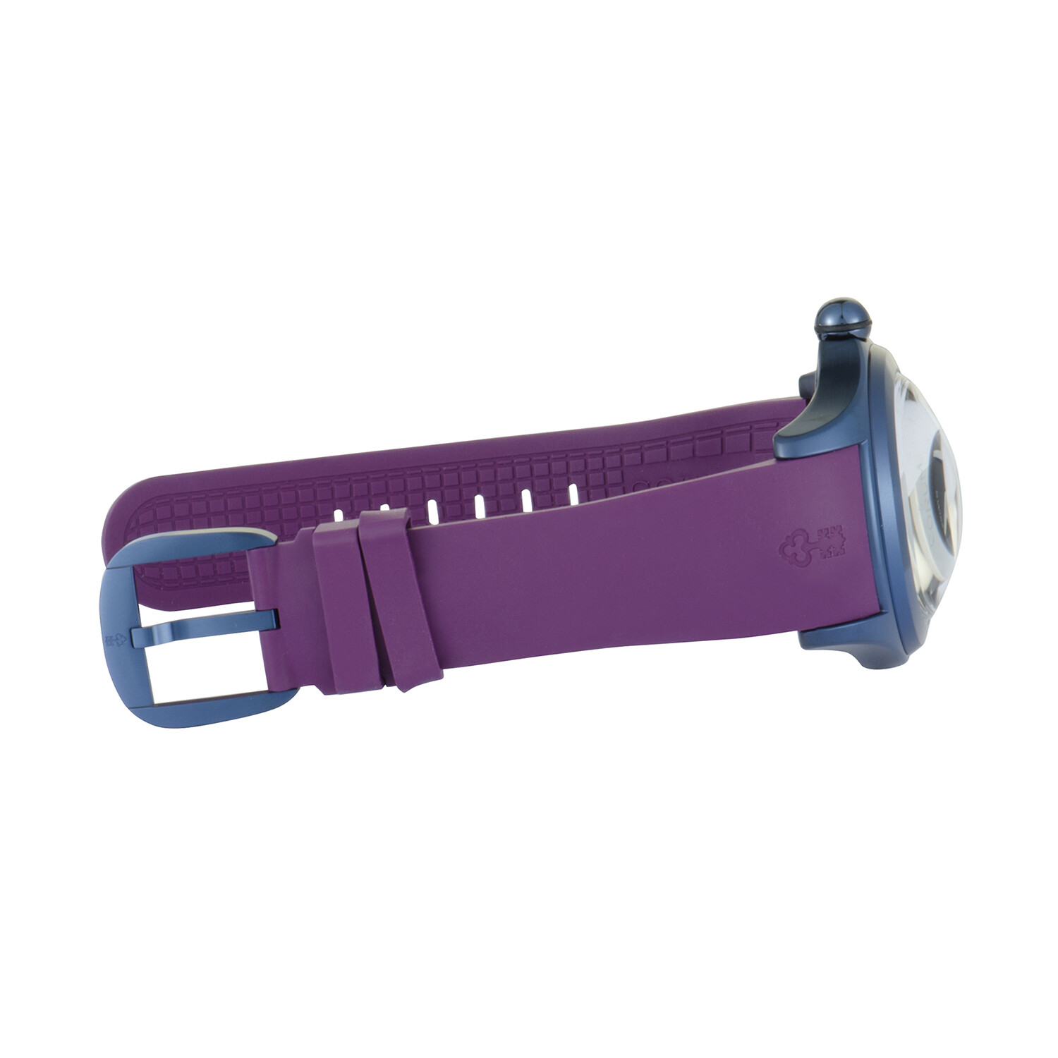 This watch is equipped with the CO 082 automatic movement that contains 21 jewels, beats at 28,800 vibrations per hour, and offers power reserve of 42 hours. The movement is housed inside of a blue PVD-coated stainless steel case, and it is visible through the transparent case back. The case is presented on a purple rubber strap fitted with a tang buckle. Upon the dial, hours, minutes and seconds are indicated via three central hands. The watch is water-resistant to 100 meters.