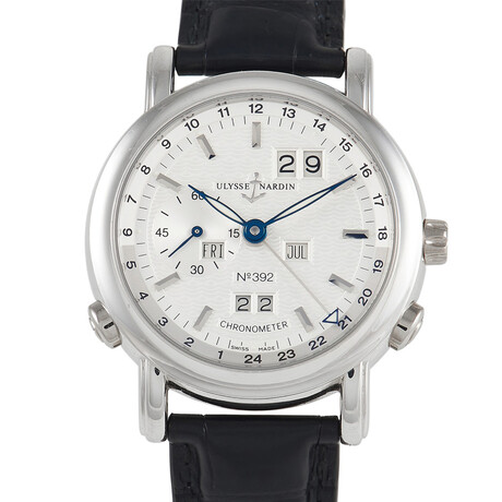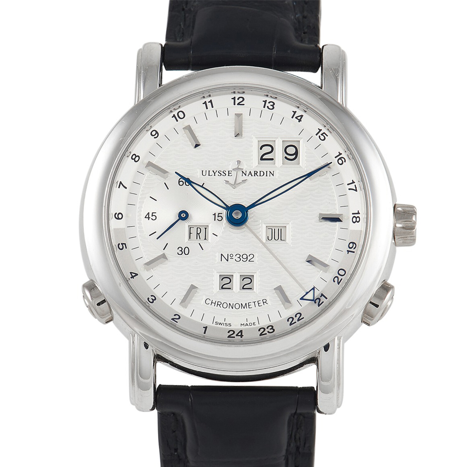 This Ulysse Nardin Big Date GMT Perpetual Platinum Watch 329-80 is offered in pre-owned condition inclusive of the manufacturer's box and papers.