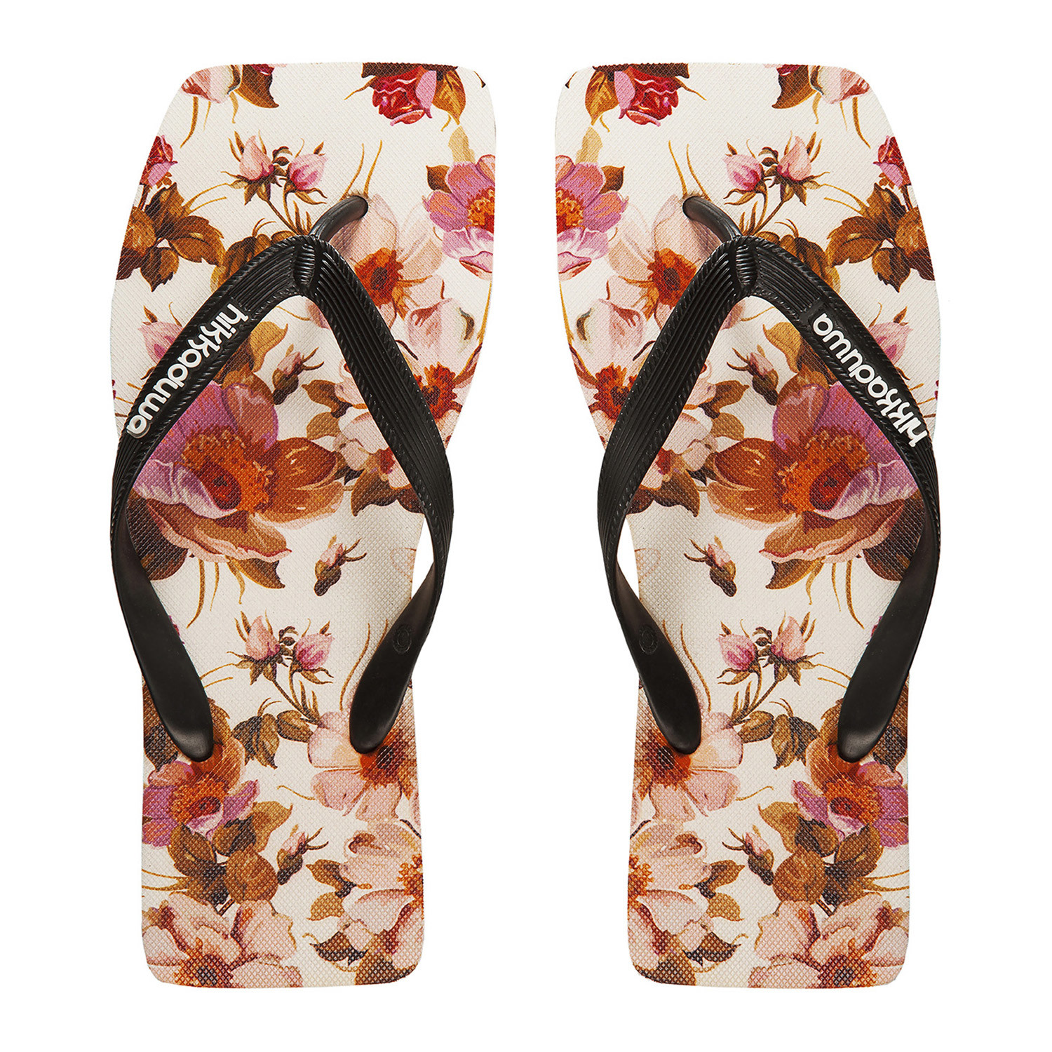 FLOWERS line flip flops. Made of 100% recyclable natural rubber. Squared shape for a revolutionary design. Equipped with anti-slip plant.