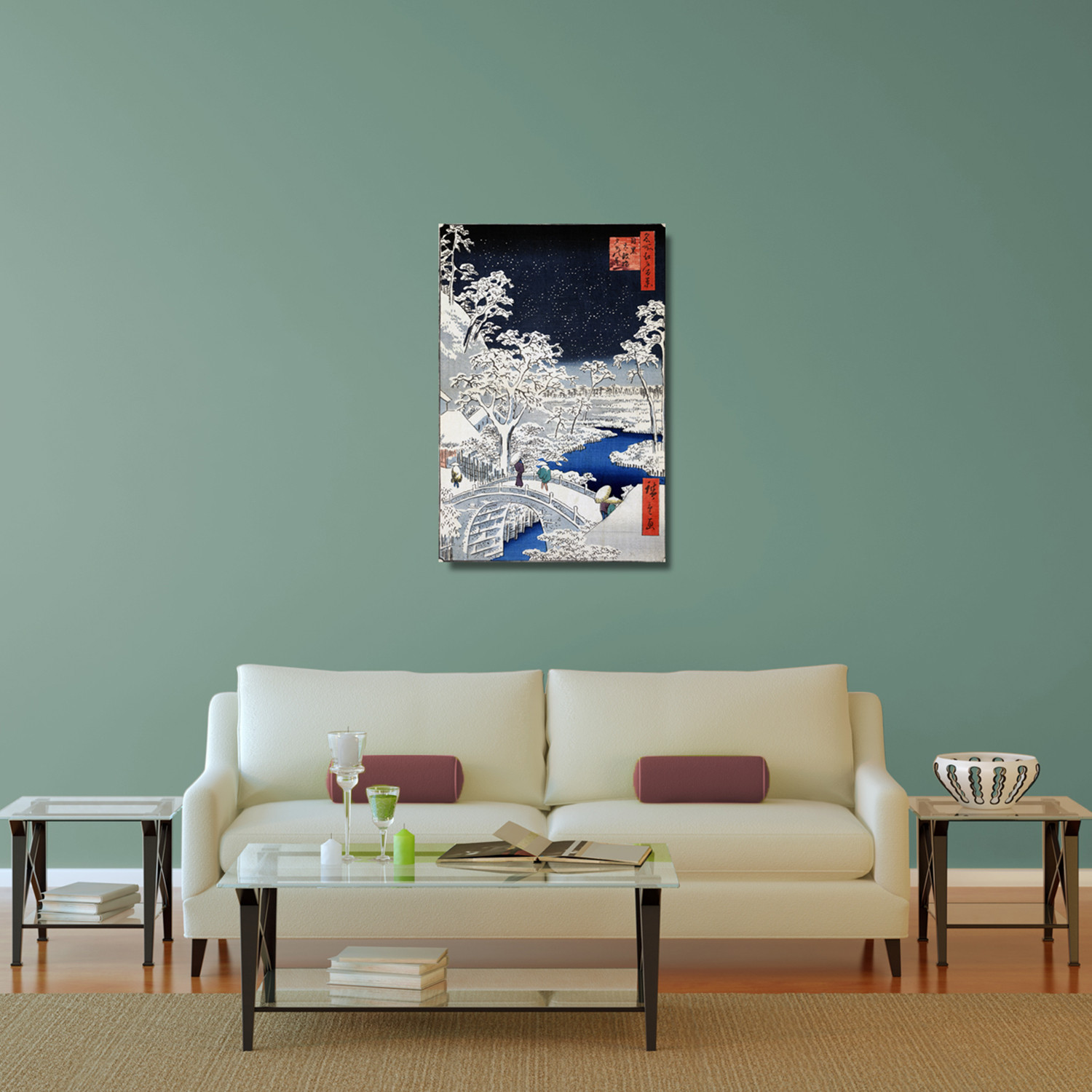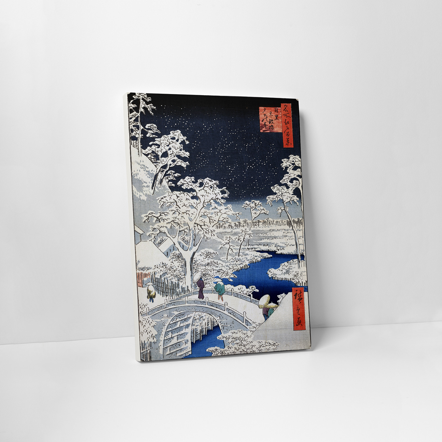 One of over 8,000 works produced by the master Hiroshige, Drum Bridge At Meguro is one of the more famous of his master prints. Created in a dreamlike style that evokes memories of an ancient Japan, this print has been stretched on gallery-quality canvas over natural wood, and arrives ready to hang.