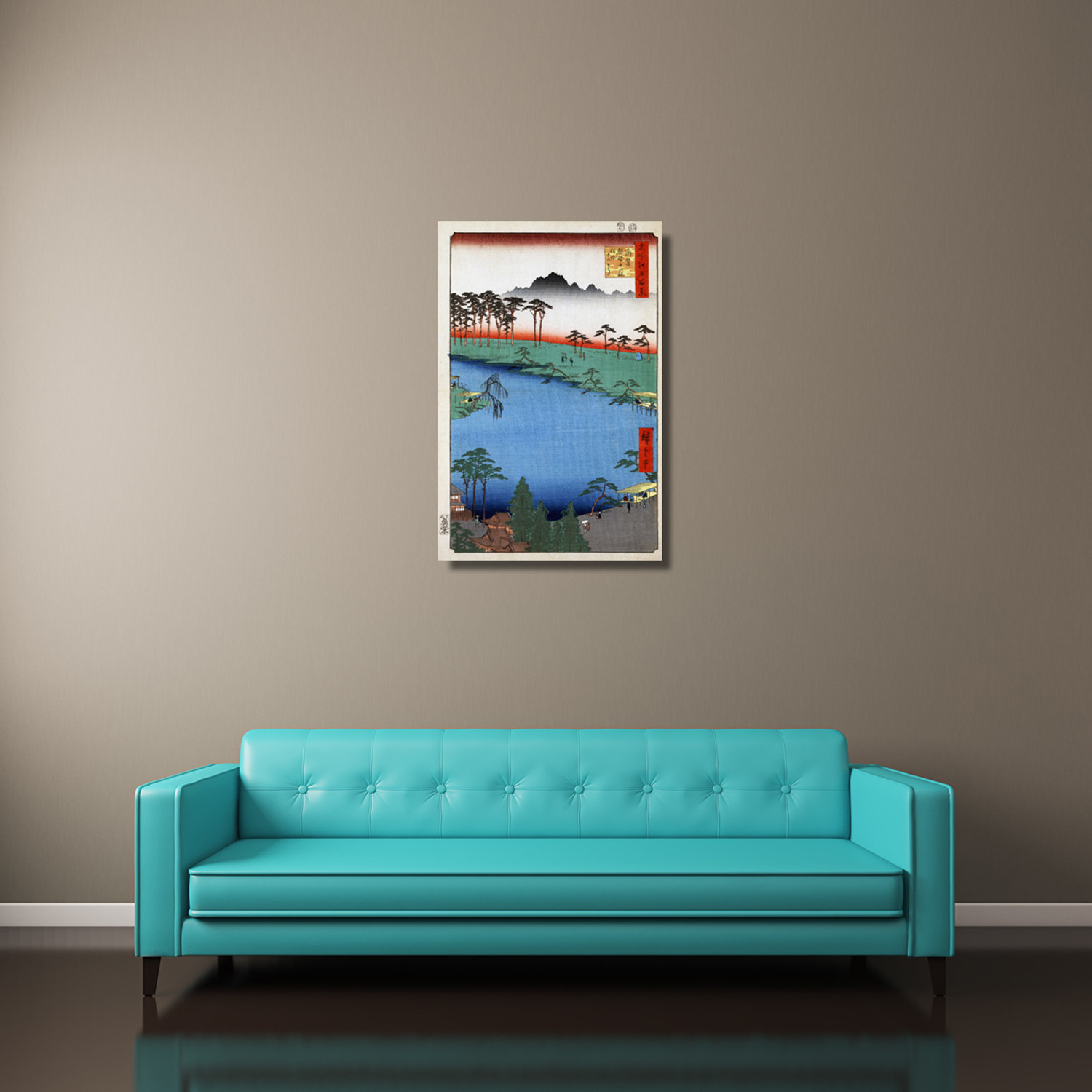 One of over 8,000 works produced by the master Hiroshige, Kumanojunisha Shrine is one of the more famous of his master prints. Created in a dreamlike style that evokes memories of an ancient Japan, this print has been stretched on gallery-quality canvas over natural wood, and arrives ready to hang.