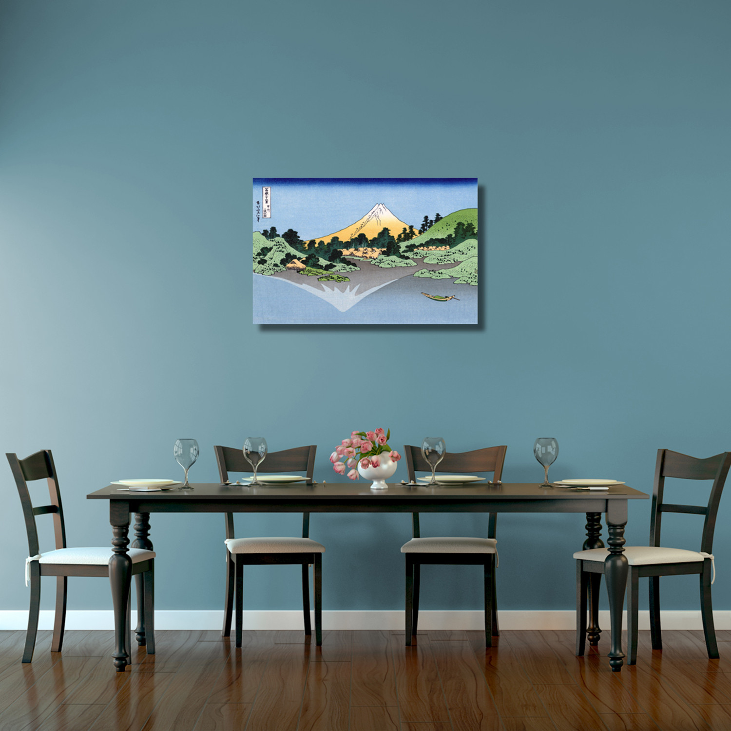 One of over 8,000 works produced by the master Hiroshige, Mt. Fuji Reflection is one of the more famous of his master prints. Created in a dreamlike style that evokes memories of an ancient Japan, this print has been stretched on gallery-quality canvas over natural wood, and arrives ready to hang.