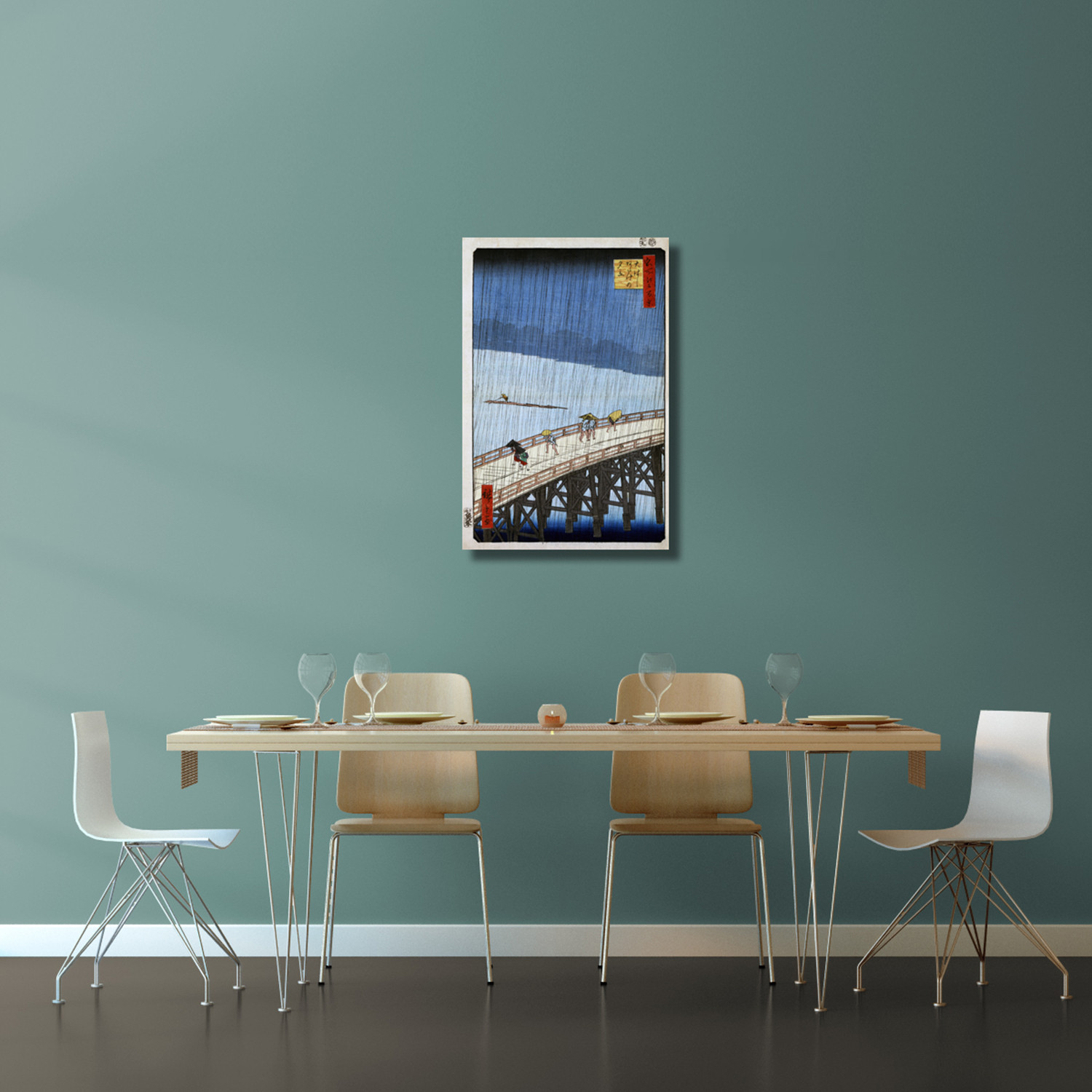 One of over 8,000 works produced by the master Hiroshige, Rain At Bridge is one of the more famous of his master prints. Created in a dreamlike style that evokes memories of an ancient Japan, this print has been stretched on gallery-quality canvas over natural wood, and arrives ready to hang.