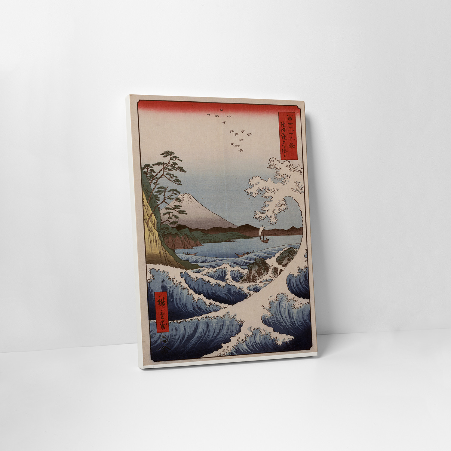 One of over 8,000 works produced by the master Hiroshige, The Sea Off Satta is one of the more famous of his master prints. Created in a dreamlike style that evokes memories of an ancient Japan, this print has been stretched on gallery-quality canvas over natural wood, and arrives ready to hang.