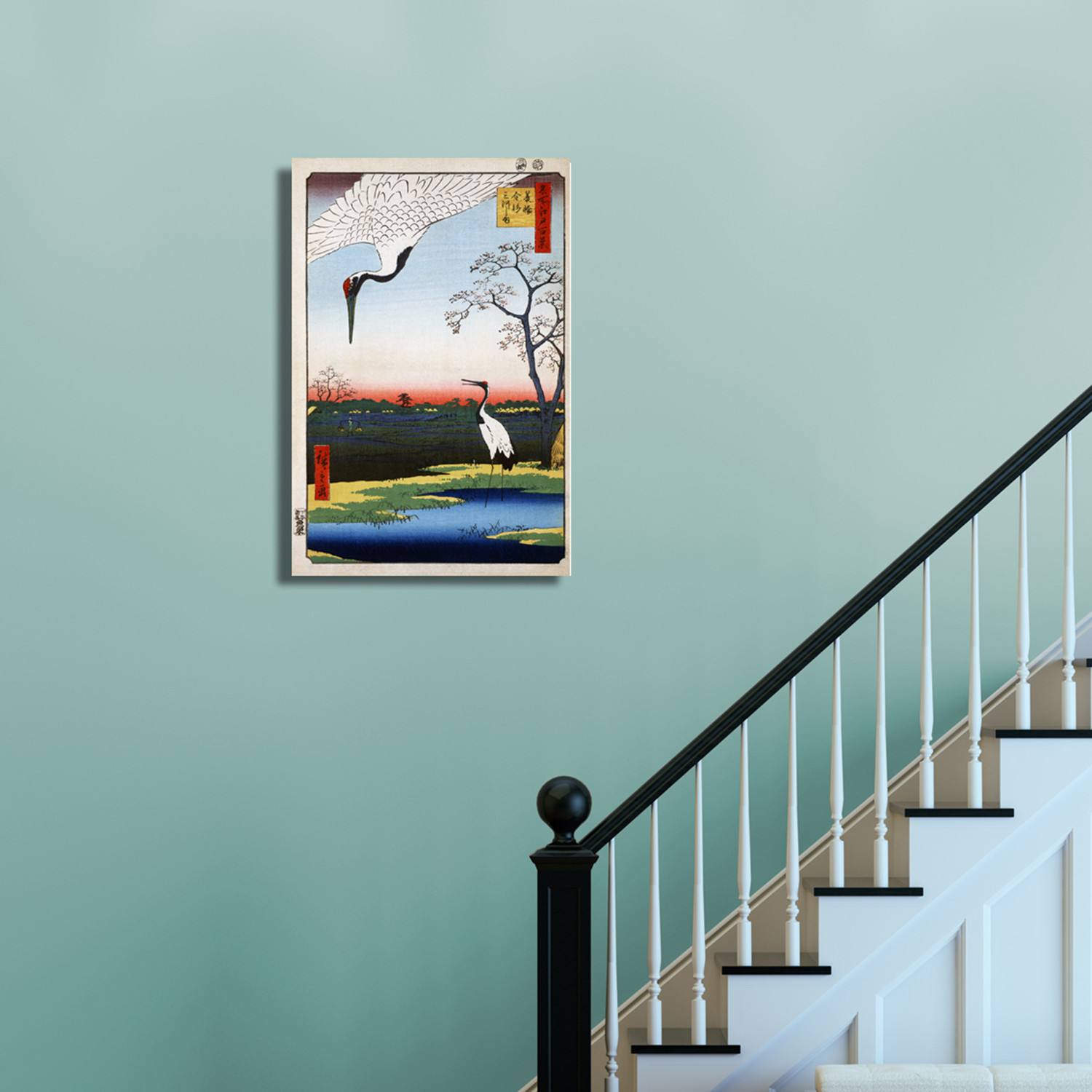 One of over 8,000 works produced by the master Hiroshige, Two Cranes is one of the more famous of his master prints. Created in a dreamlike style that evokes memories of an ancient Japan, this print has been stretched on gallery-quality canvas over natural wood, and arrives ready to hang.