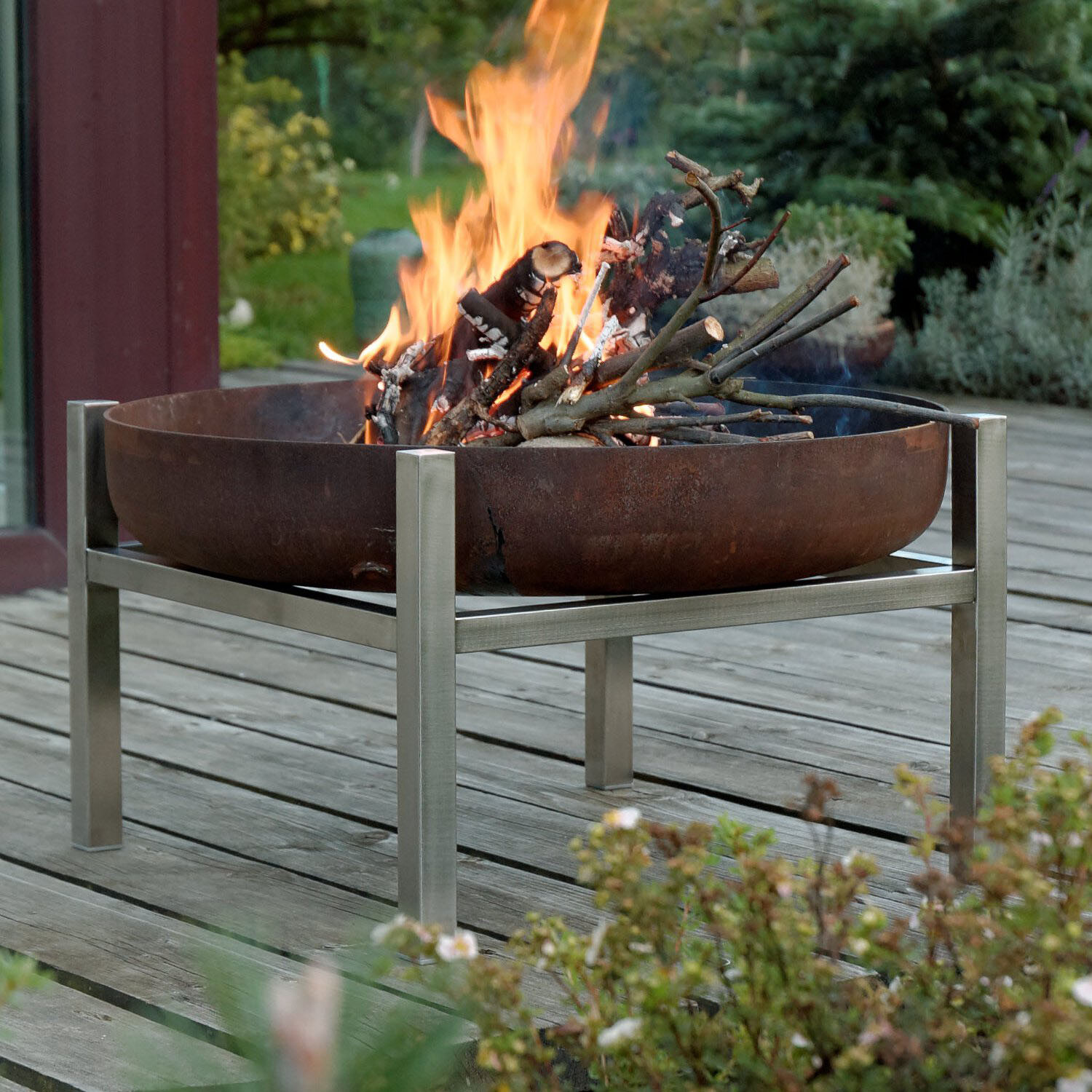 This outdoor fire feature is crafted from a mix of durable stainless steel and carbon steel that will develop a nice patina over time. The bowl is made from solid rusting (carbon) steel and it arrives looking very shiny, almost chrome-like. It will rust once exposed to water. Usually, this natural process takes couple weeks.
