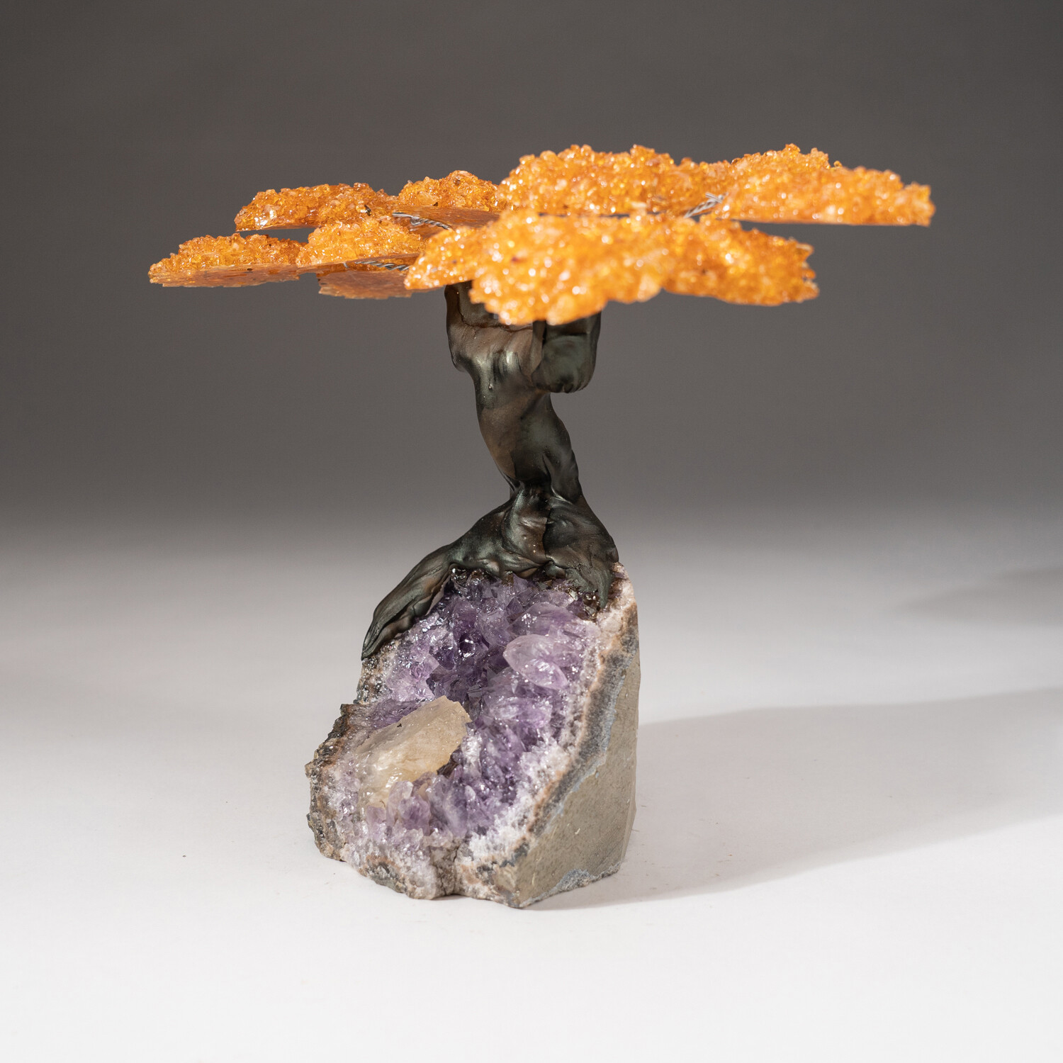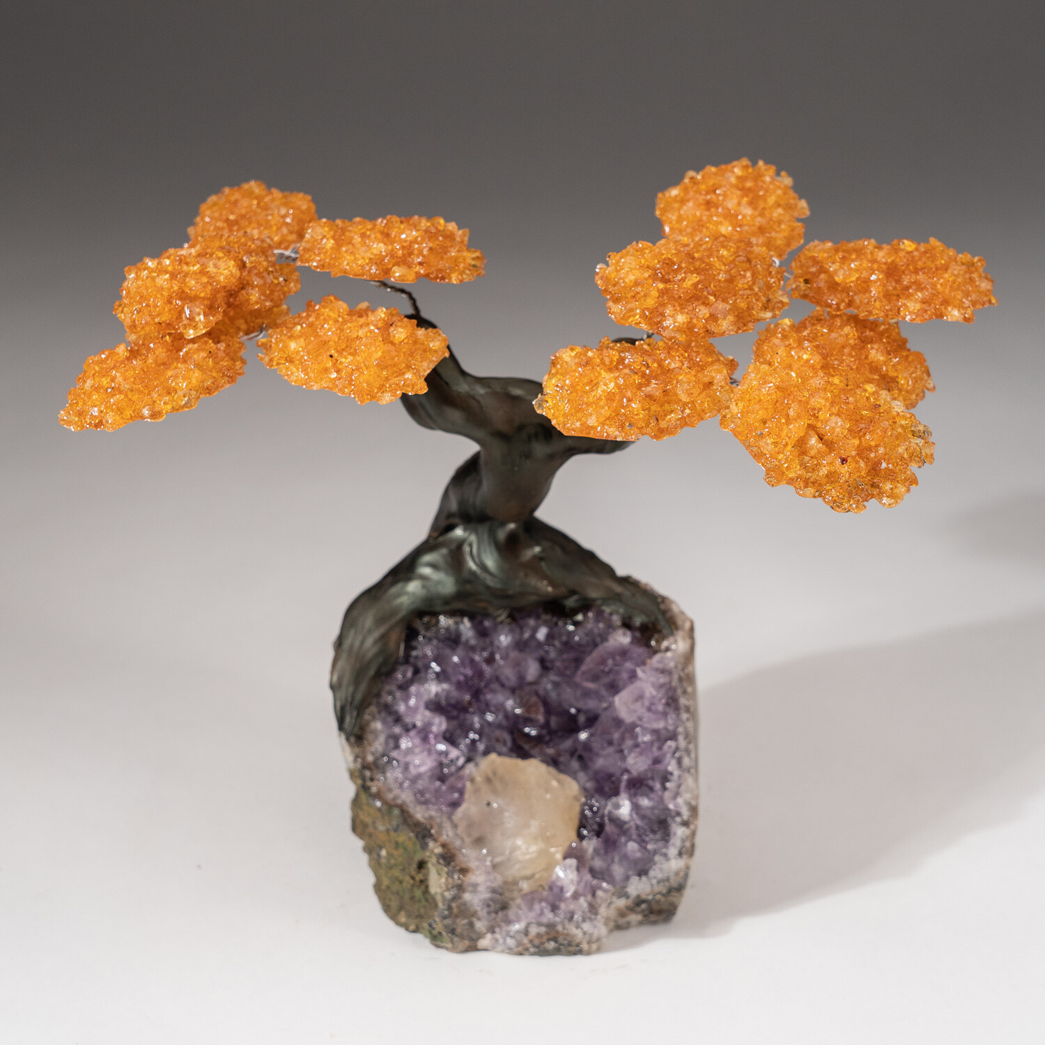 The Money Tree is a custom, genuine Citrine clustered gemstone tree with a faux tree trunk set on an Amethyst crystal cluster lined matrix. Handmade in Brazil, the Money Tree makes for a great gift or beautiful display item in any room.