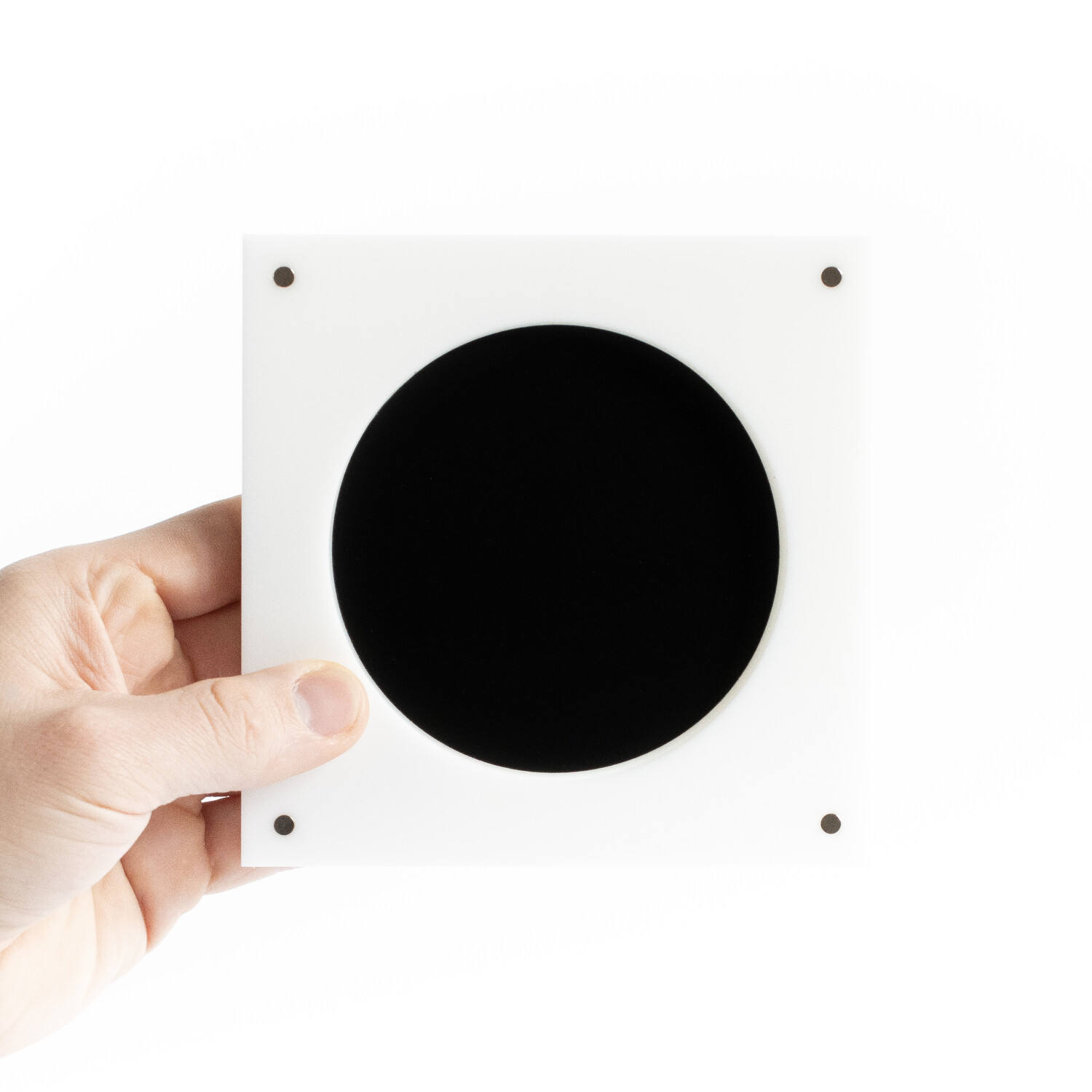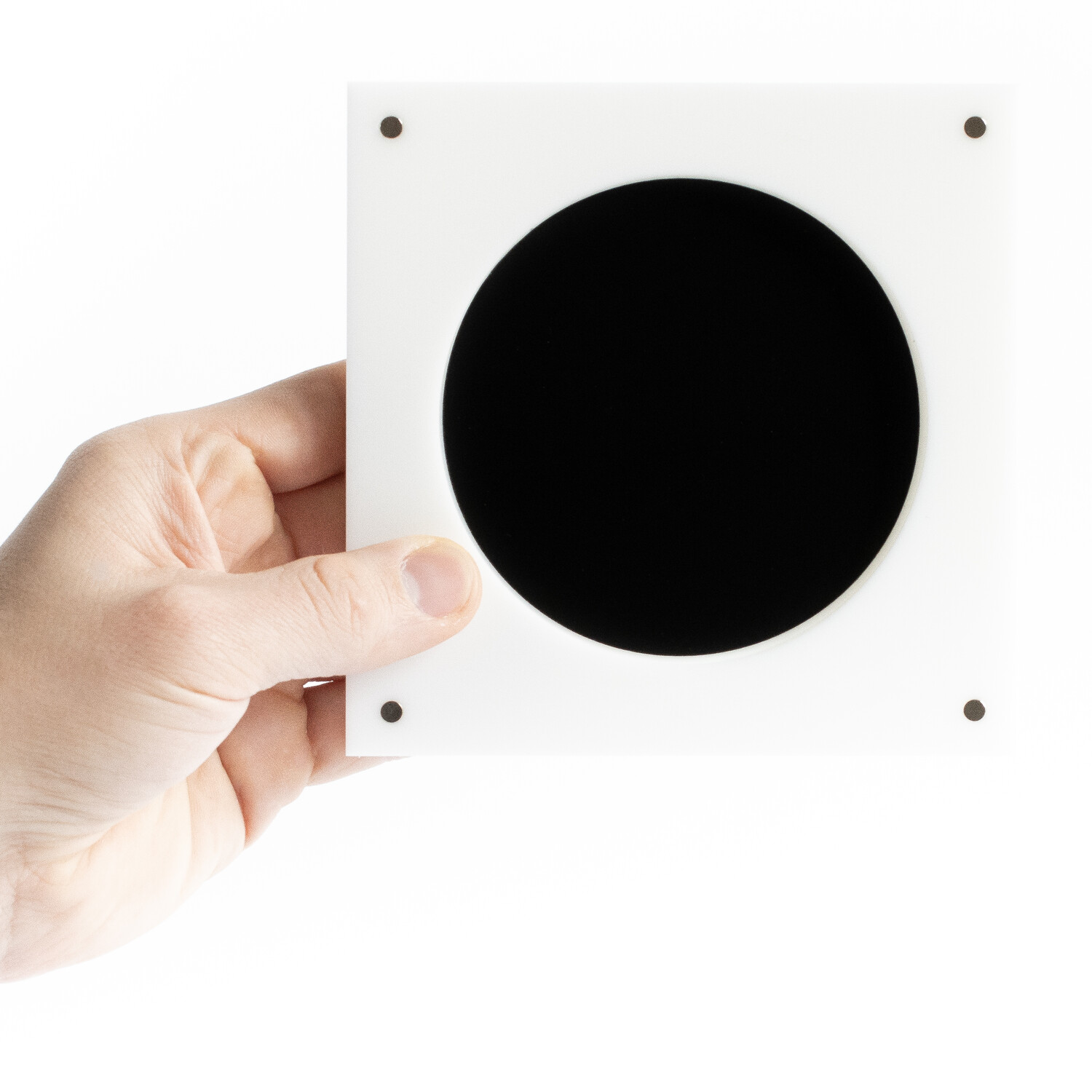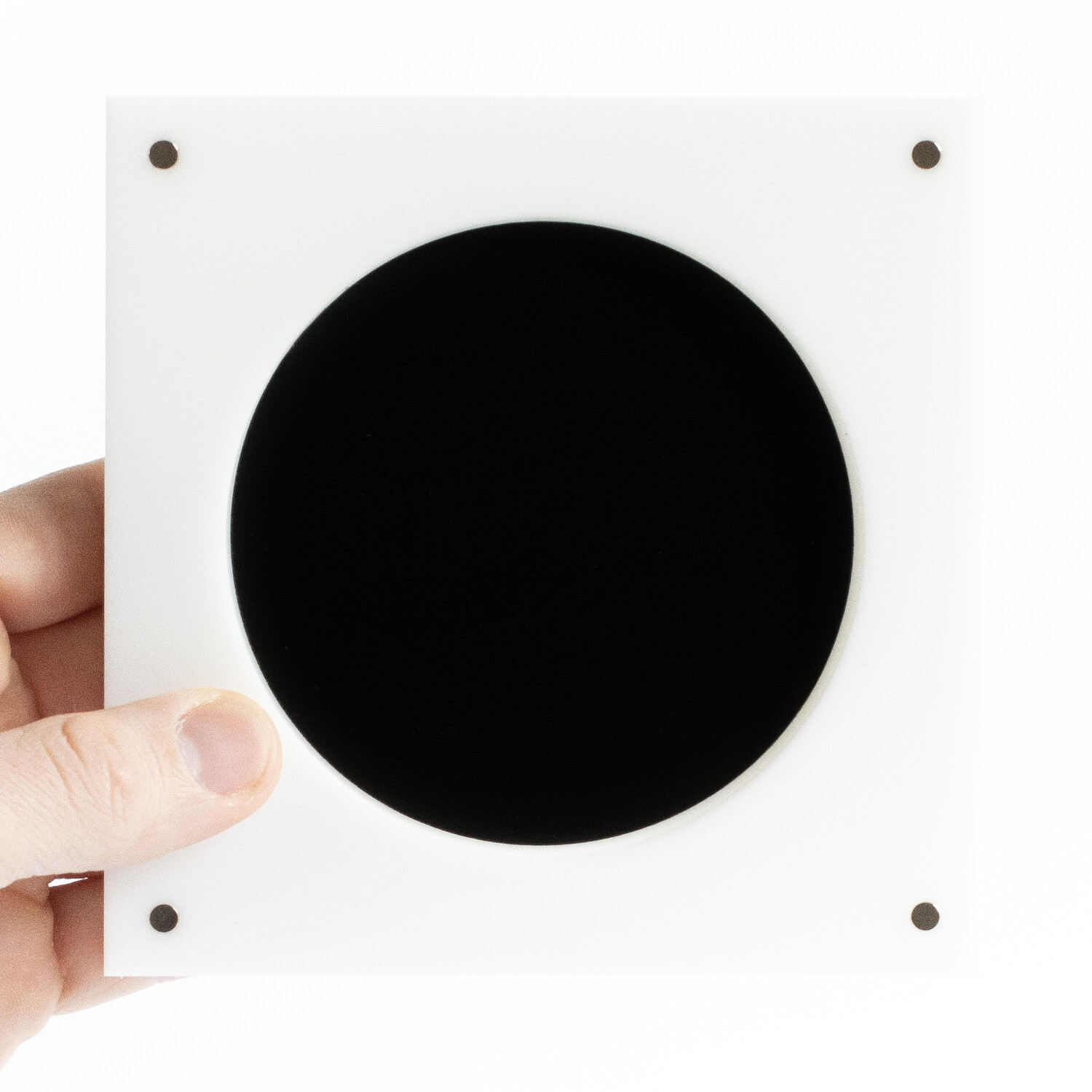 The black area consists of a nanoscale array grown on a specially etched aluminum substrate using a chemical deposition process. The shape and arrangement of molecules within this array allows it to trap the vast majority of incoming photons and then radiate that energy out in the form of heat, rather than light. The array comes fixed in a transparent acrylic display case featuring a transparent, removable magnetic lid.