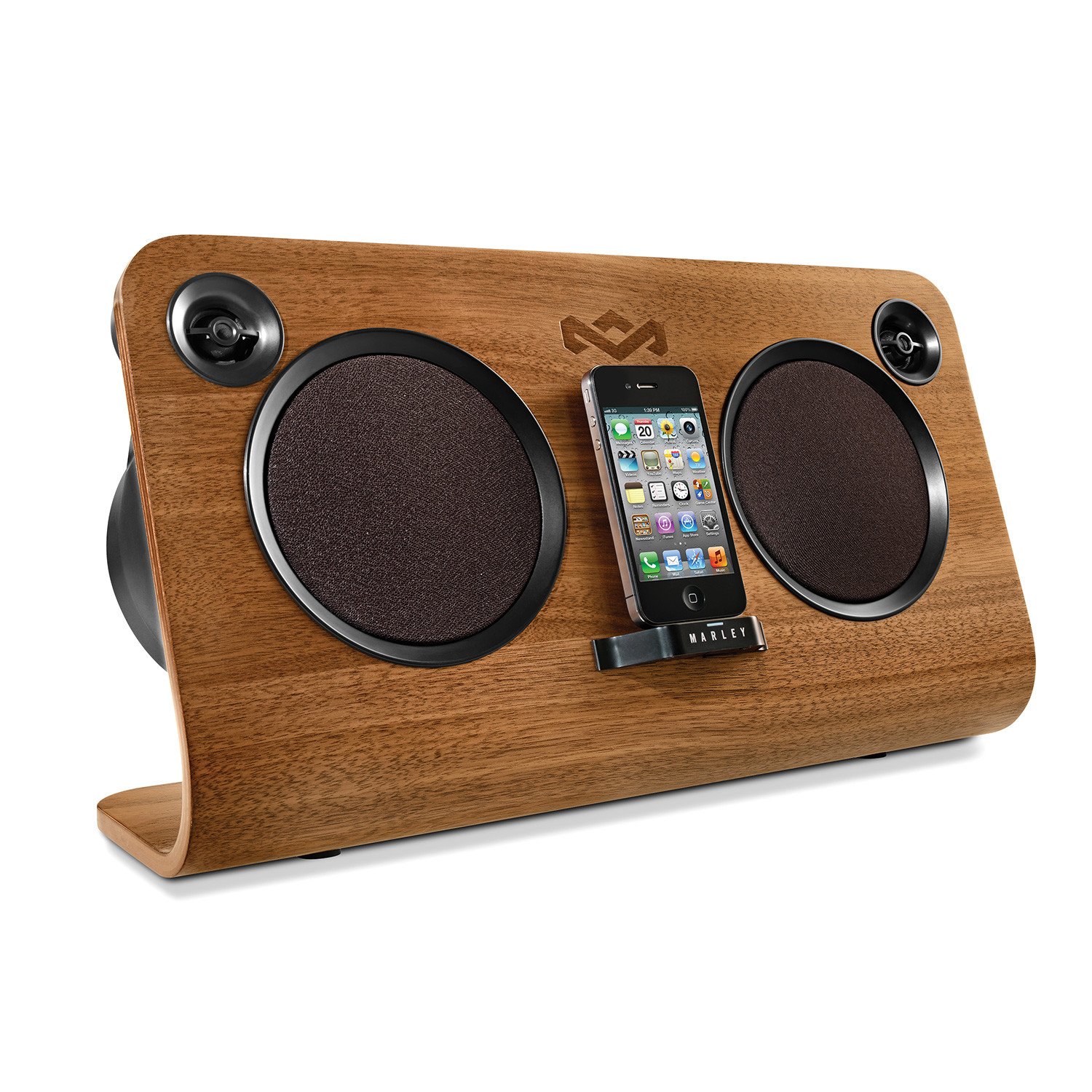 This premium audio system for iPod, iPhone and iPad features 4.5” high-output woofers, 1” high-definition tweeters and a powerful amplifier providing room-filling bass and realistic mids and highs. The soulfully crafted Get Up Stand Up audio system can dock and charge your iPhone, iPod and iPad and is engineered to deliver your music with all the power and precision of the original performance. The FSC certified walnut and birch wood frame is as beautiful as it is responsible. Connect hundreds of other devices including phones and music players via the two convenient auxiliary inputs.