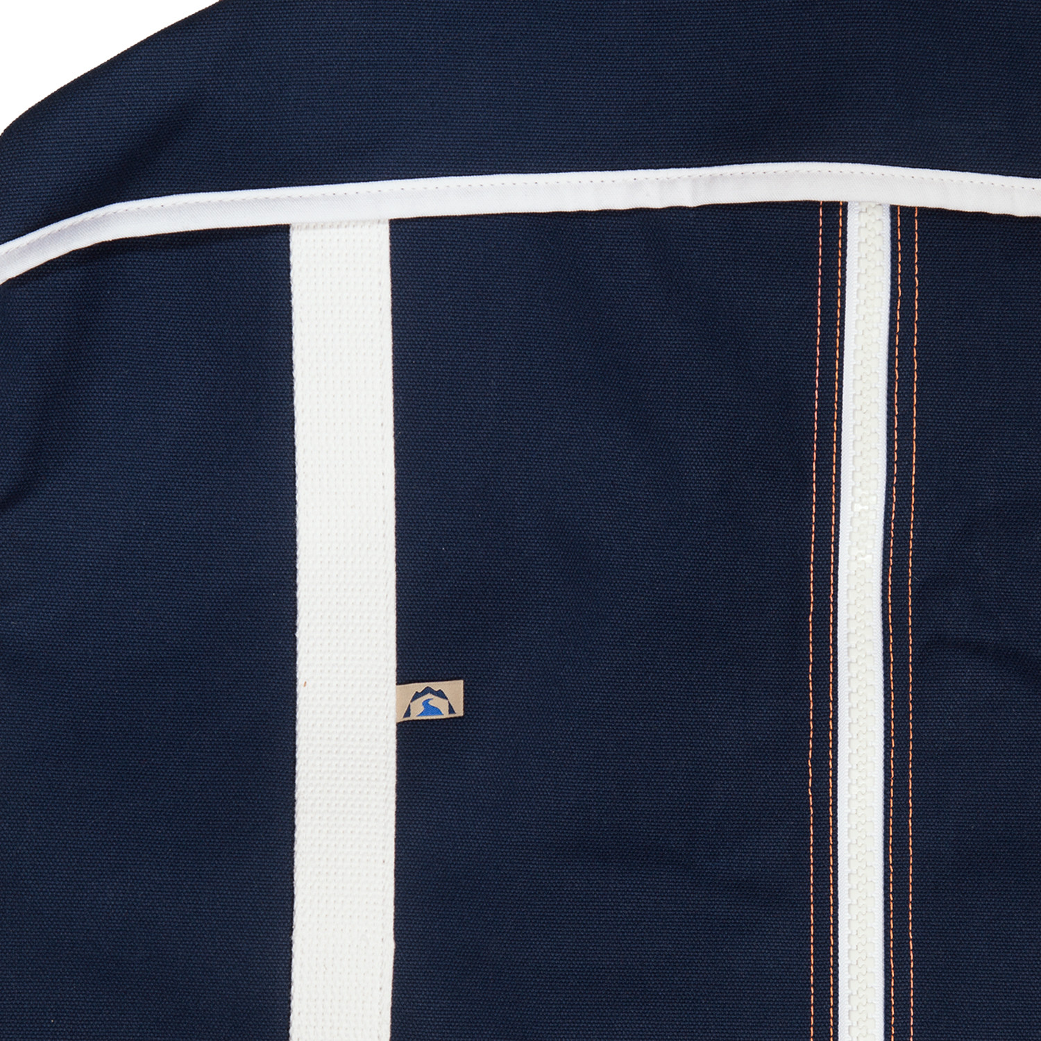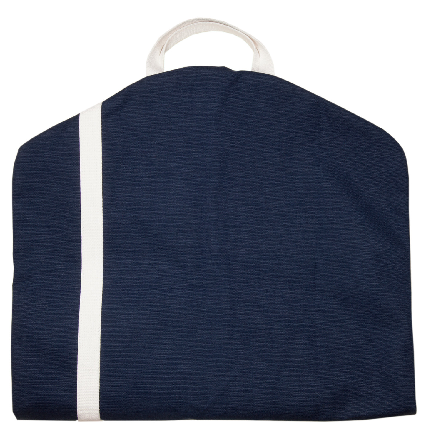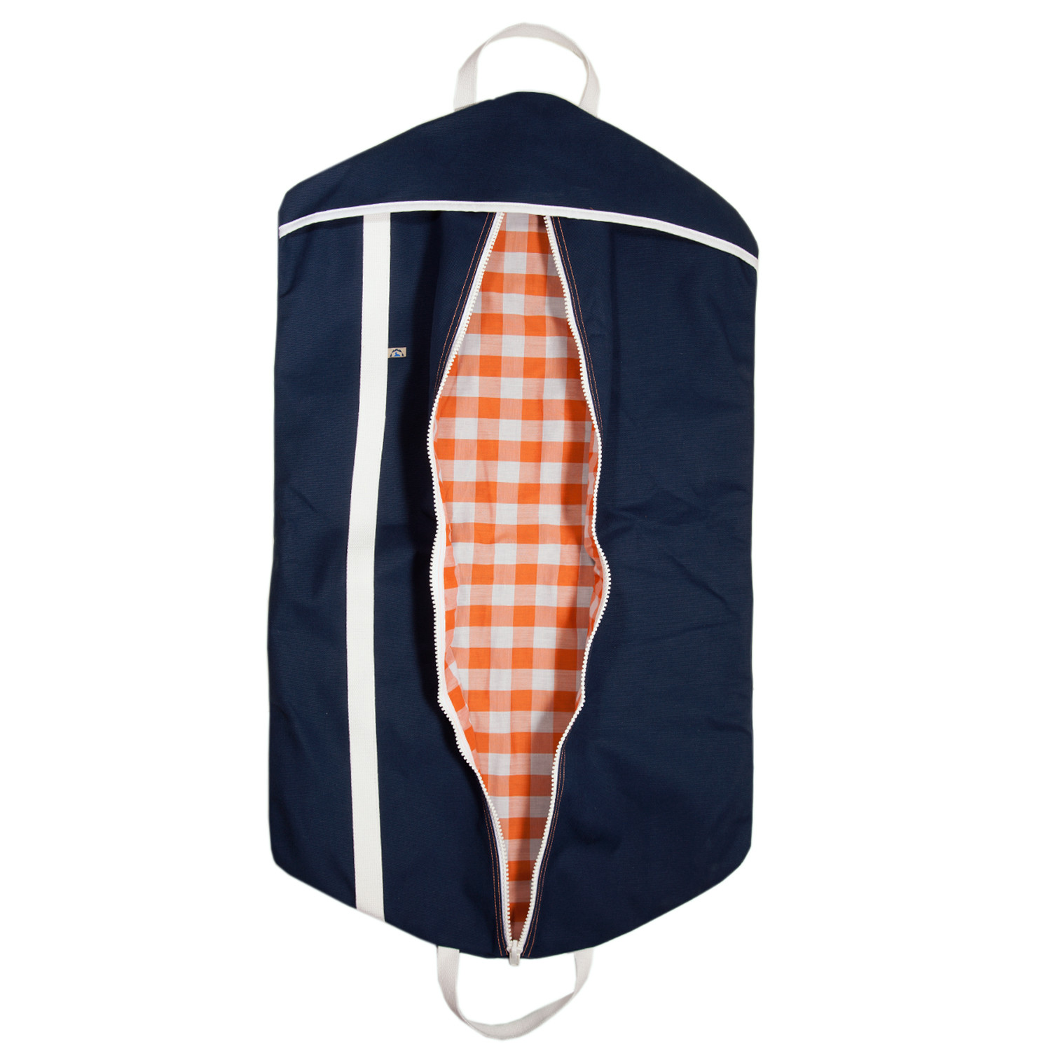 The Niantic Garment Bag consists of heavy-duty midnight navy 18 oz canvas and white accents. The bi-fold construction, heavy webbing handles make carrying simple, and the open top allows for hangers to pass through without having to remove your garments. No detail was overlooked, as each bag features a unique orange and white gingham liner and contrast stitching. This garment bag is the perfect size for keeping a couple suits, shirts and pants wrinkle free.