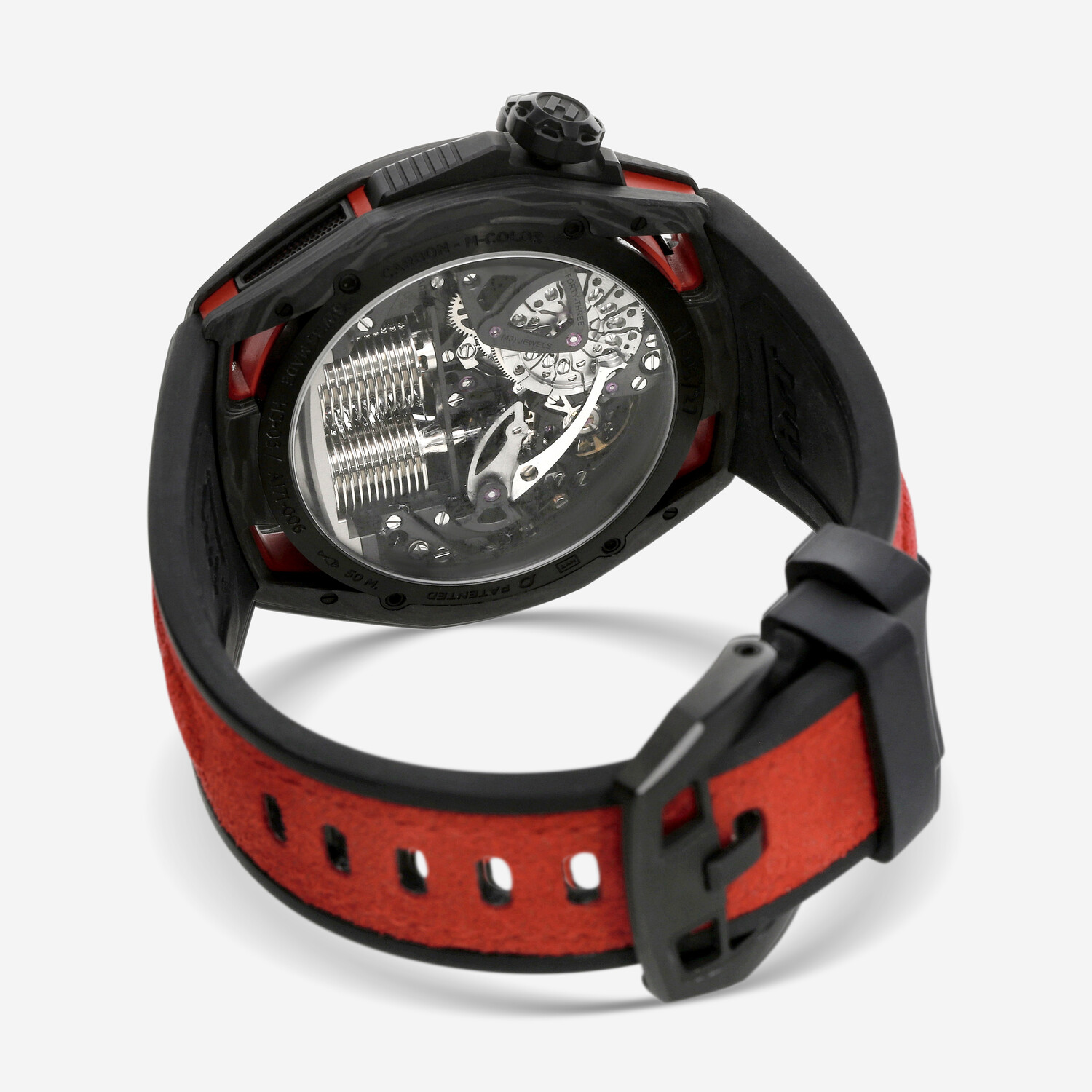 A masterclass in modern horology, the HYT Moon Runner Desert showcases a bold fusion of avant-garde fluid mechanics and masterful artistry. Driven by the manual-winding Calibre 601‑MO with a 72-hour power reserve and 28,800 vph frequency, it indicates time through HYT’s signature fluidic retrograde hours, central minutes hand, and a sculptural 3D moon-phase display—all housed within a striking 48 mm black-coated titanium and carbon case. The sandblasted, DLC-treated surfaces and lumed beige numerals and grids evoke lunar terrain, adding a celestial aesthetic to its bold, technical form. Limited to just 15 pieces worldwide and priced around CHF 125,000 (approx. $140K USD), this timepiece is the epitome of luxury-meets-innovation.
