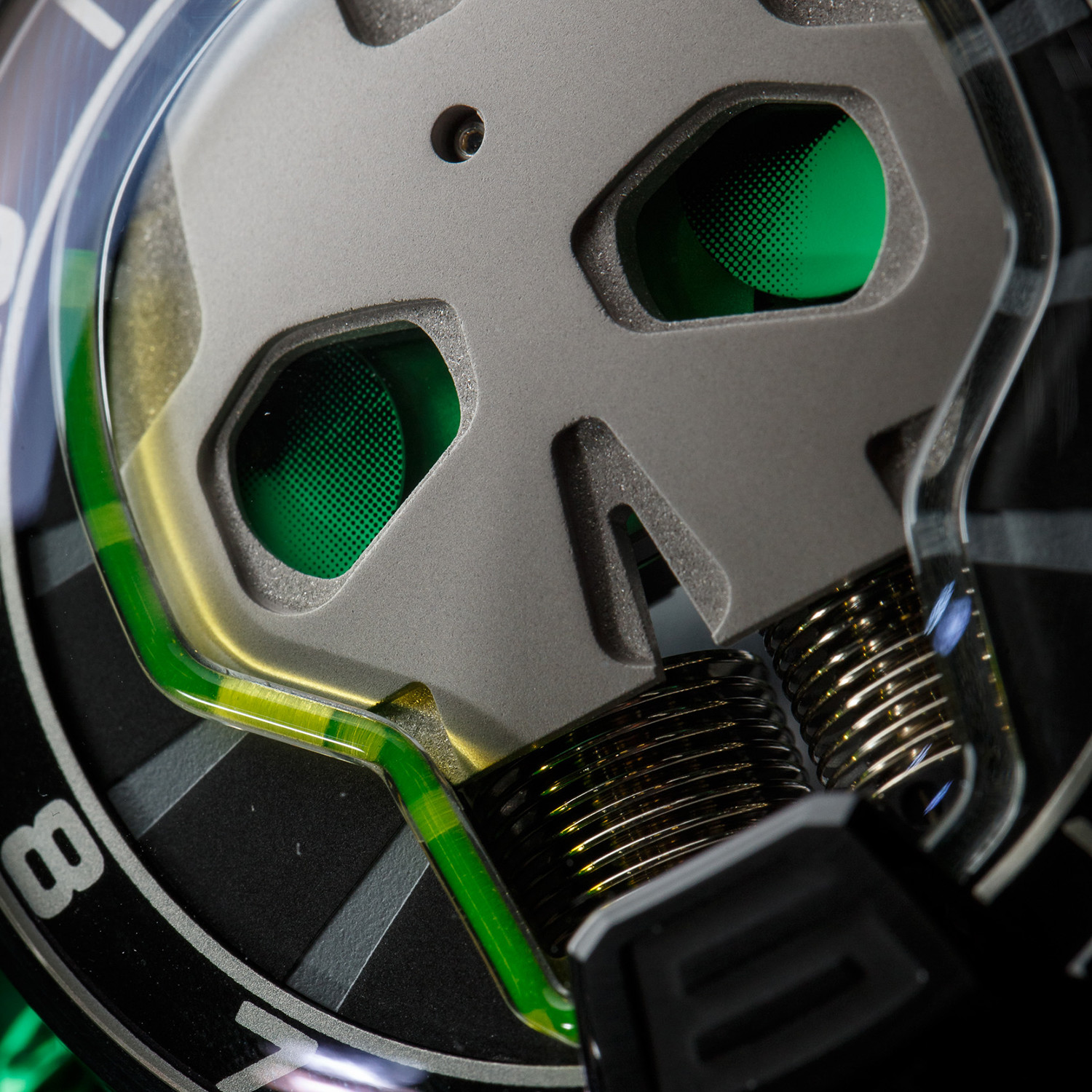 In the HYT SKULL Green Eye, HYT flaunts their mastery over hydro mechanical complications. Less than 1mm in diameter, the patented borosilicate glass capillary tube is carefully bent around the dial's brash skull.