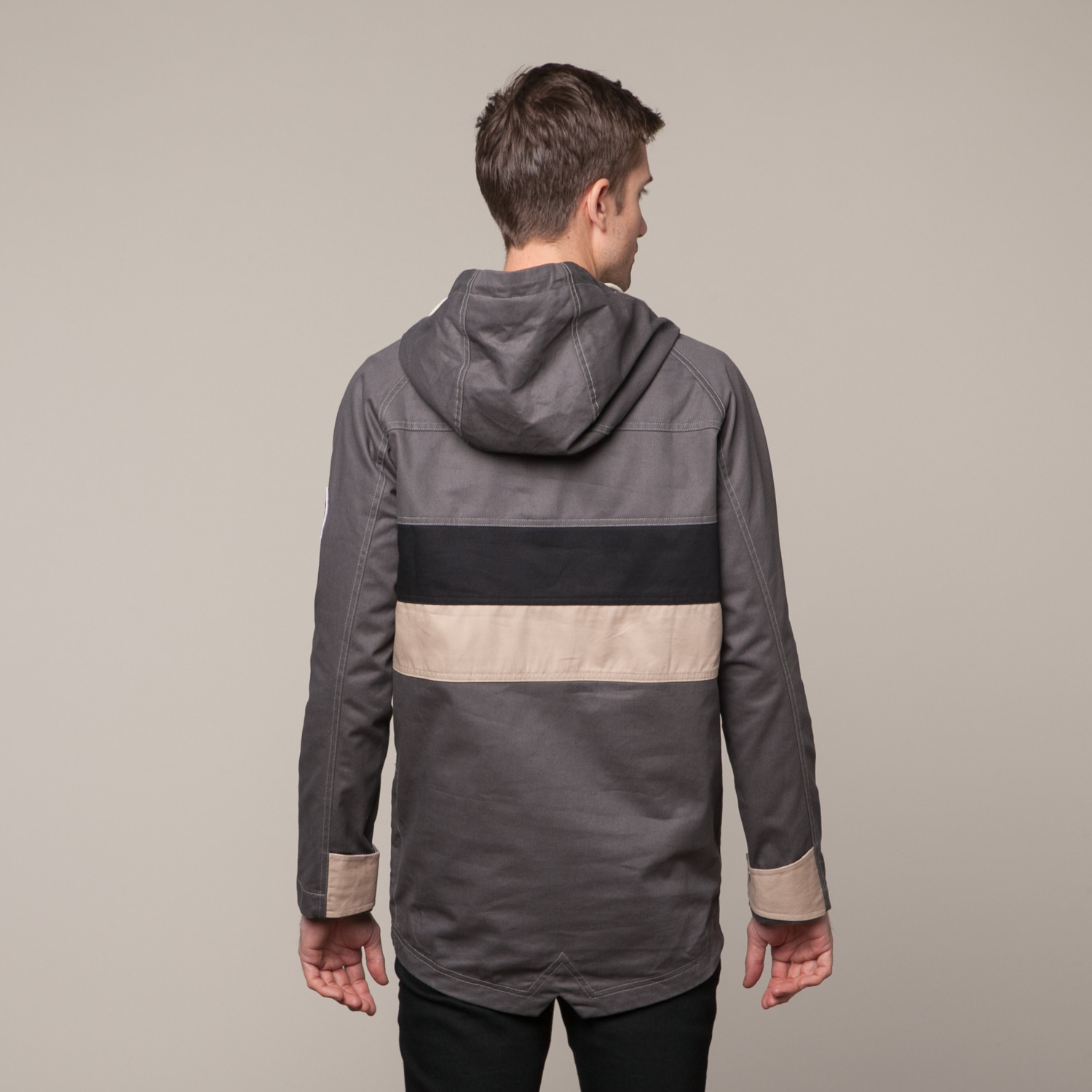 This supremely stylish I Love Ugly Anorak Jacket is as versatile as it is street-ready. Done in a combination of charcoal, black, and beige cotton twill, it features snap front pockets, a side-zipped split, custom embossed snap domes, and hood and waist drawcords. A perfect fit for cold and windy weather, you'll love how you look wearing it.
