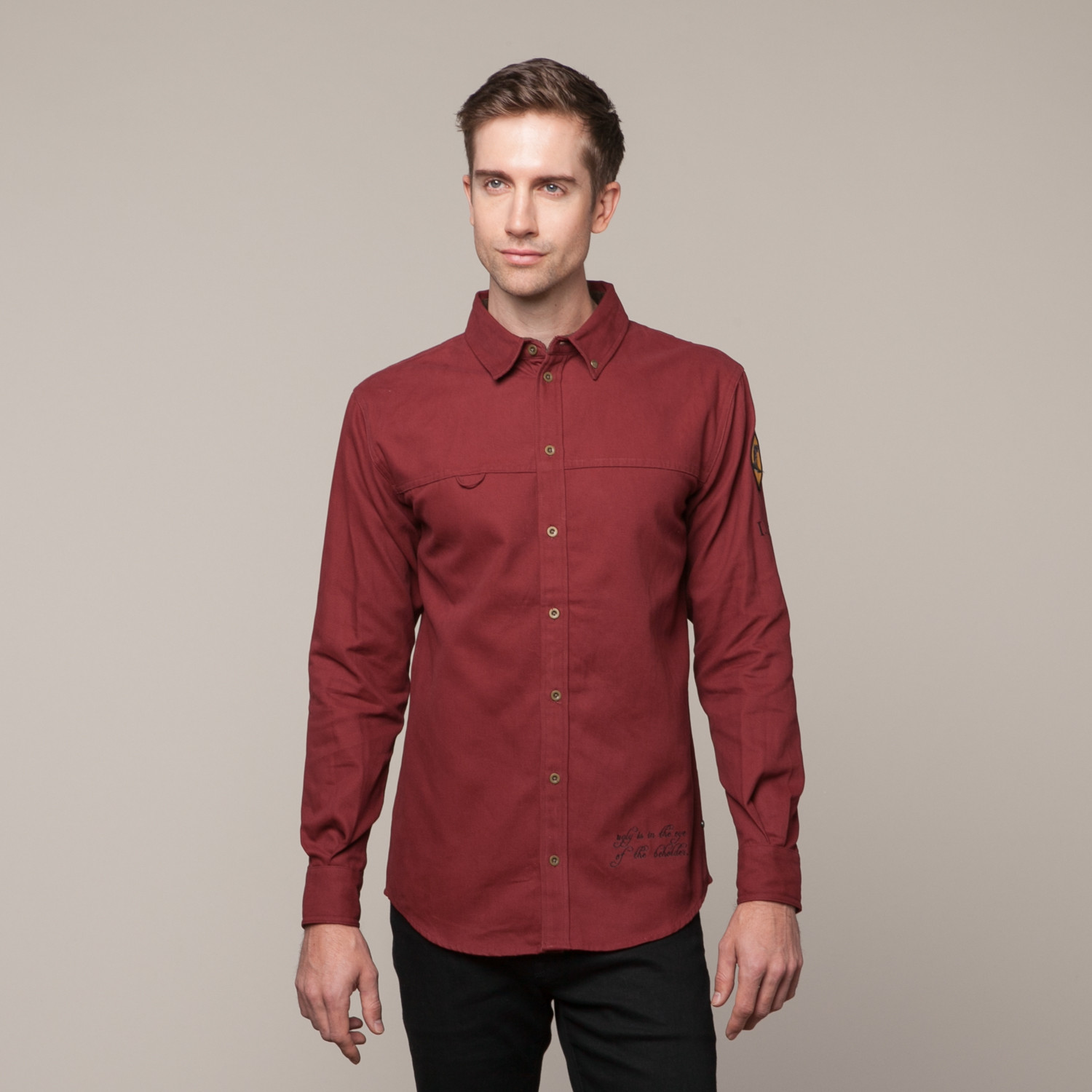 This Maroon Workman Shirt from I Love Ugly is the perfect accessory for Fall. Full of unexpected details, from its metal buttons and contrast corduroy cuff placket to its stylized bear patch on the left arm, just throw it on before you leave and let the compliments roll in.