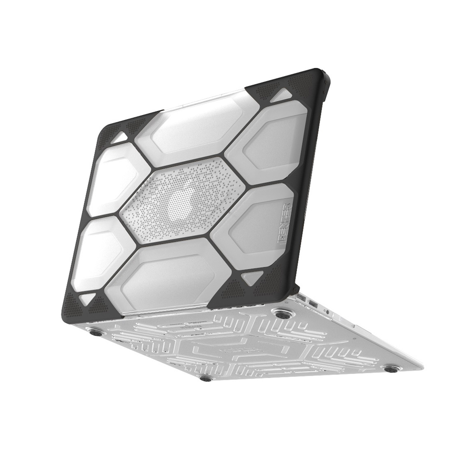 The Hexpact is the world's first MacBook protective case with the ability to dissipate the force of impact. This case is transparent, shows off your laptop's logo and still maintains protection after a drop incident. This engineered design transmits the least amount of impact force, protects corners, and utilizes innovative shock absorbing materials.