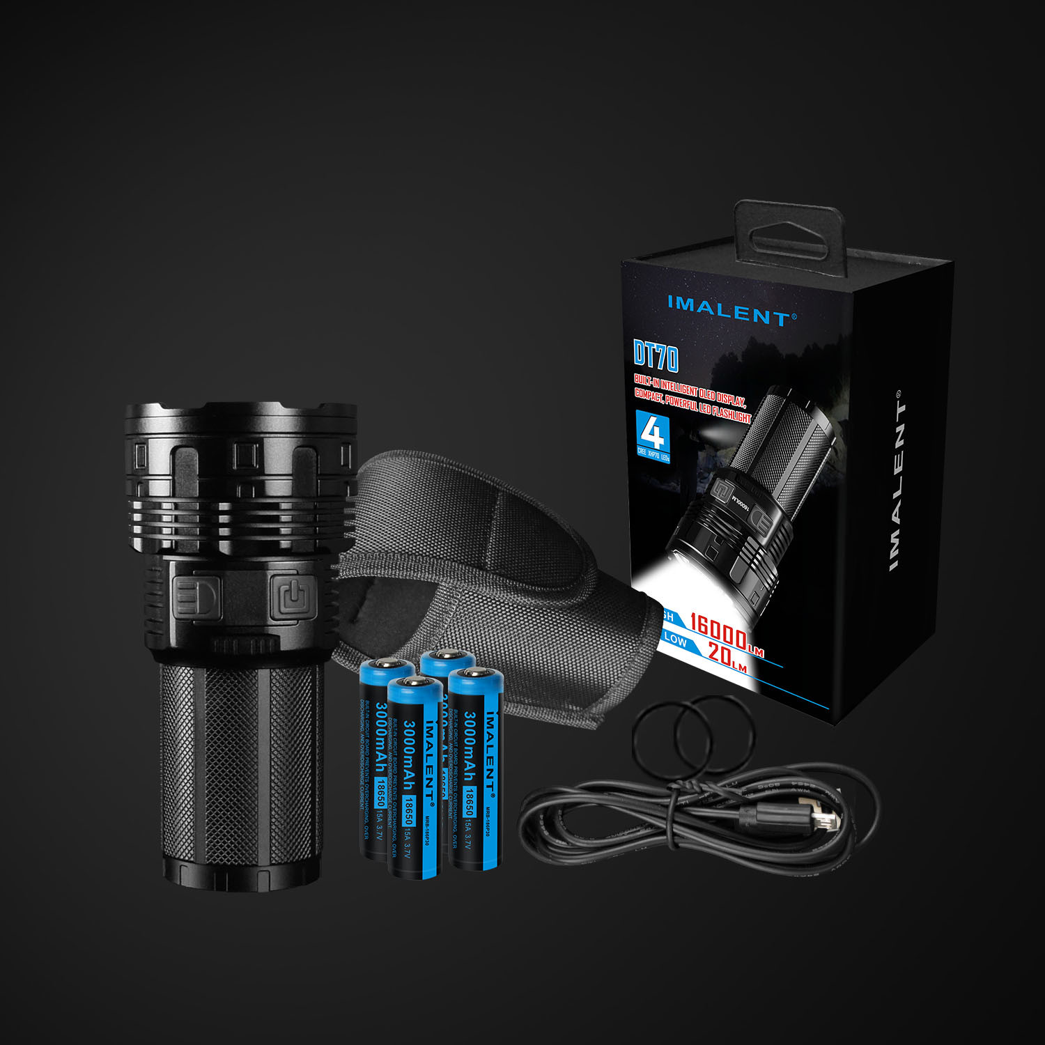 The IMALENT DT70 is a versatile, USB-rechargeable LED tactical flashlight with multi-level output and an OLED display. The OLED display shows the battery voltage, output, charging status, and has a flashing overheat warning, which makes it much easier to know the status of the flashlight. Utilizing the latest CREE XHP70 LED, its aluminum OP reflector helps distribute the beam more evenly, and can output up to 16,000 lumens. There are four output levels, with the tactical-switch button making it easy to operate, and it's supported by 4 IMALENT 18650 Li-ion rechargeable batteries, its advanced temperature control module, low-voltage warning and low-power protection, to make the DT70 the perfect flashlight for any demanding environment.